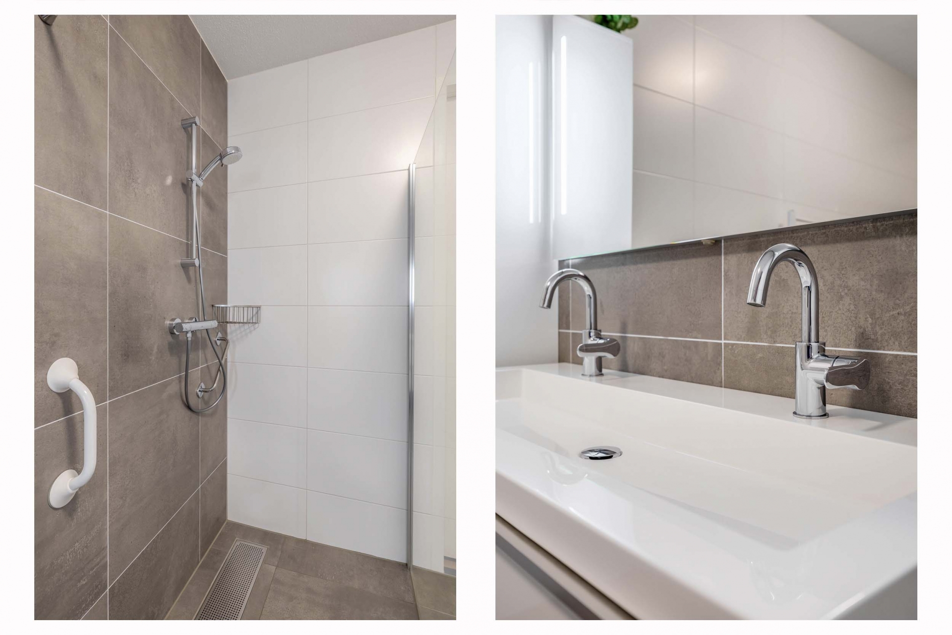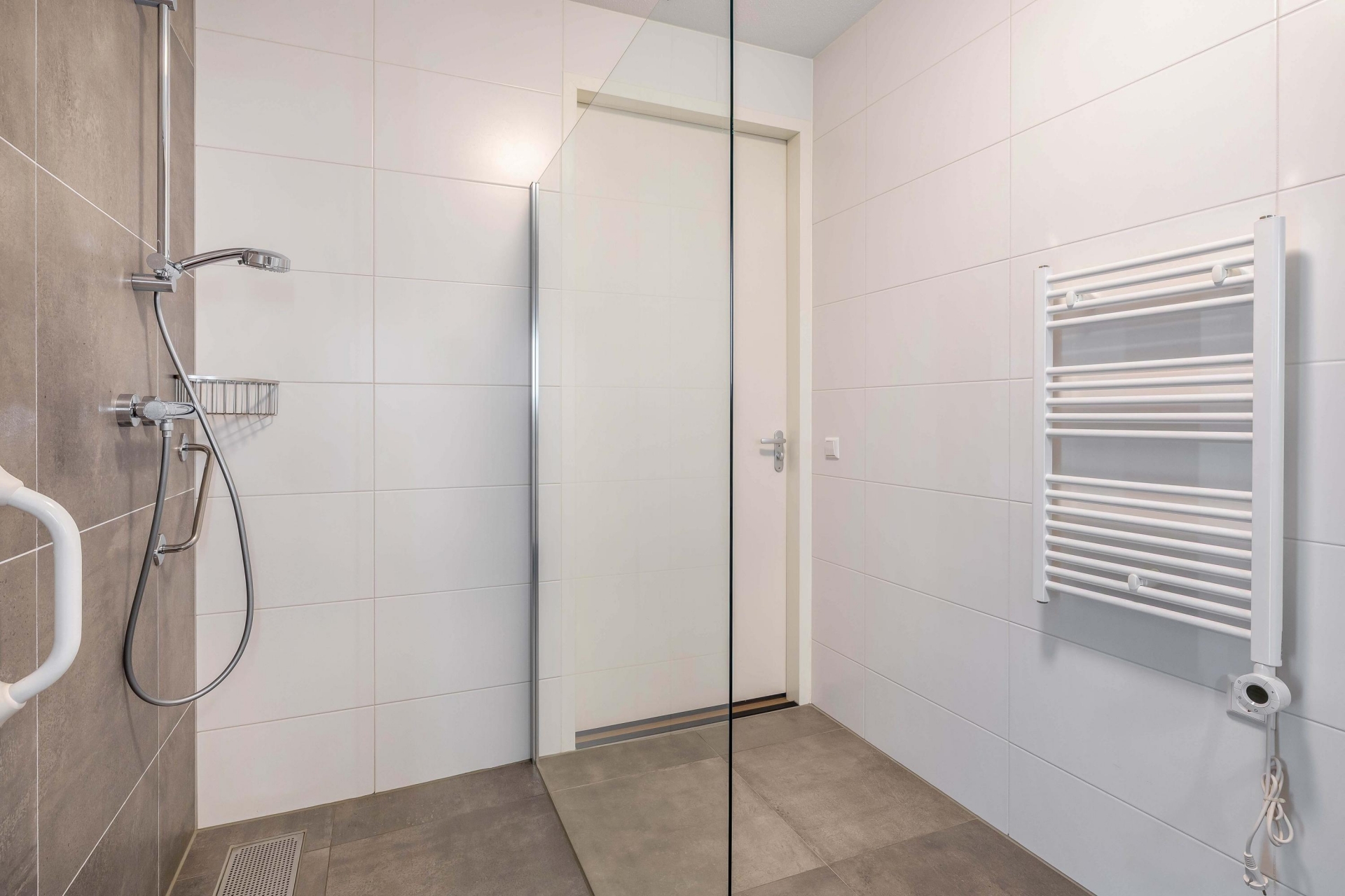 De badkamer is volledig betegeld en beschikt over een inloopdouche en een dubbele badkamermeubel. Ook de badkamer is voorzien van vloerverwarming!