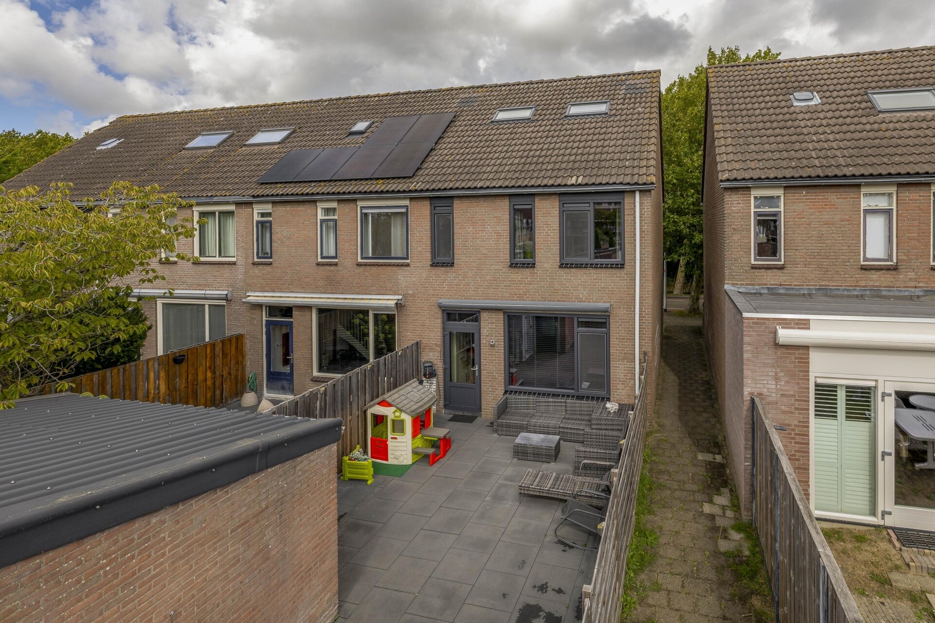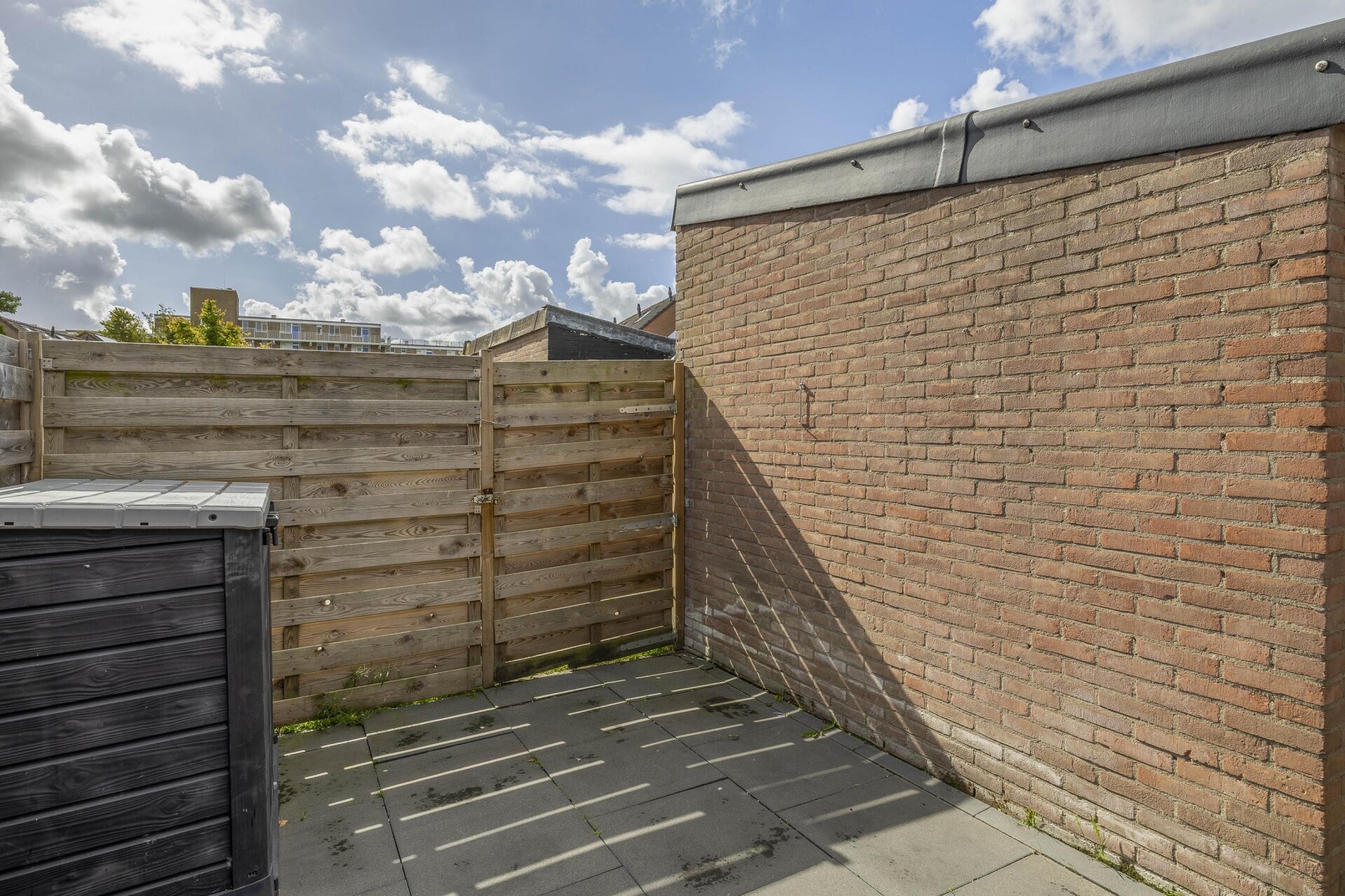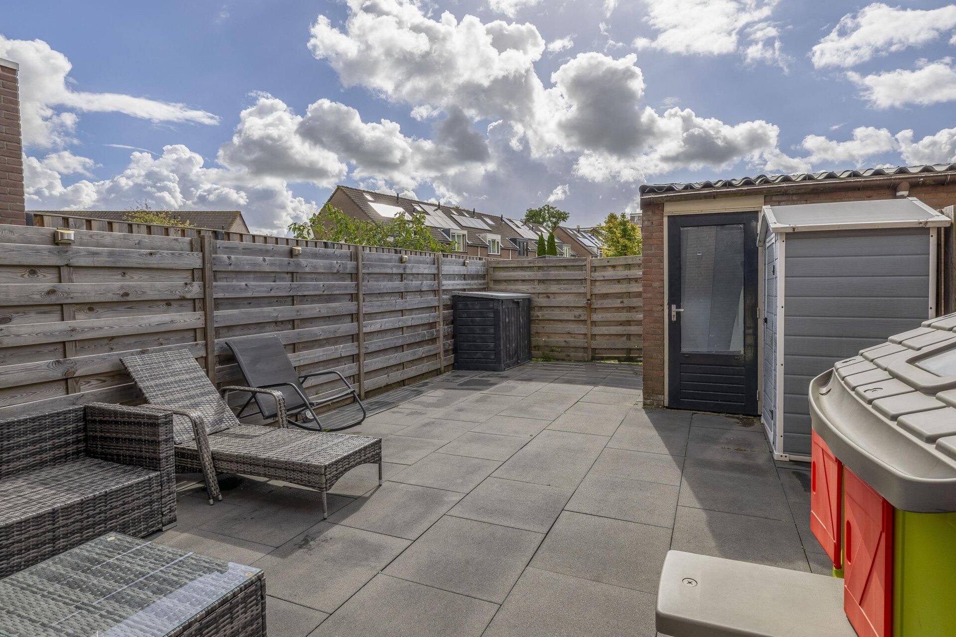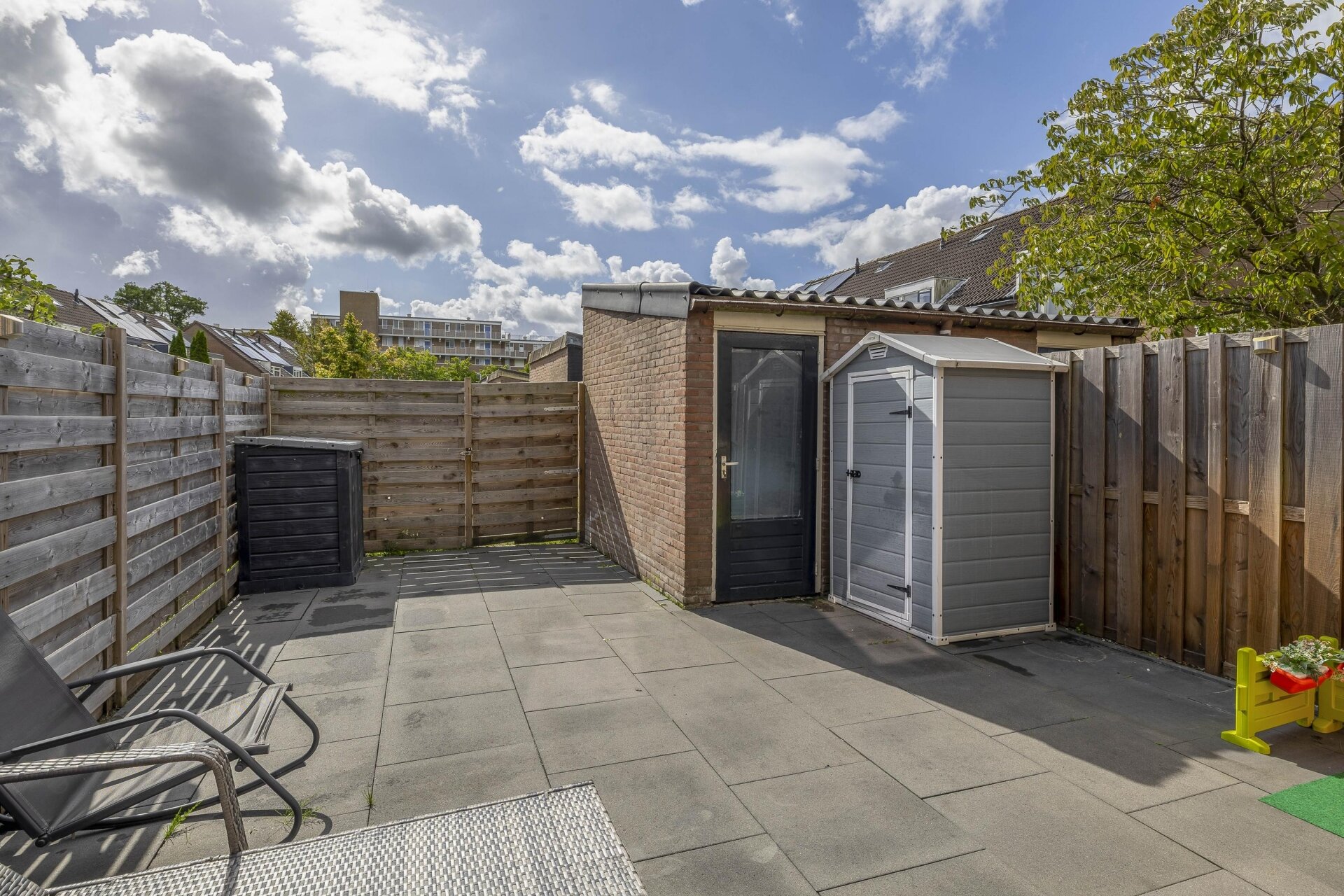 De achtertuin ligt op het zuiden, dus je kunt hier vrijwel de hele dag van de zon genieten. De tuin is onderhoudsvriendelijk aangelegd met grote tegels en biedt genoeg ruimte voor een loungeset of buitenspeelplek. Achterin vind je een stenen berging en een achterom – handig voor de fiets. Aan de voorzijde is er ook een nette voortuin én parkeergelegenheid in de straat.