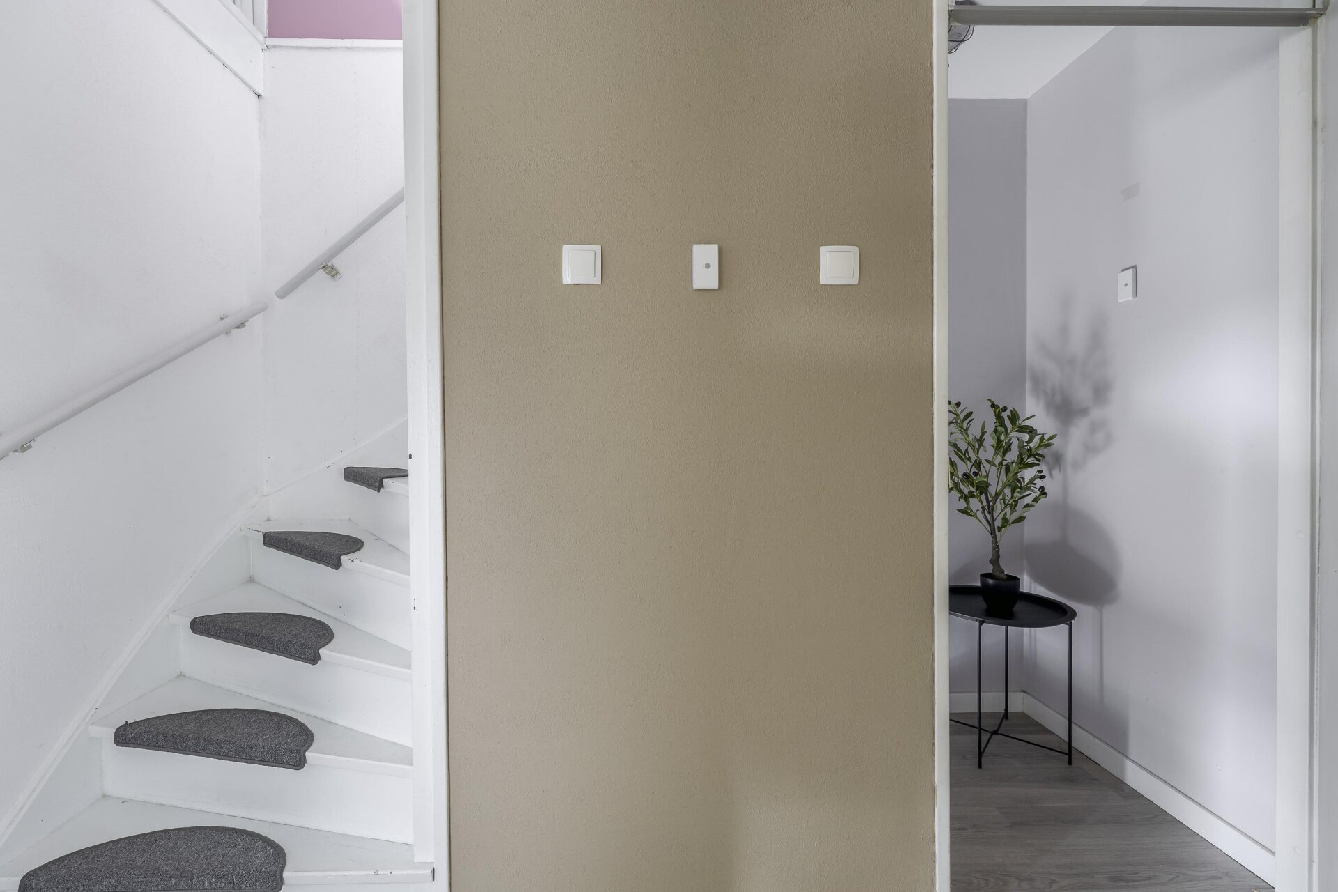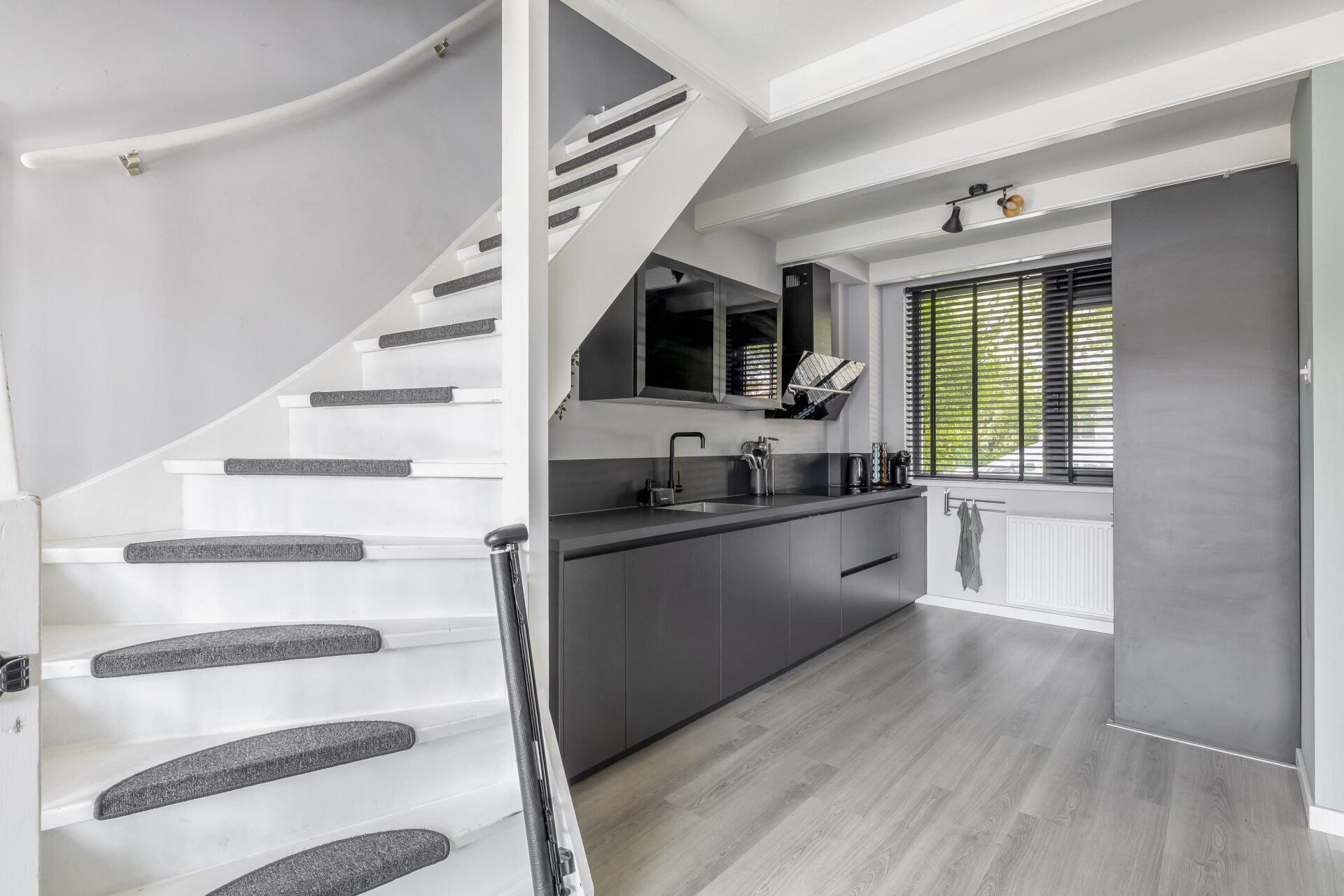 De woning is verdeeld over drie verdiepingen en beschikt over een lichte doorzonwoonkamer, vier slaapkamers, en een verzorgde voortuin én achtertuin. De afwerking is strak en modern, met o.a. een laminaatvloer, glad gestuukte wanden, volledig kunststof kozijnen en zwarte accenten die zorgen voor een stoere uitstraling.
