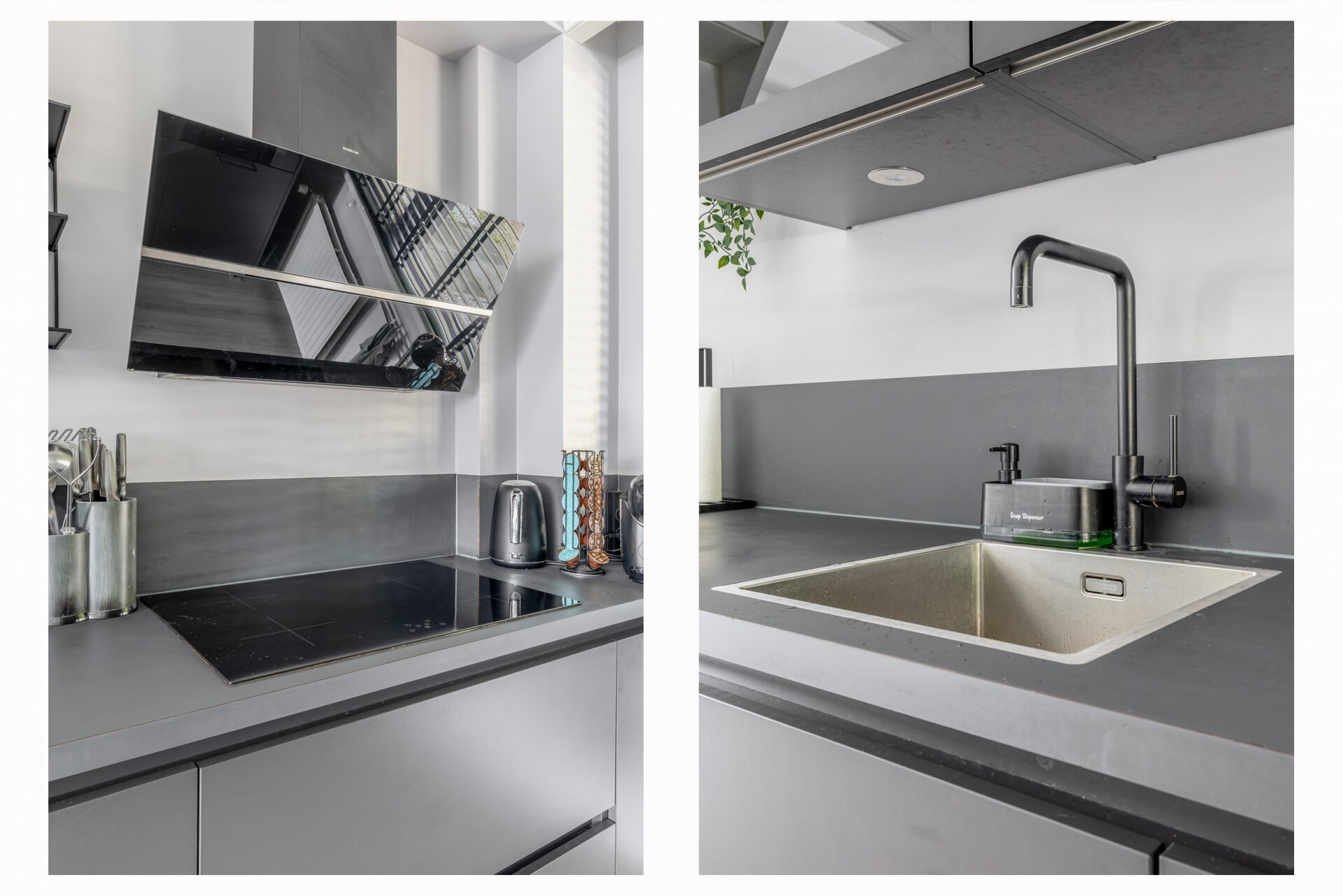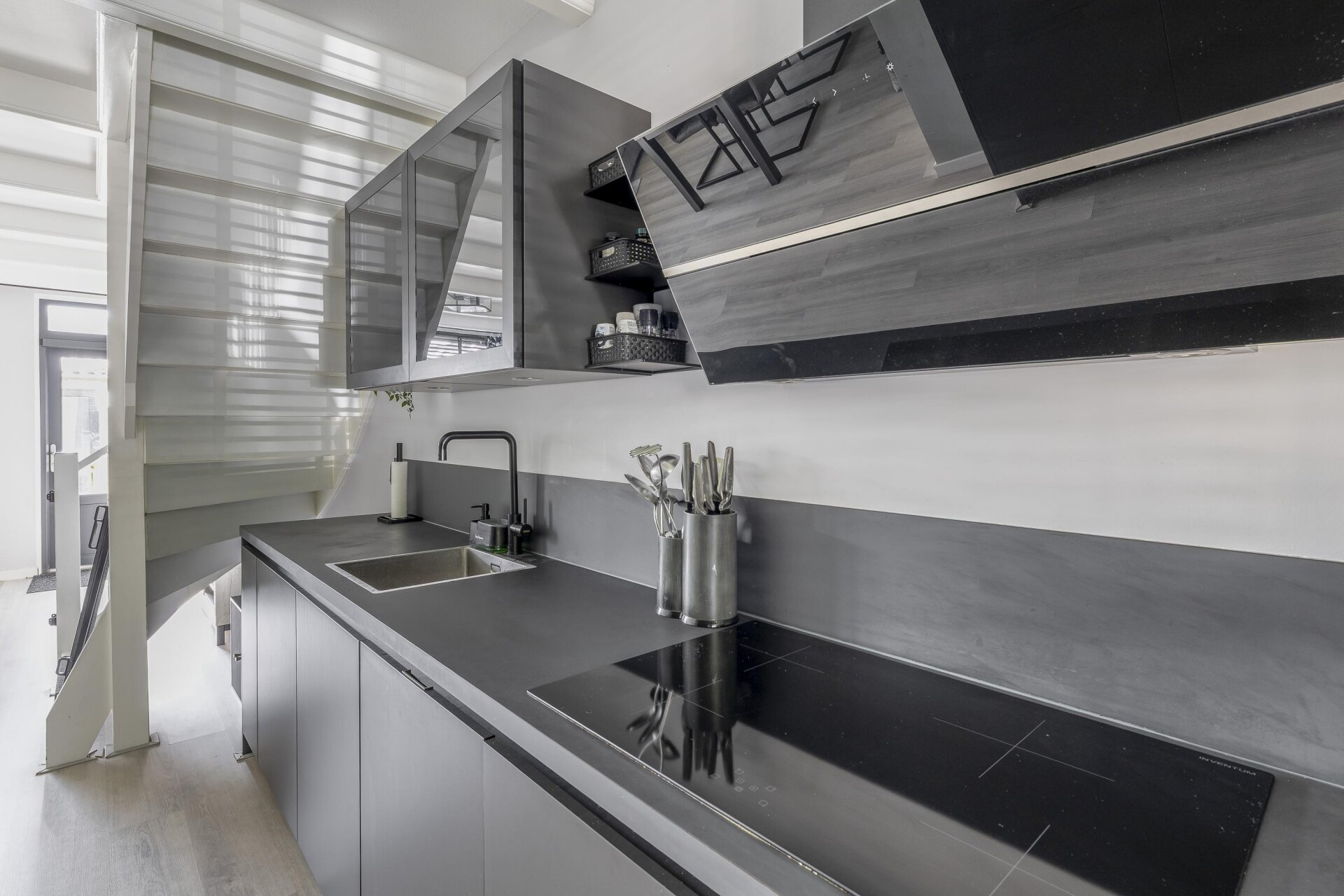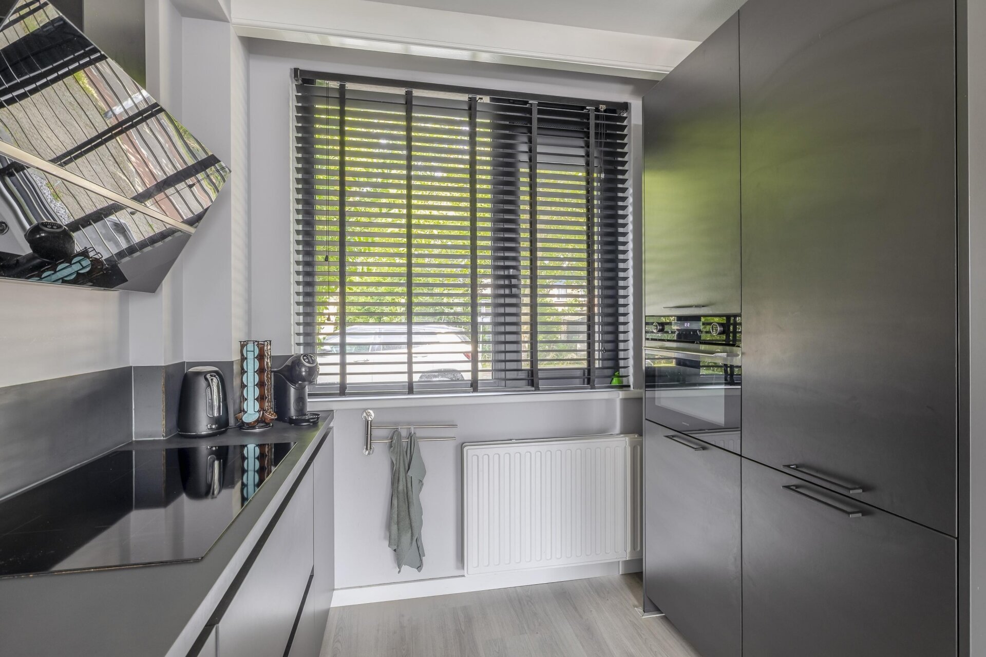 De keuken aan de voorzijde is uitgevoerd in matzwart met greeploze fronten, een composiet werkblad en luxe inbouwapparatuur. Denk aan een inductiekookplaat met afzuiging, combi-oven, vaatwasser en een koel-vriescombinatie. Ook hier is gekozen voor hoogwaardige materialen en een rustige, stijlvolle uitstraling.