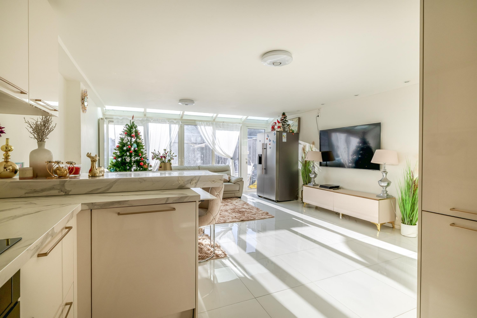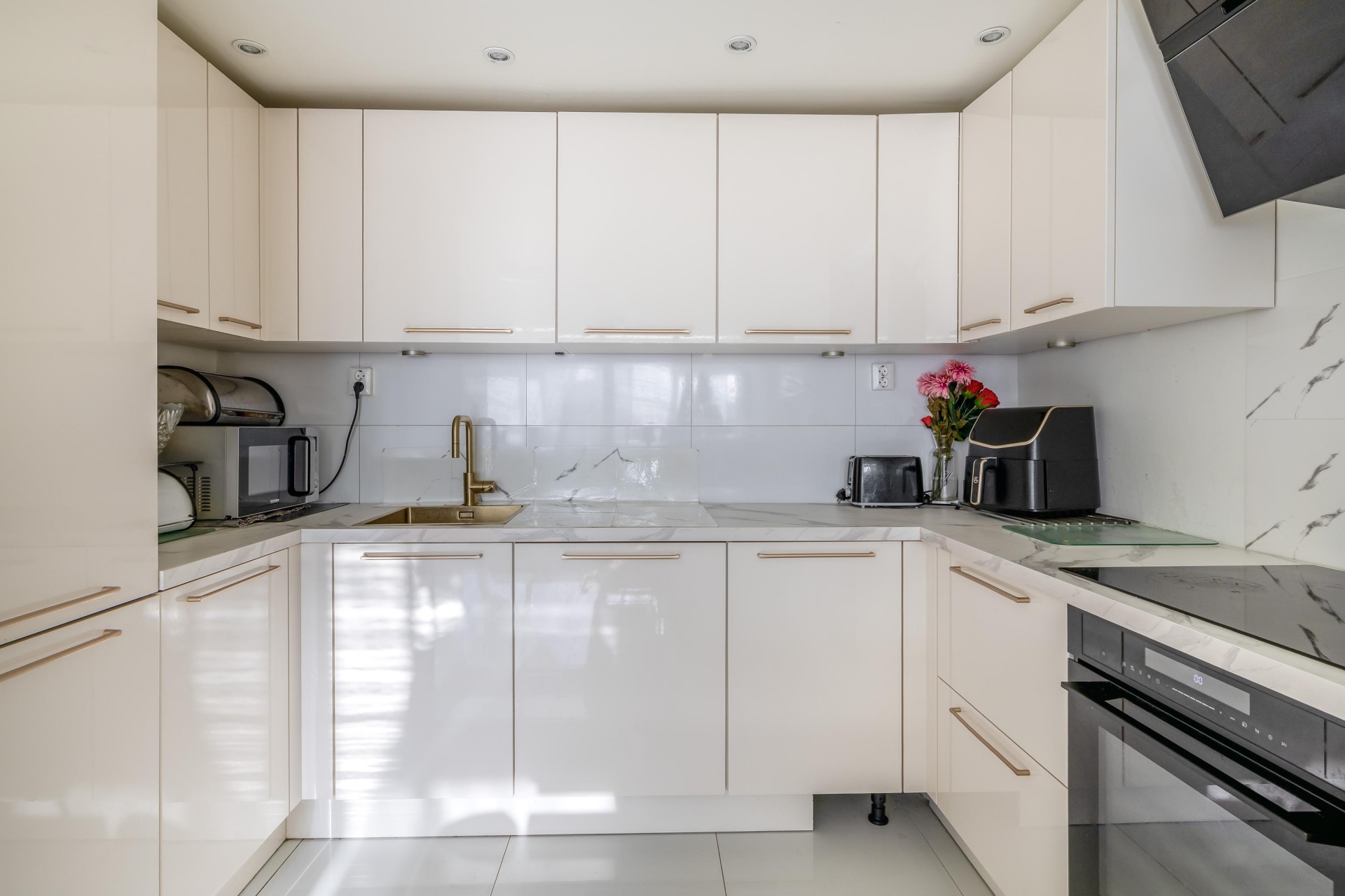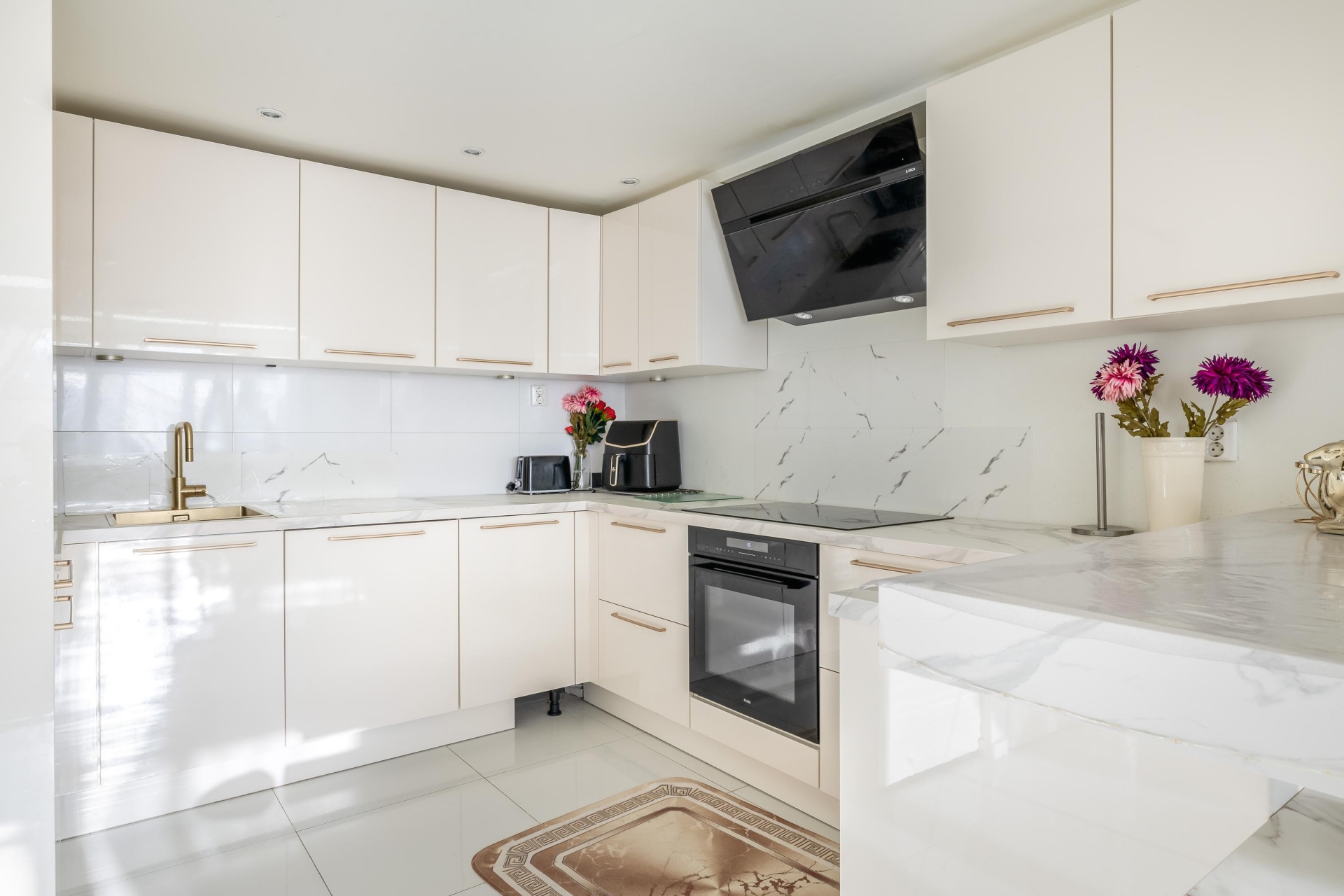 Wat direct opvalt bij binnenkomst is de strakke en moderne afwerking. De begane grond is voorzien van een fraaie plavuizen vloer met vloerverwarming (2024), wat zorgt voor veel wooncomfort. Aan de achterzijde is de woonkamer uitgebouwd en biedt via een grote schuifpui toegang tot de zonnige achtertuin op het zuiden. De open keuken aan de voorzijde is in 2024 vernieuwd en uitgerust met diverse inbouwapparatuur, waaronder een oven, kookplaat, afzuigkap en vaatwasser.