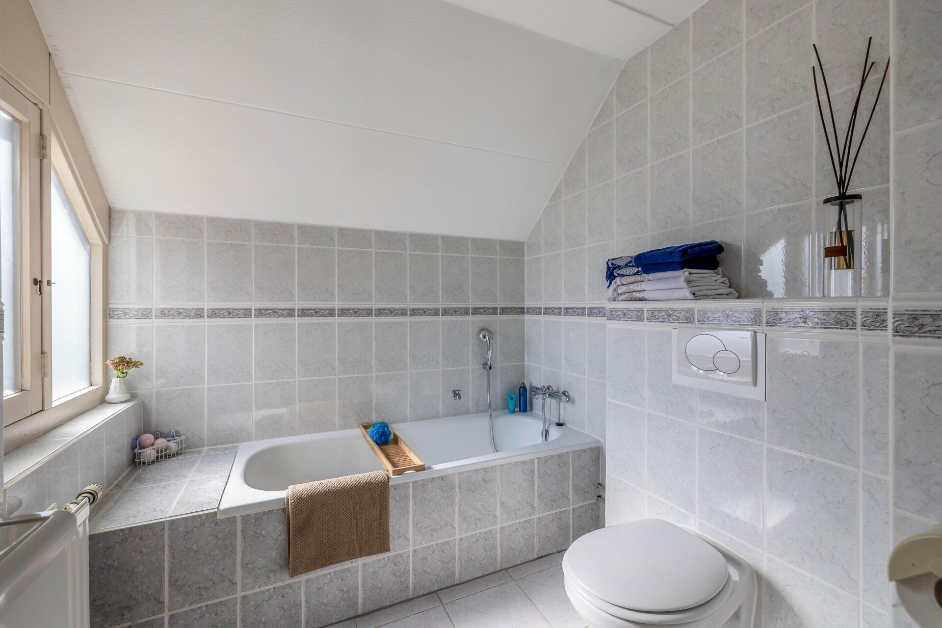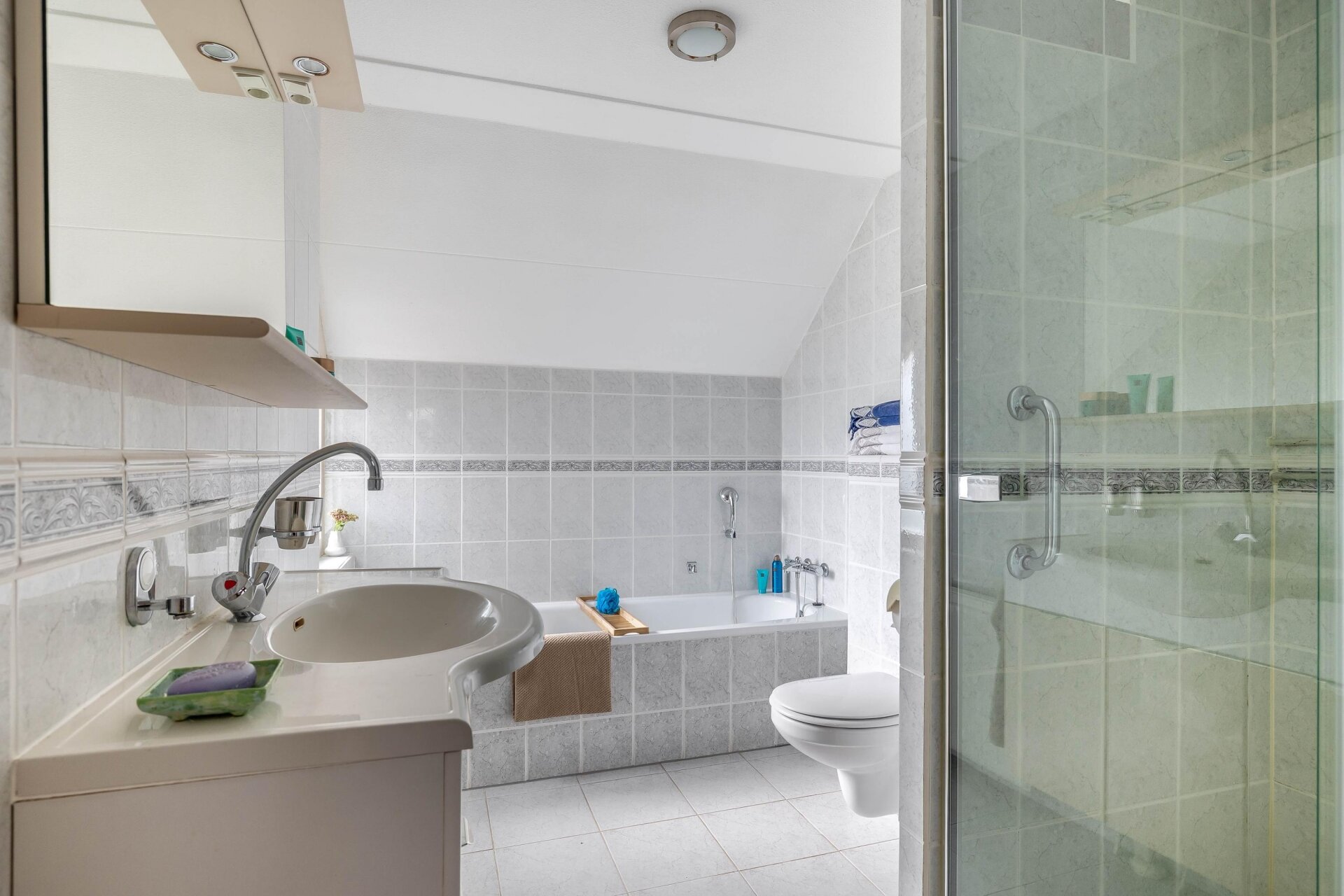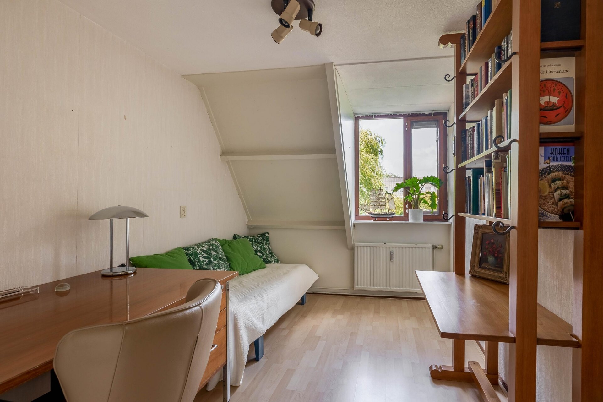 Op de verdiepingen vind je in totaal vier slaapkamers, stuk voor stuk van prettig formaat. Genoeg ruimte voor een master bedroom, kinderkamer, werkkamer en/of logeerkamer. De nette badkamer is compleet uitgevoerd met ligbad, douche, tweede toilet en wastafel. Op de open zolderverdieping kunt u nog makkelijk een washoek creëren.