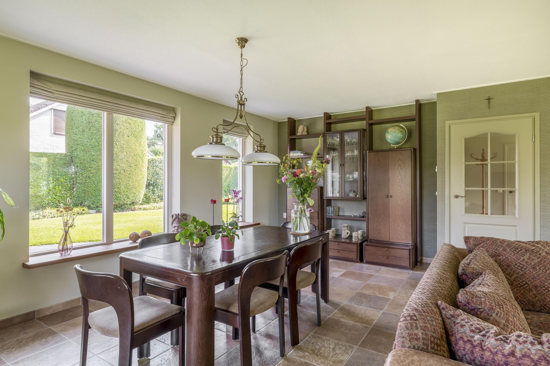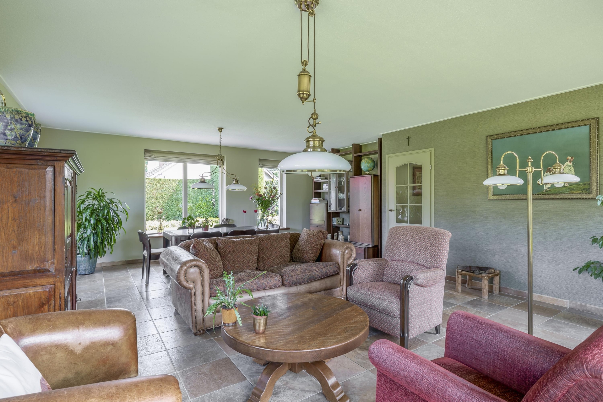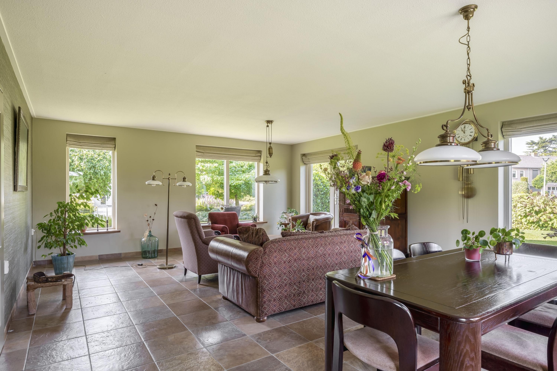 Stap je de woonkamer binnen, dan valt meteen op hoeveel daglicht er binnenkomt. Dankzij de grote ramen en het groene uitzicht rondom voelt het hier licht en open. De ruimte is royaal opgezet en geeft je genoeg plek voor zowel een gezellige zithoek als een grote eettafel. Vanuit meerdere kanten kijk je uit op het groen en de tuin, wat het binnen-buiten gevoel versterkt.