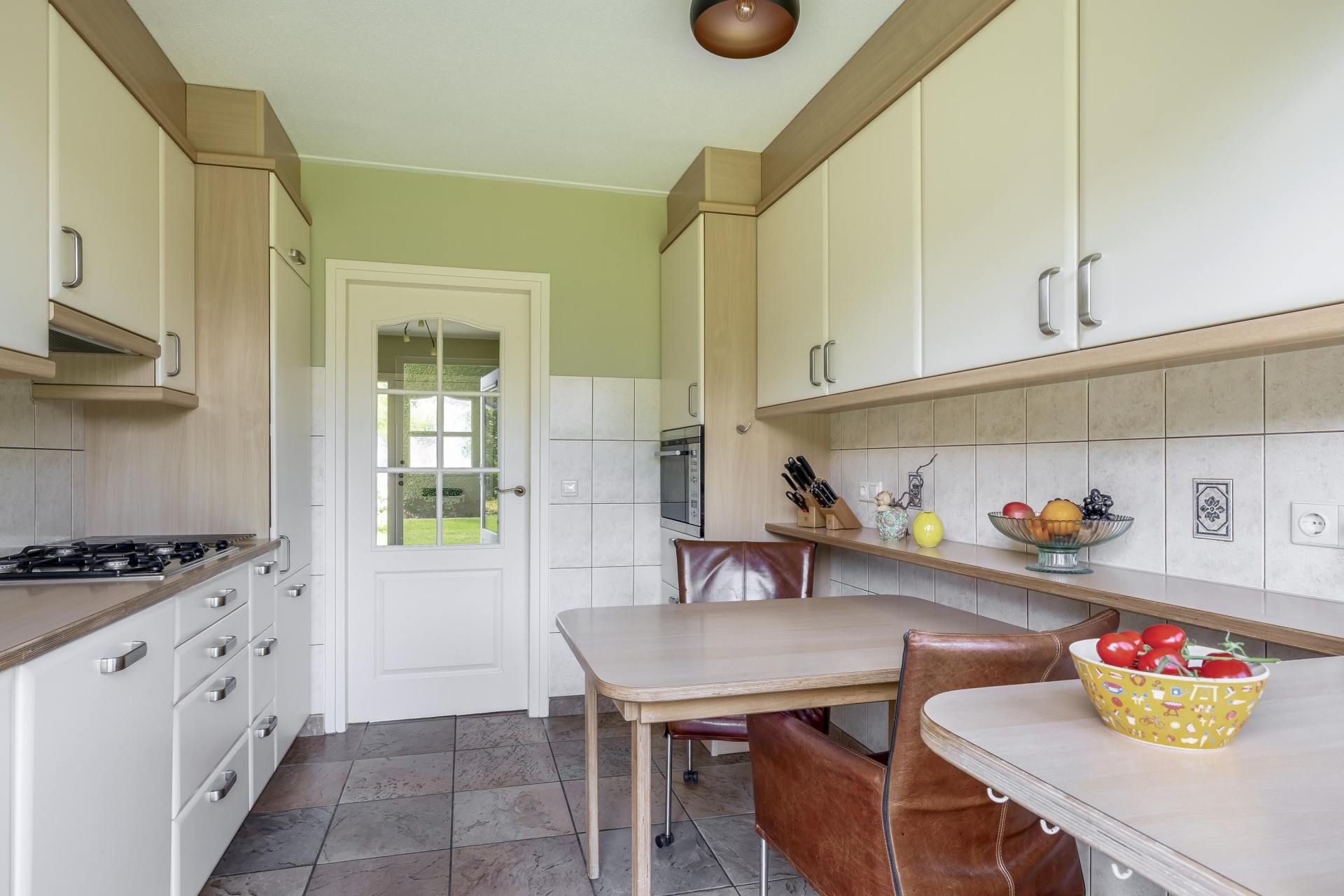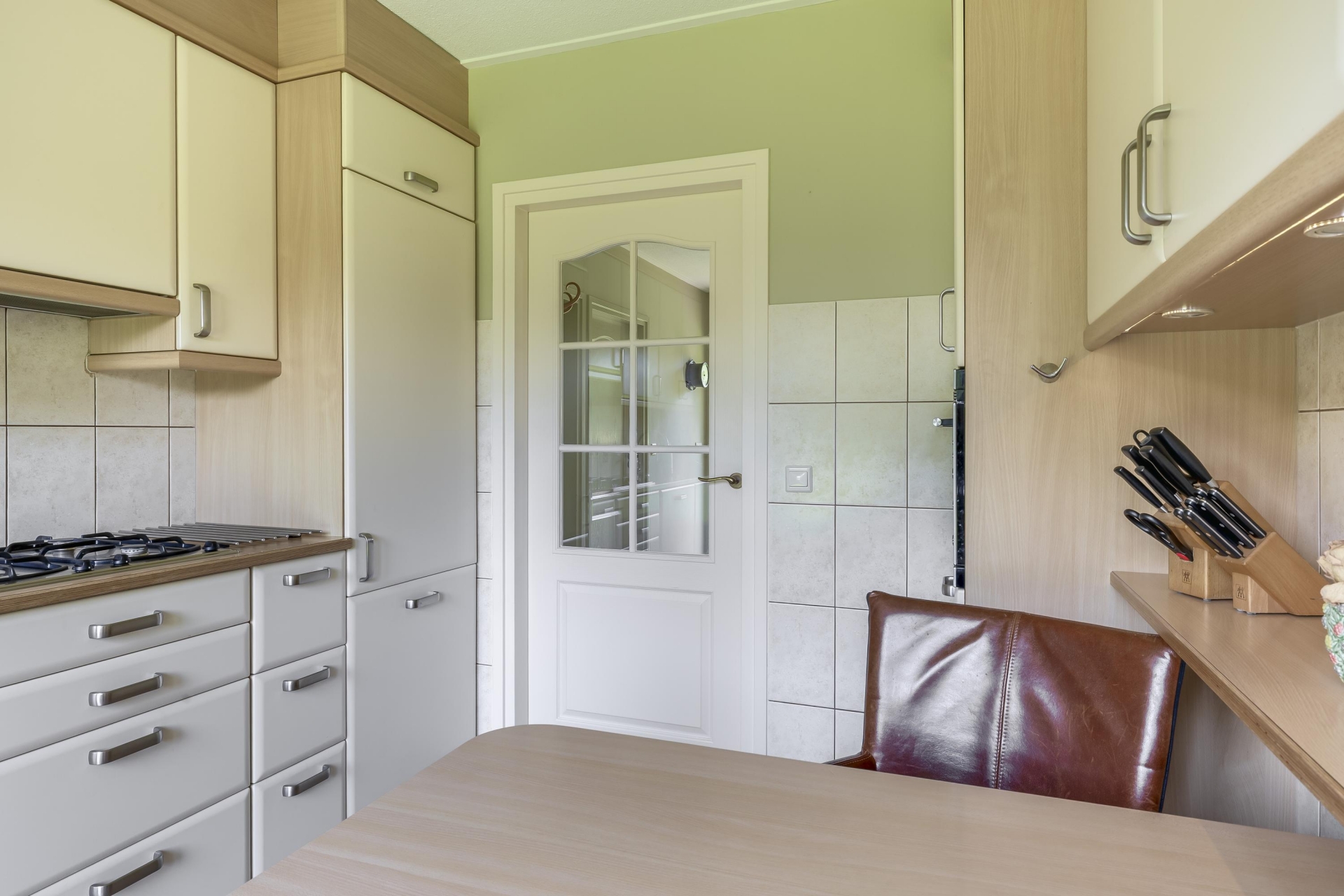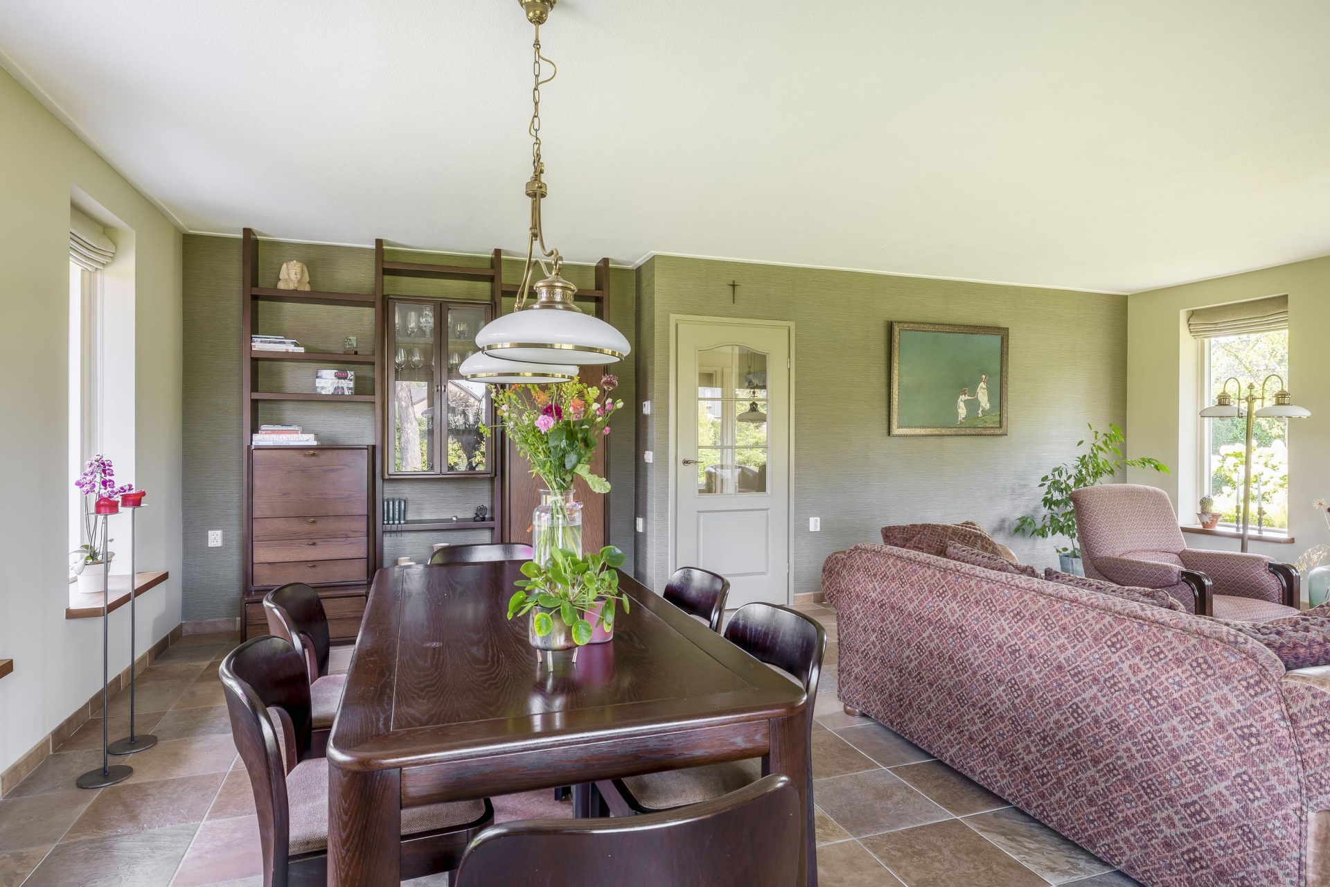 Stap je de woonkamer binnen, dan valt meteen op hoeveel daglicht er binnenkomt. Dankzij de grote ramen en het groene uitzicht rondom voelt het hier licht en open. De ruimte is royaal opgezet en geeft je genoeg plek voor zowel een gezellige zithoek als een grote eettafel. Vanuit meerdere kanten kijk je uit op het groen en de tuin, wat het binnen-buiten gevoel versterkt.