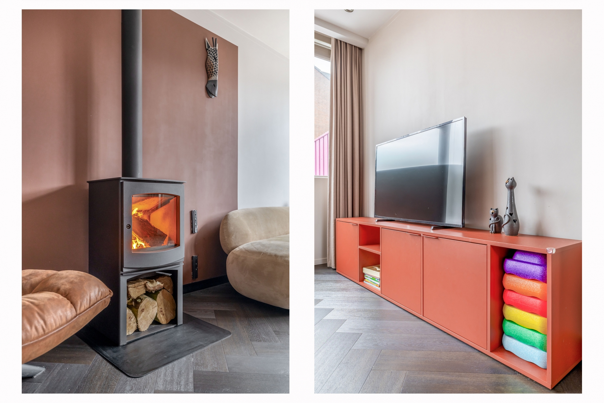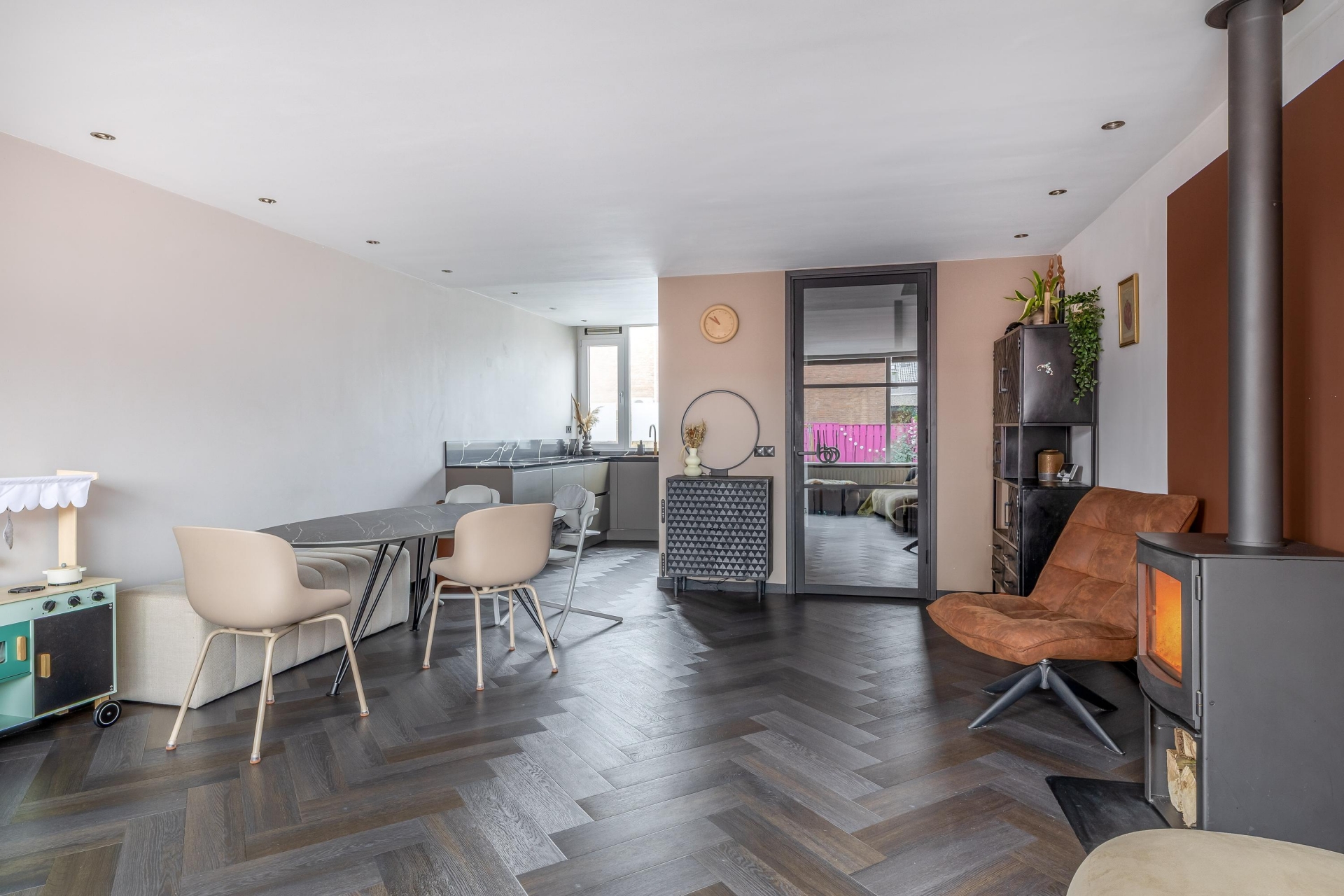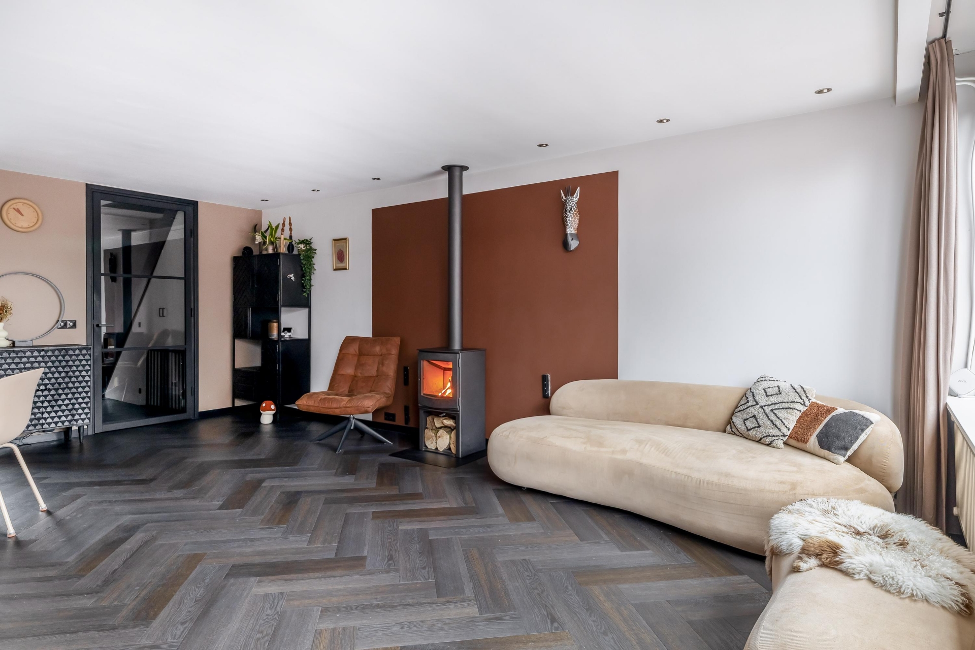 Zodra je binnenkomt, ervaar je de warme sfeer van dit huis. De woonkamer is heerlijk licht dankzij de grote ramen aan de voorzijde en tuinkant. Centraal in de ruimte staat een stijlvolle houtkachel die niet alleen voor warmte zorgt, maar ook direct karakter toevoegt aan het geheel. De muren zijn strak gestuukt en de vloer is afgewerkt met een moderne houtlook, wat zorgt voor een frisse en tijdloze uitstraling.
