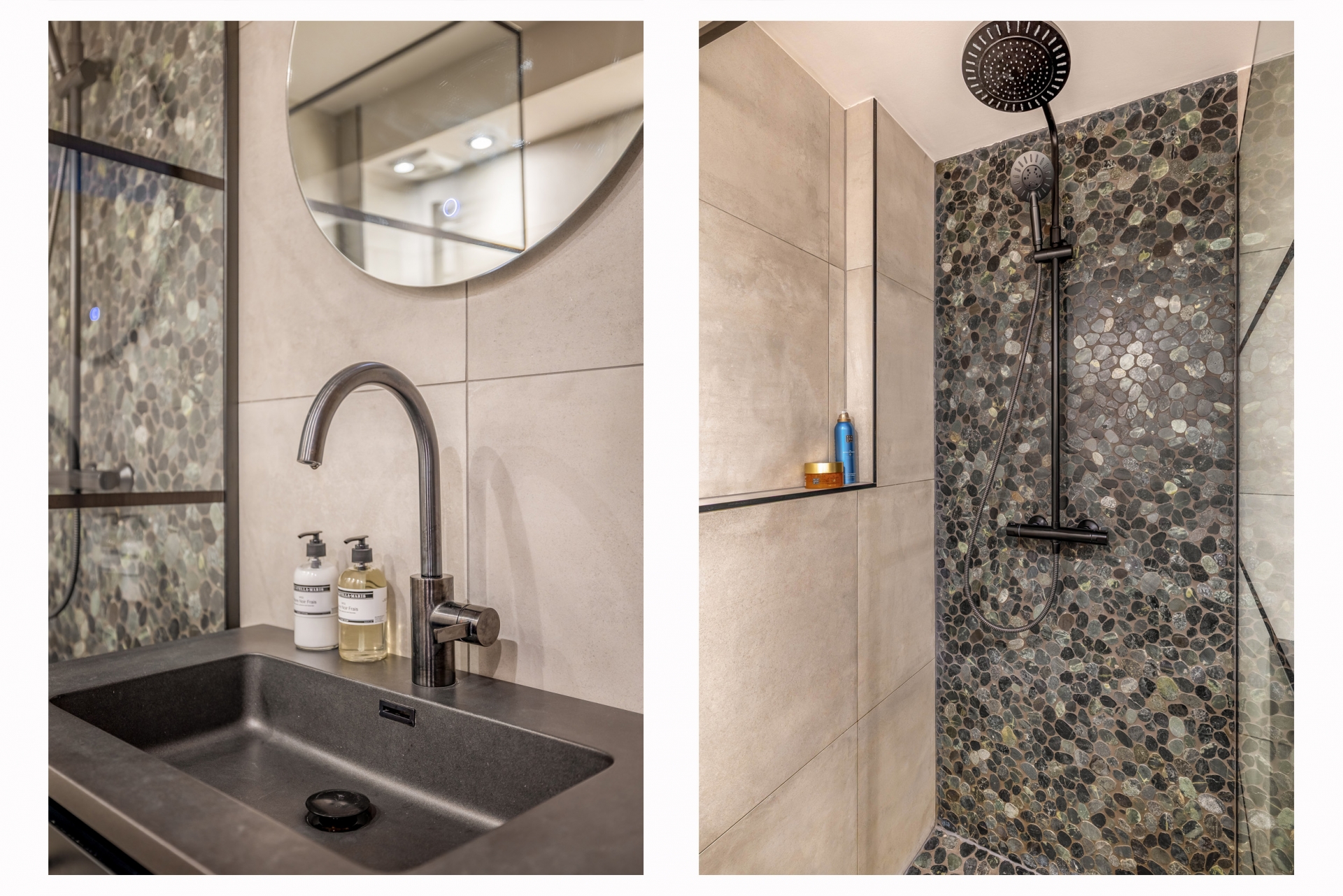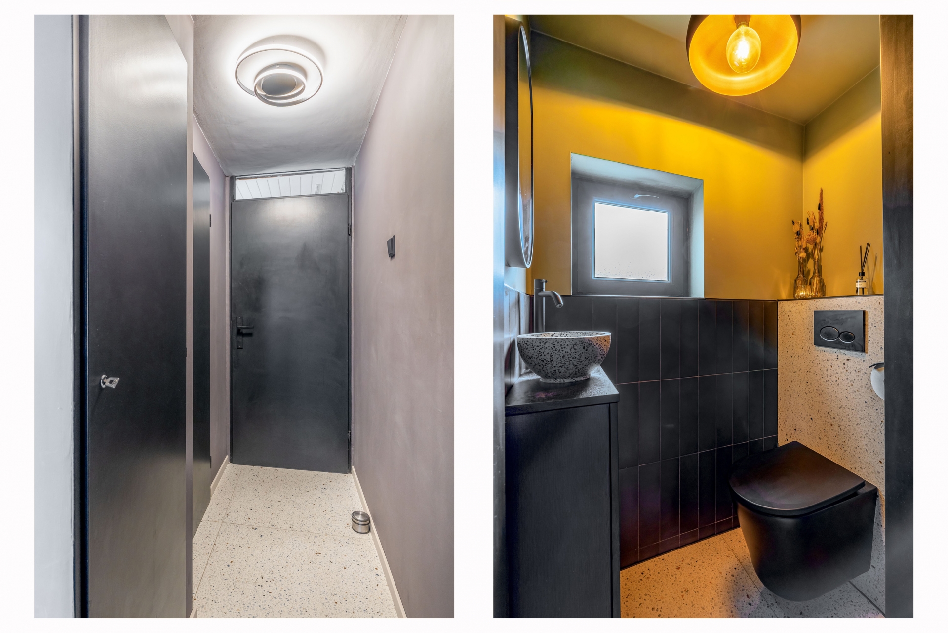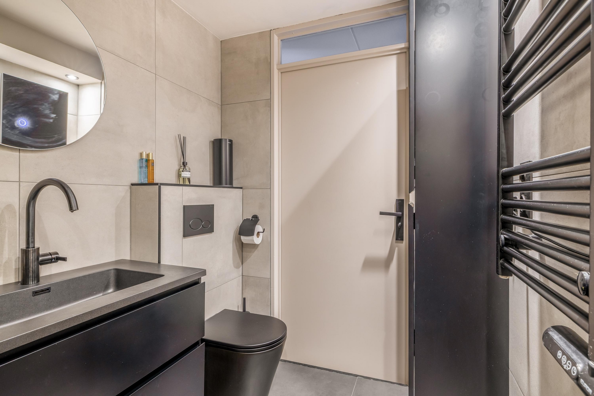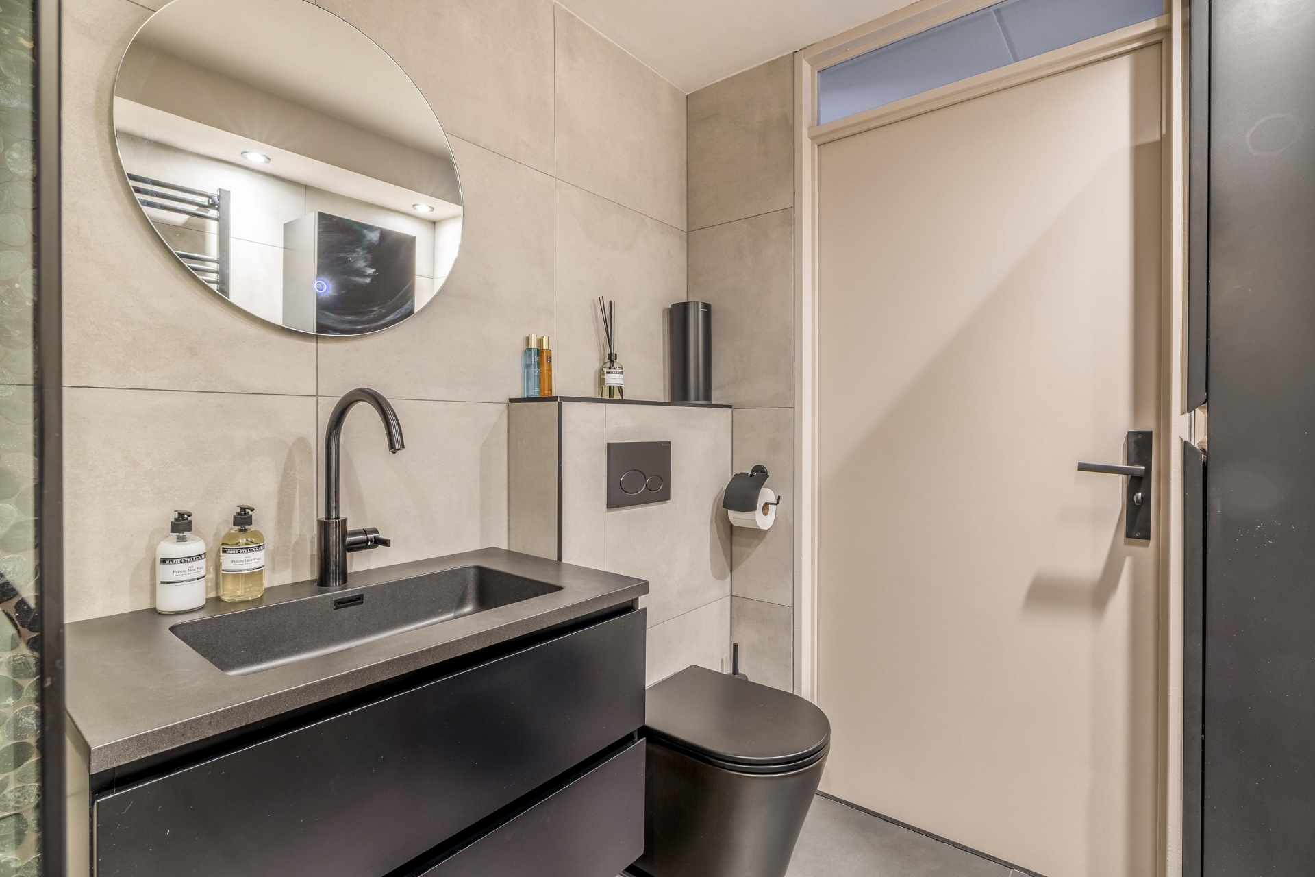De badkamer is recent gemoderniseerd en voorzien van een inloopdouche, wastafelmeubel en modern tegelwerk in neutrale tinten. Alles is strak afgewerkt en goed onderhouden. Ook het toilet op de begane grond is in dezelfde stijl vernieuwd, wat zorgt voor een rustige, consistente uitstraling in het hele huis.