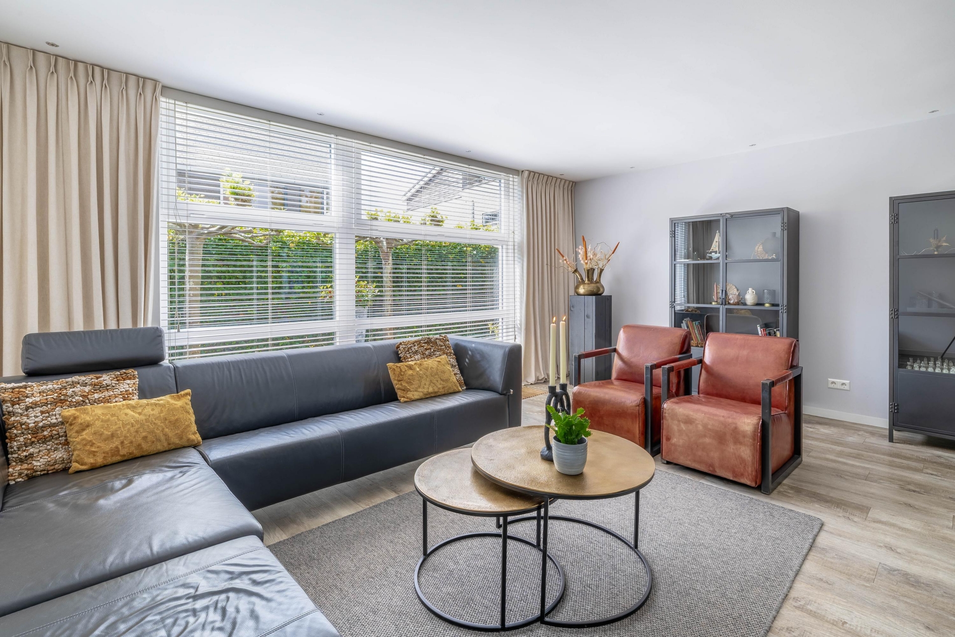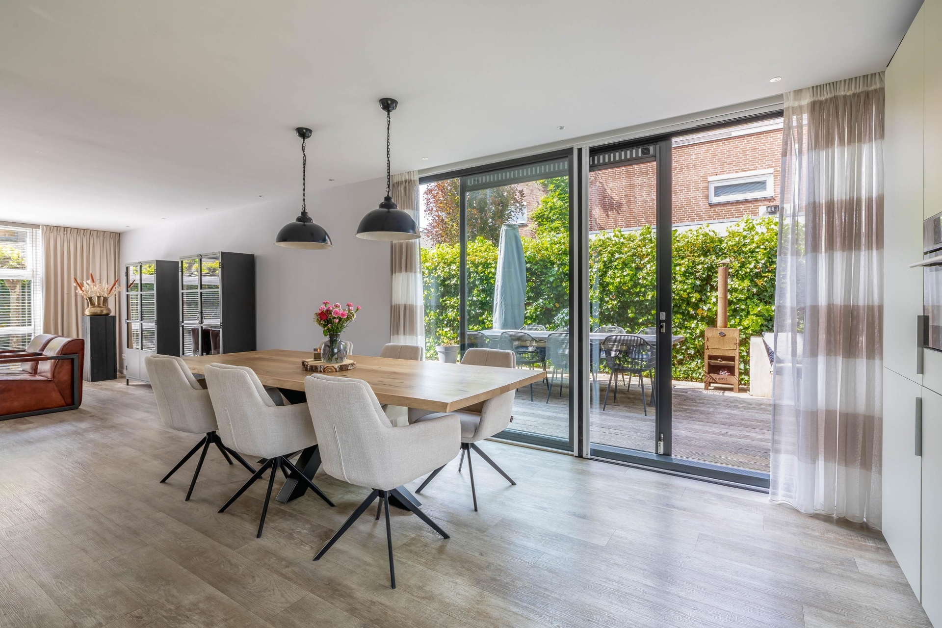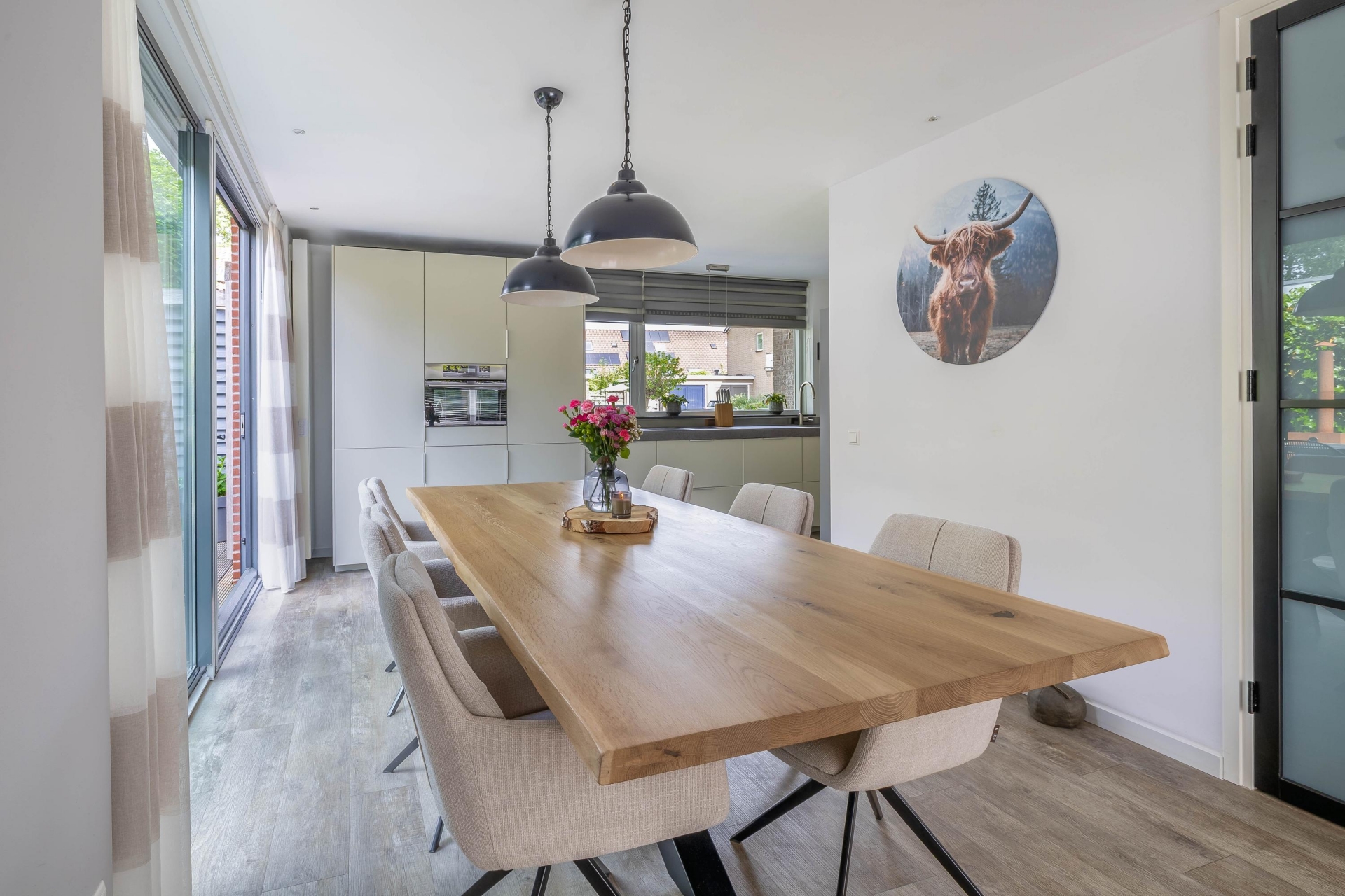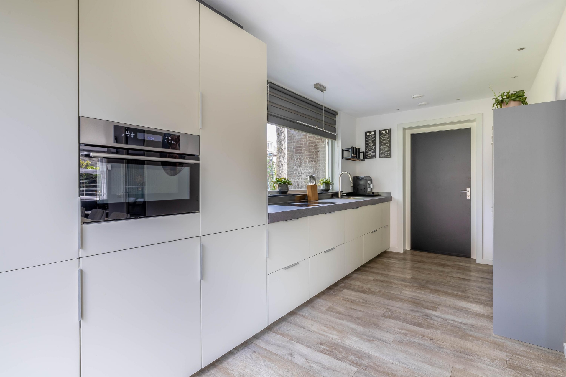 Bij binnenkomst valt direct de royale en lichte woonkamer op. Dankzij de grote raampartijen aan de voorzijde en de stijlvolle afwerking voelt deze ruimte open en uitnodigend. De neutrale vloer en strakke wandafwerking vormen een rustige basis waar elk interieur goed tot z'n recht komt. Vanuit de woonkamer loop je door naar de leefkeuken aan de achterzijde: een plaatje op zich. Hier vind je een luxe keukenopstelling strak werkblad, hoogwaardige inbouwapparatuur en veel lichtinval door het grote raam en de schuifpui naar het terras. Binnen en buiten lopen hier moeiteloos in elkaar over – perfect voor zomerse avonden met familie of vrienden. Via de keuken is er een loopdeur naar de garage/bijkeuken, erg praktisch.