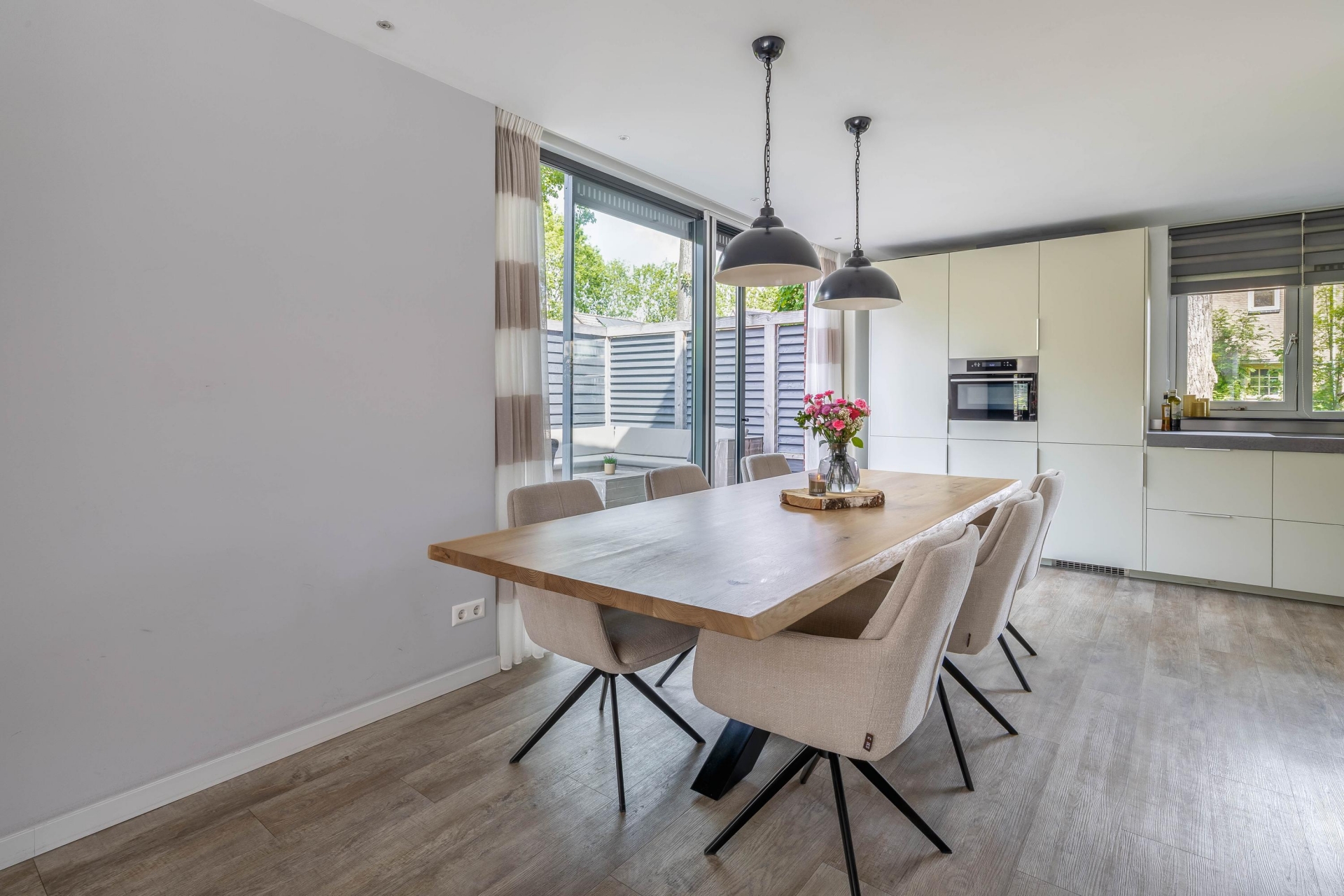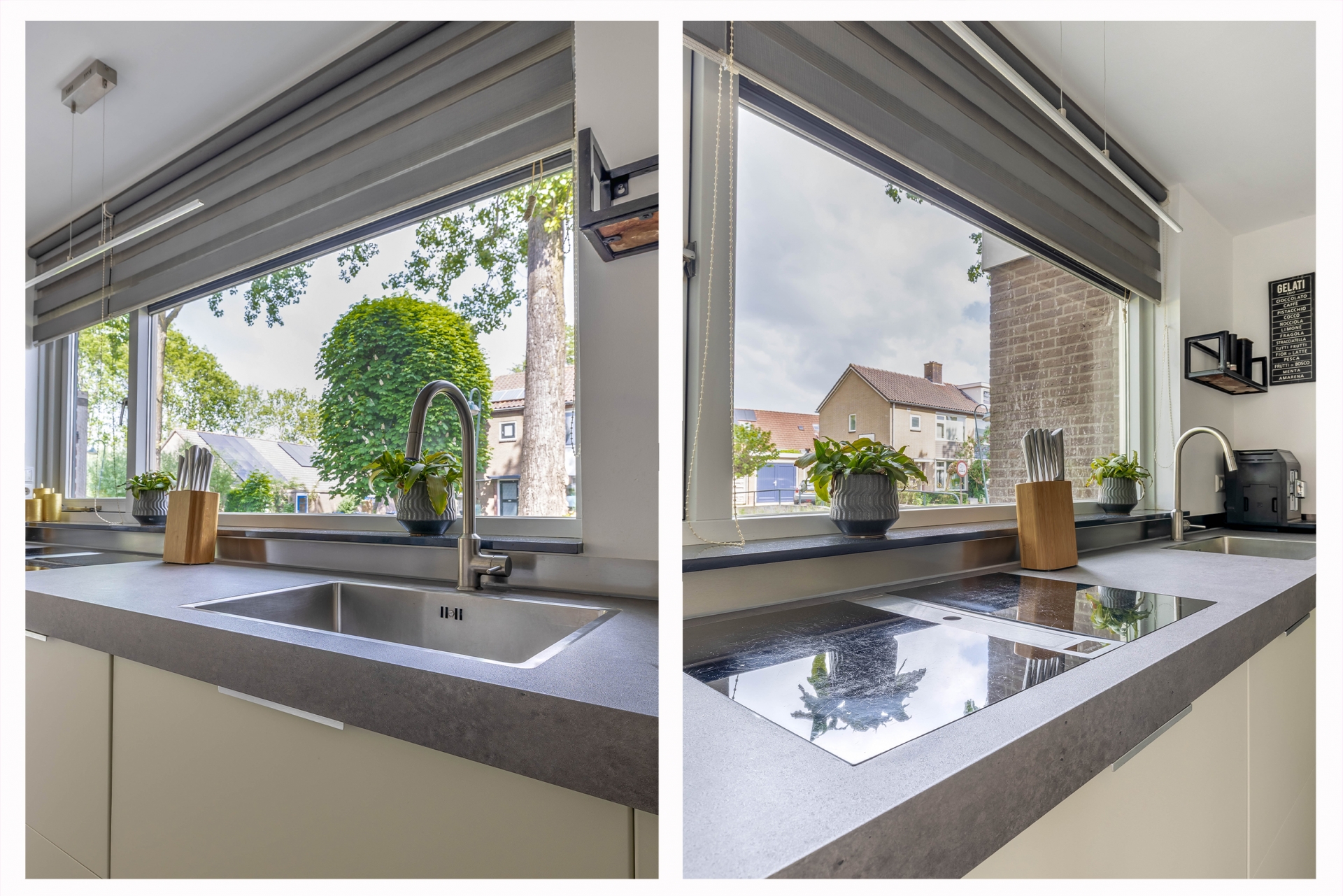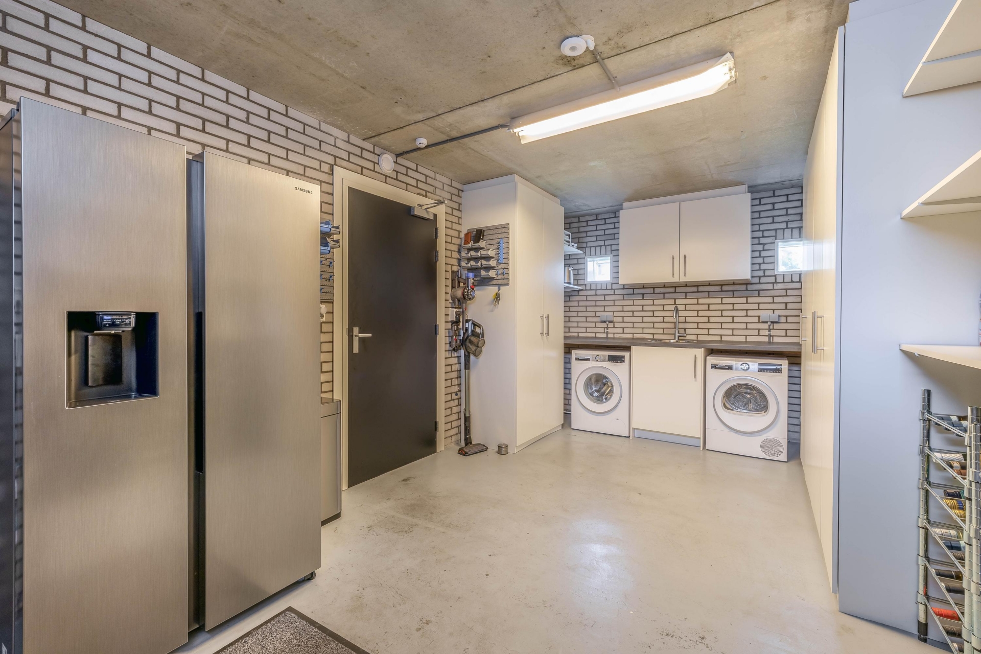 Bij binnenkomst valt direct de royale en lichte woonkamer op. Dankzij de grote raampartijen aan de voorzijde en de stijlvolle afwerking voelt deze ruimte open en uitnodigend. De neutrale vloer en strakke wandafwerking vormen een rustige basis waar elk interieur goed tot z'n recht komt. Vanuit de woonkamer loop je door naar de leefkeuken aan de achterzijde: een plaatje op zich. Hier vind je een luxe keukenopstelling strak werkblad, hoogwaardige inbouwapparatuur en veel lichtinval door het grote raam en de schuifpui naar het terras. Binnen en buiten lopen hier moeiteloos in elkaar over – perfect voor zomerse avonden met familie of vrienden. Via de keuken is er een loopdeur naar de garage/bijkeuken, erg praktisch.