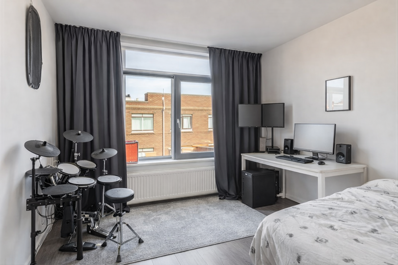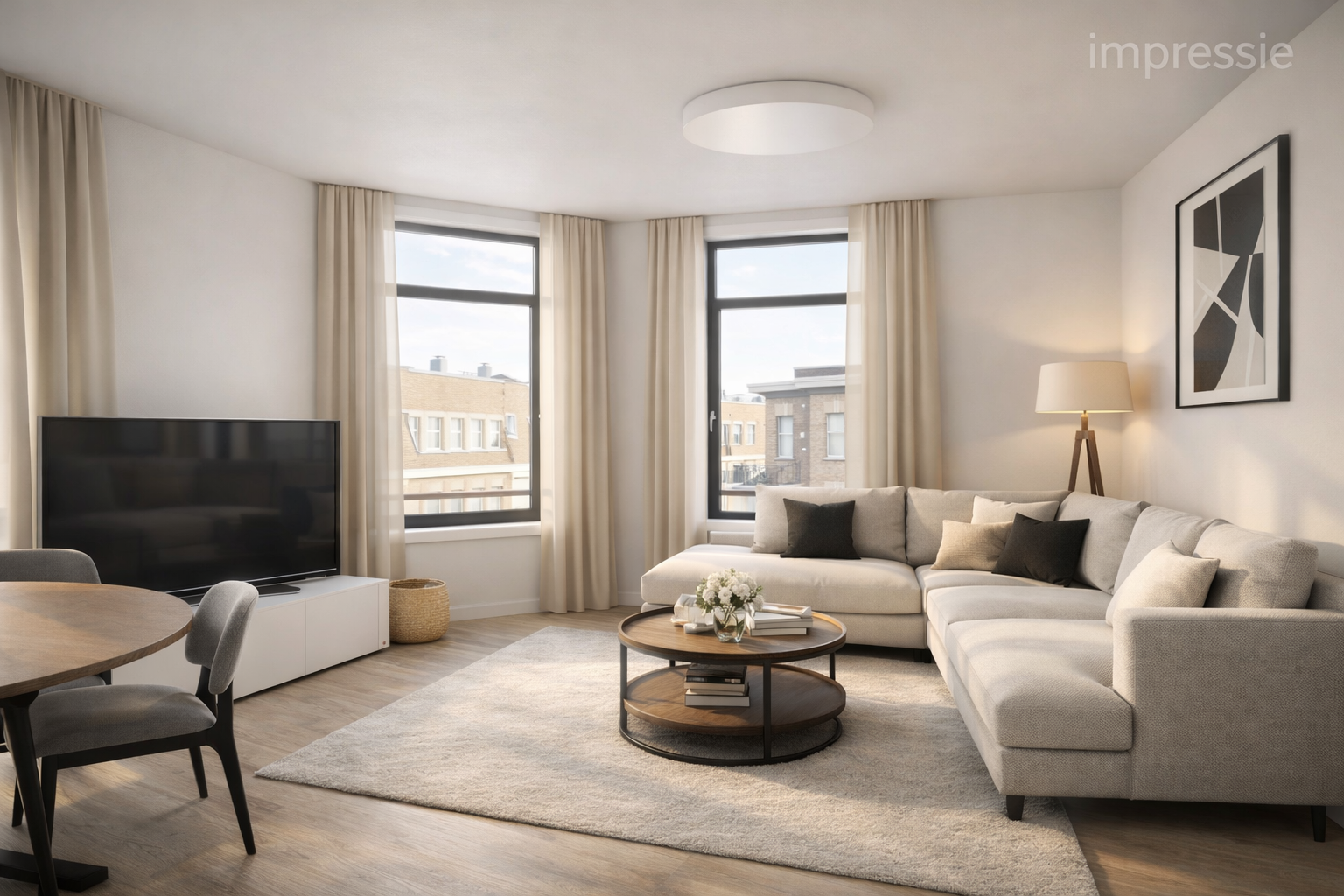 Dankzij de hoekligging en de vele ramen profiteer je hier de hele dag van een prettige lichtinval. De ruime woonkamer, gelegen op de hoek van het gebouw, vormt het centrale punt van de woning en biedt een fijn uitzicht over de omgeving - een ideale plek om te ontspannen of gasten te ontvangen.