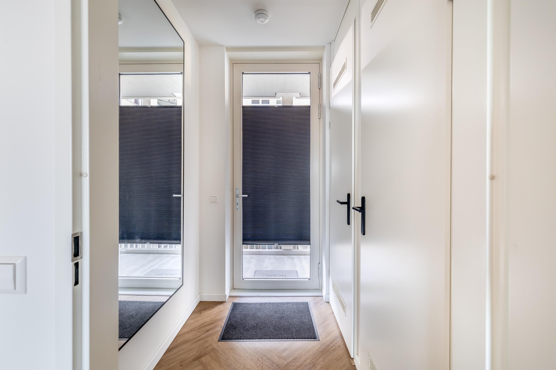 Voor de entree van het appartement is ruimte voor een zitje met uitzicht op het binnenterrein van het complex, een fijne plek om even buiten te zitten.