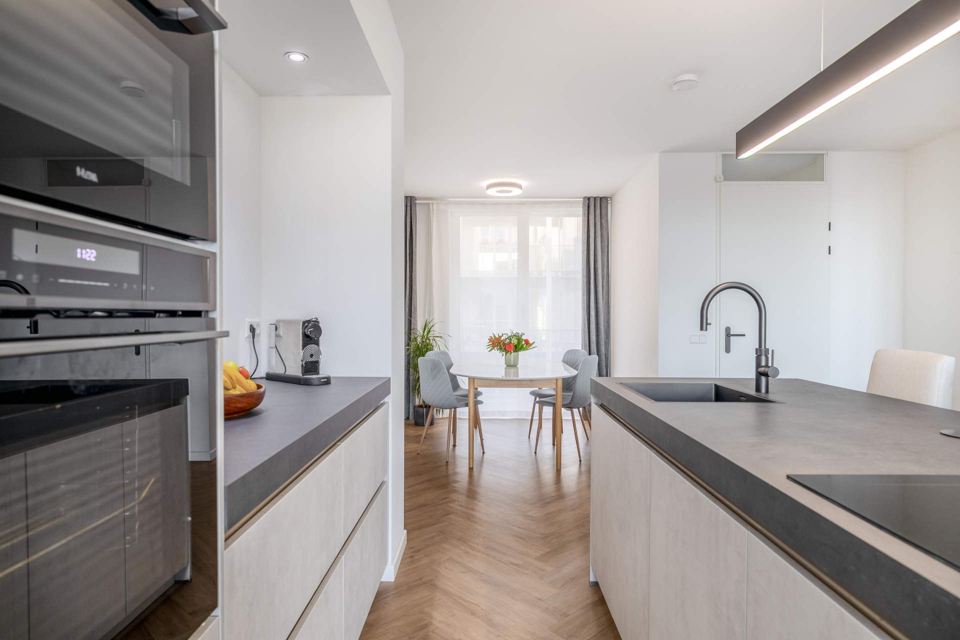 De keuken is zonder twijfel één van de eyecatchers van deze woning. De lichte kleurstelling geeft de keuken een luxe en moderne uitstraling. Uiteraard is de keuken volledig uitgerust met hoogwaardige inbouwapparatuur, waaronder een oven en combi-oven, een inductiekookplaat met geïntegreerd afzuigsysteem, een koel-vriescombinatie en een vaatwasser.