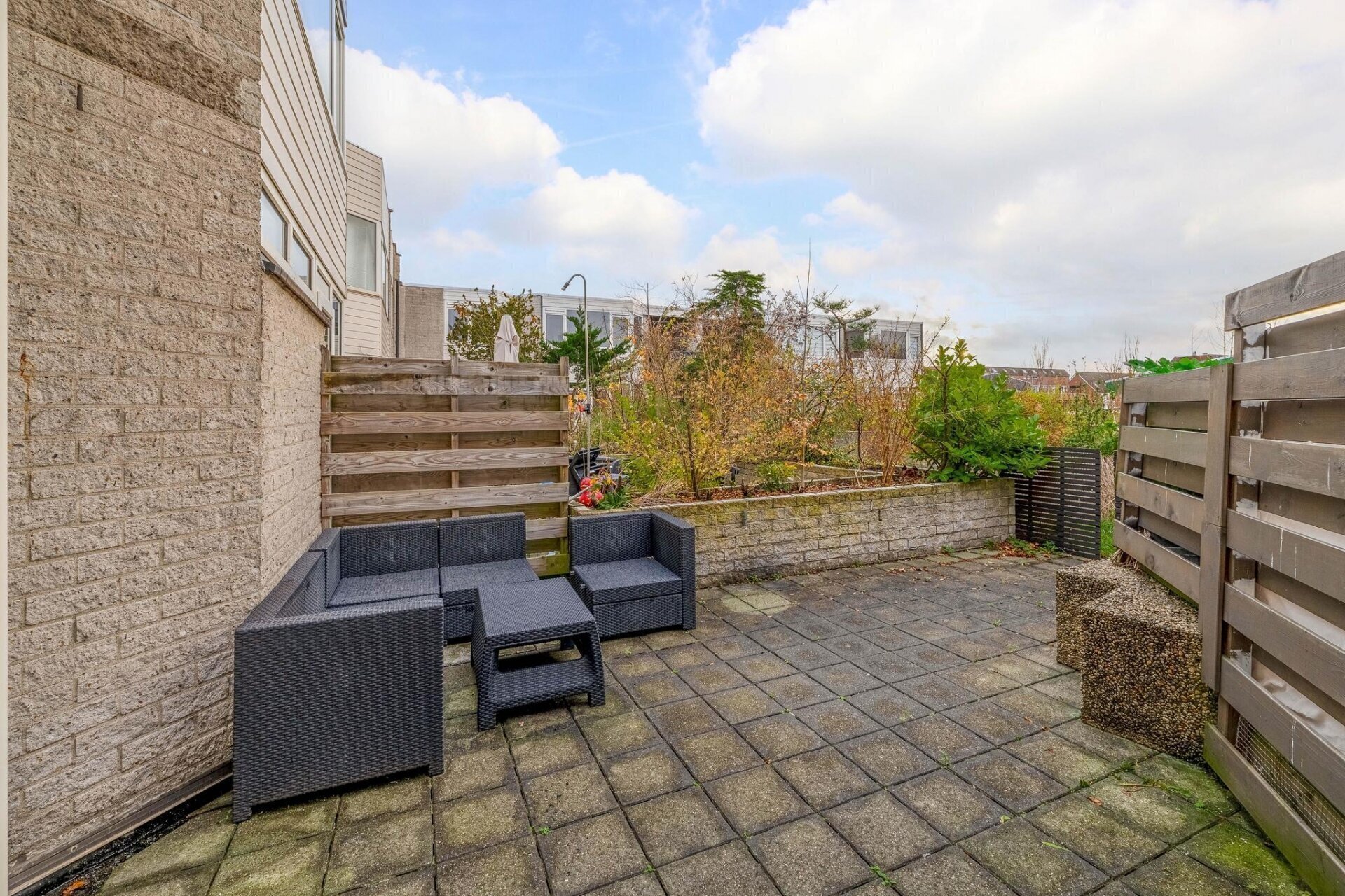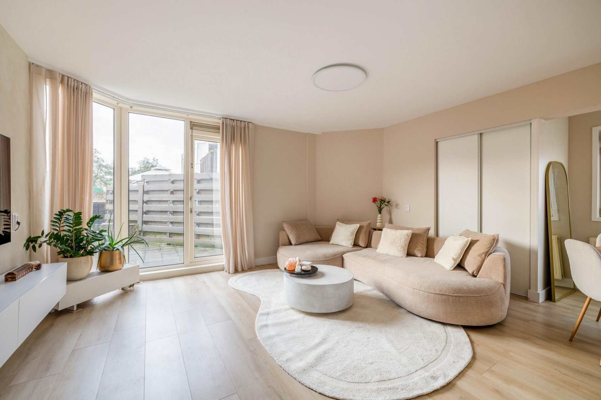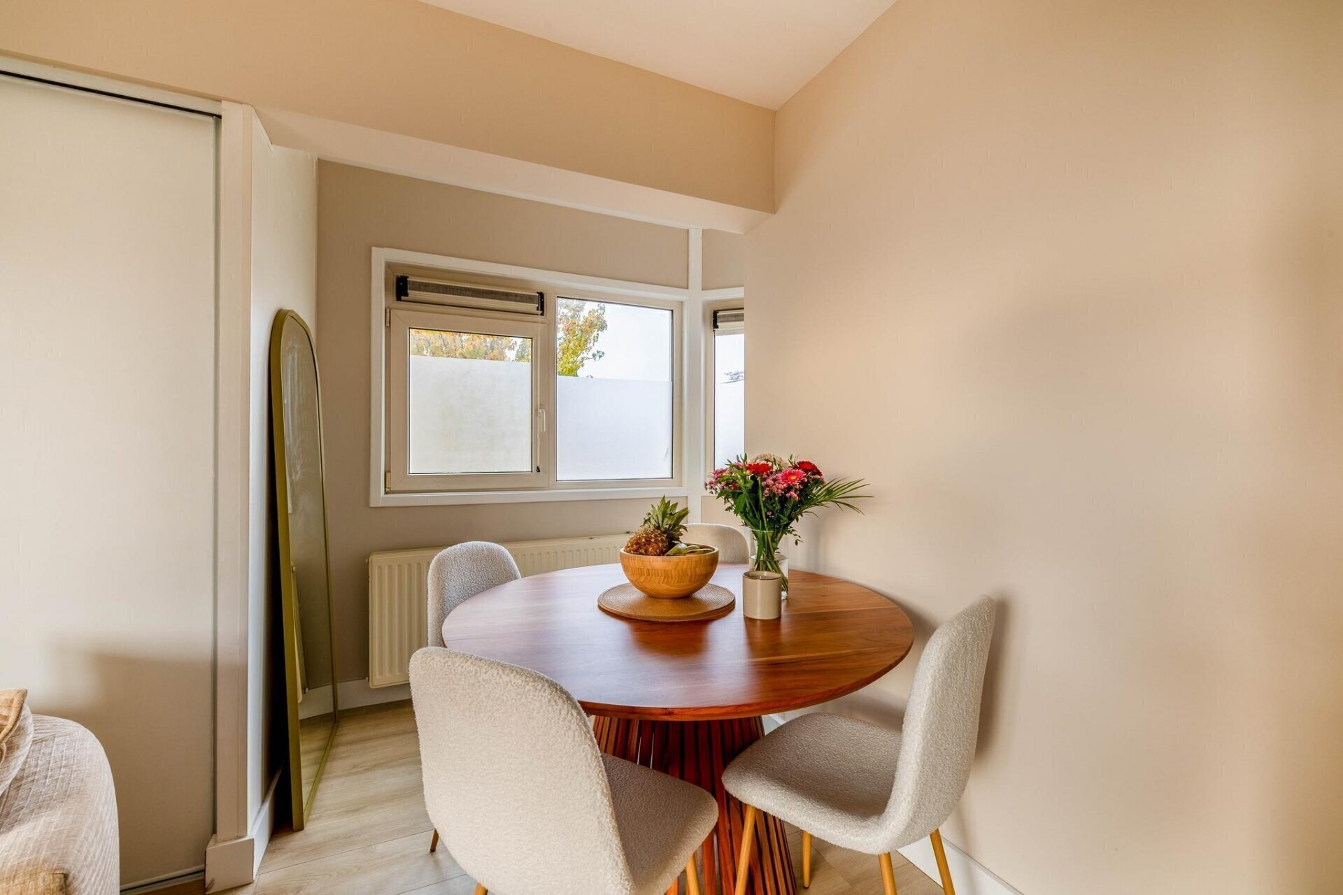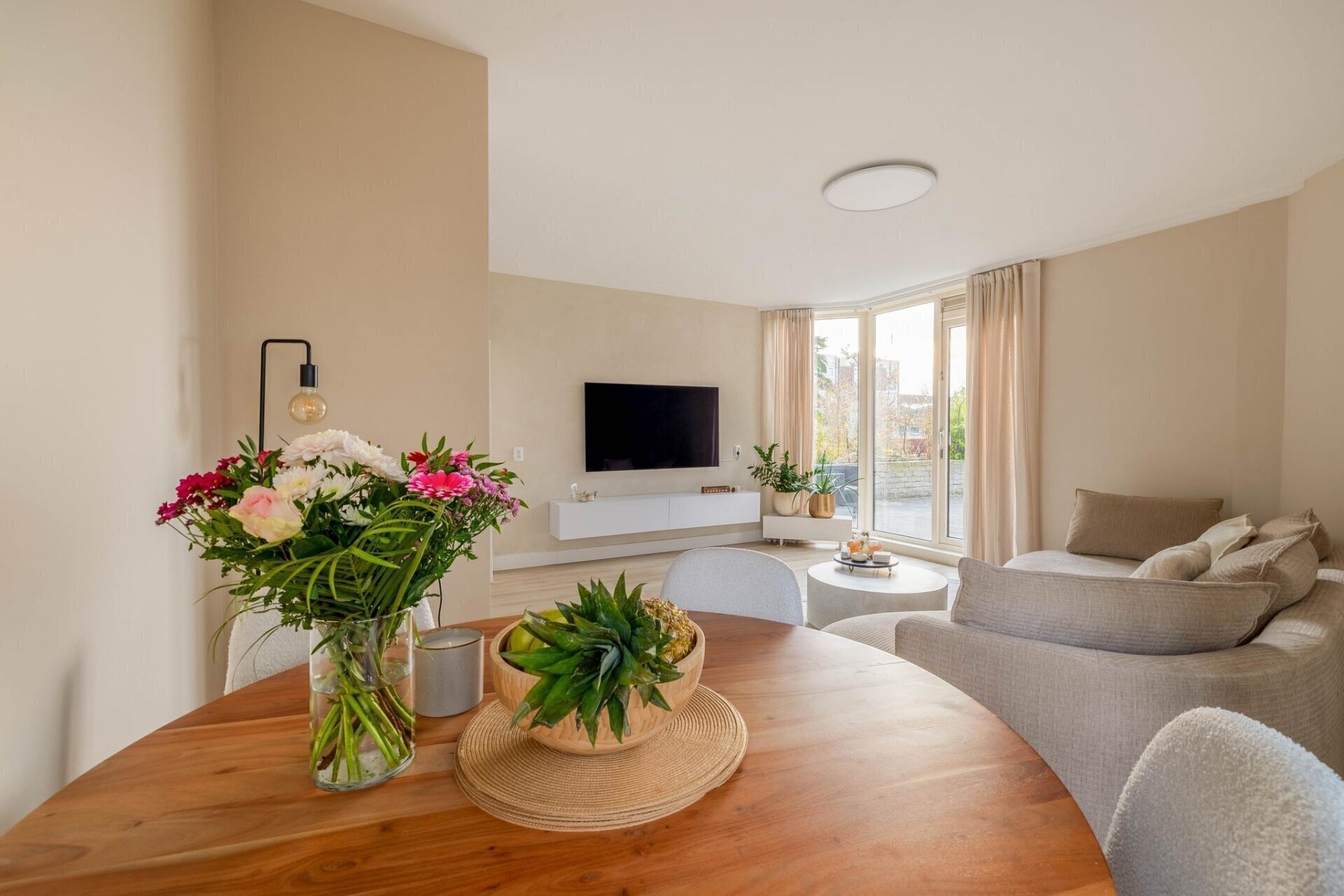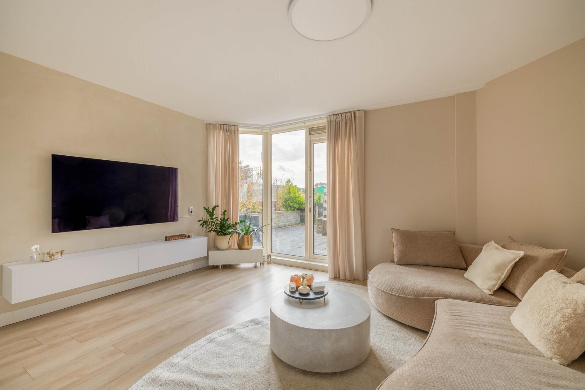De lichte woonkamer is ruim en biedt volop mogelijkheden voor een comfortabele inrichting. Bovendien grenst de woonkamer direct aan het zonnige dakterras, waar je kunt genieten van een ontbijt in de ochtendzon of een borrel op een zwoele zomeravond.