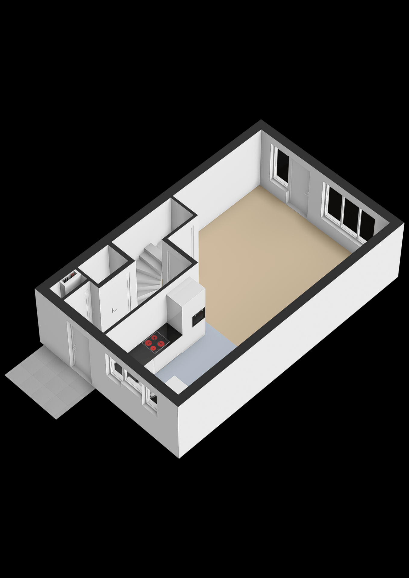De woonkamer is een prettige, lichte ruimte dankzij de grote ramen en het directe contact met de tuin. De warme houten vloer, het neutrale kleurgebruik en de open indeling zorgen voor een rustige sfeer. Hier geniet je van een kop koffie in het ochtendzonnetje of een borrel met vrienden aan het einde van de dag. De openslaande deur naar buiten maakt het plaatje compleet: in de zomer loopt het binnen- en buitenleven moeiteloos in elkaar over.