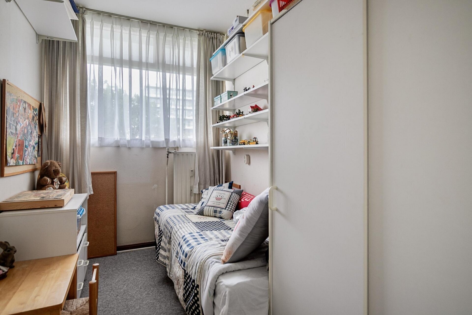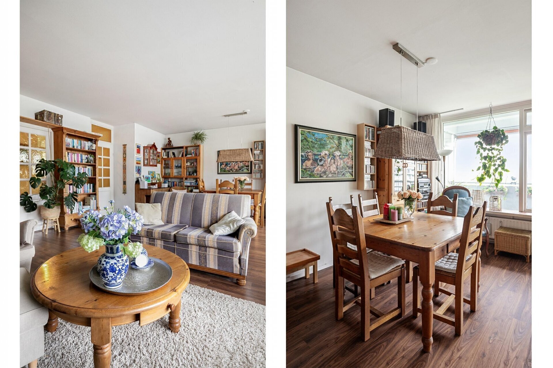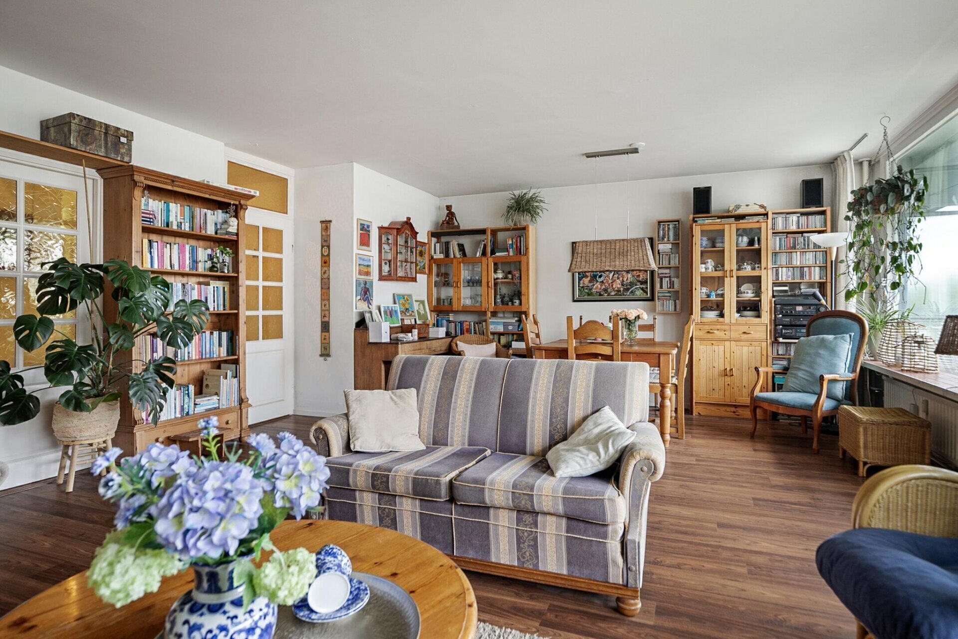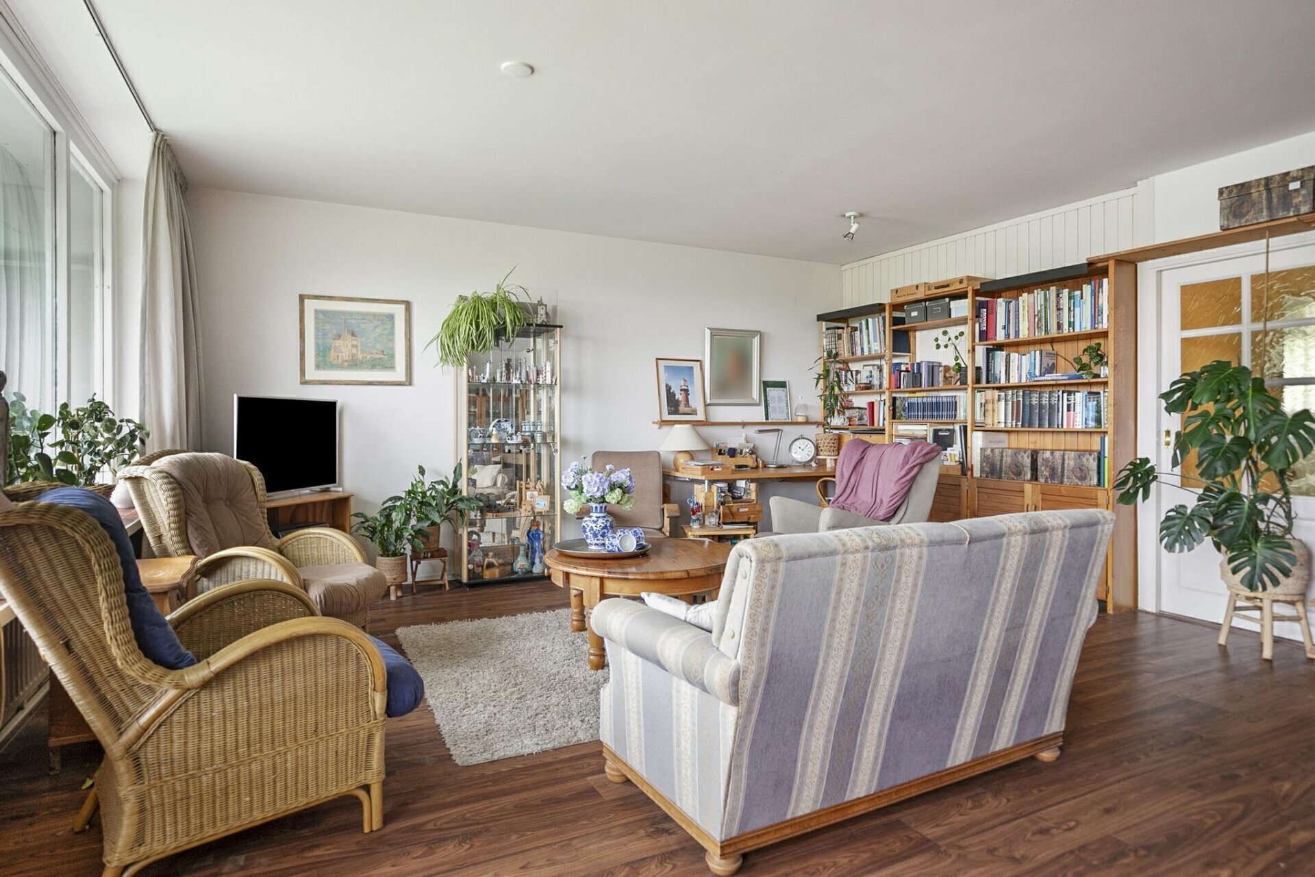 Royale woonkamer (met de mogelijkheid om een derde slaapkamer te herstellen) met grote glazen pui over de volledige breedte. Vanuit de woonkamer heb je toegang tot het balkon. Dit ligt op het zuidwesten en biedt een vrij uitzicht over de gemeenschappelijke tuin, waar je vanaf het middaguur tot laat in de avond van de zon kunt genieten. Over de gehele breedte is een elektrisch bedienbaar zonnescherm aanwezig.
