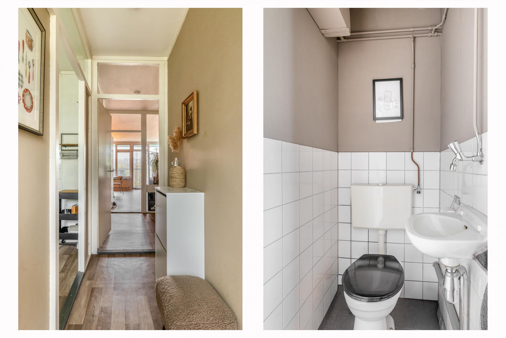 Het appartement telt twee slaapkamers. De grootste is ideaal als master bedroom en biedt ruimte voor een tweepersoonsbed en kledingkast. De tweede slaapkamer is perfect als logeerplek, thuiskantoor of hobbykamer. De badkamer is compact maar praktisch, met ligbad en douche, wastafel en aansluiting voor de wasmachine. Het toilet is separaat, wat prettig is voor het dagelijkse gebruik.