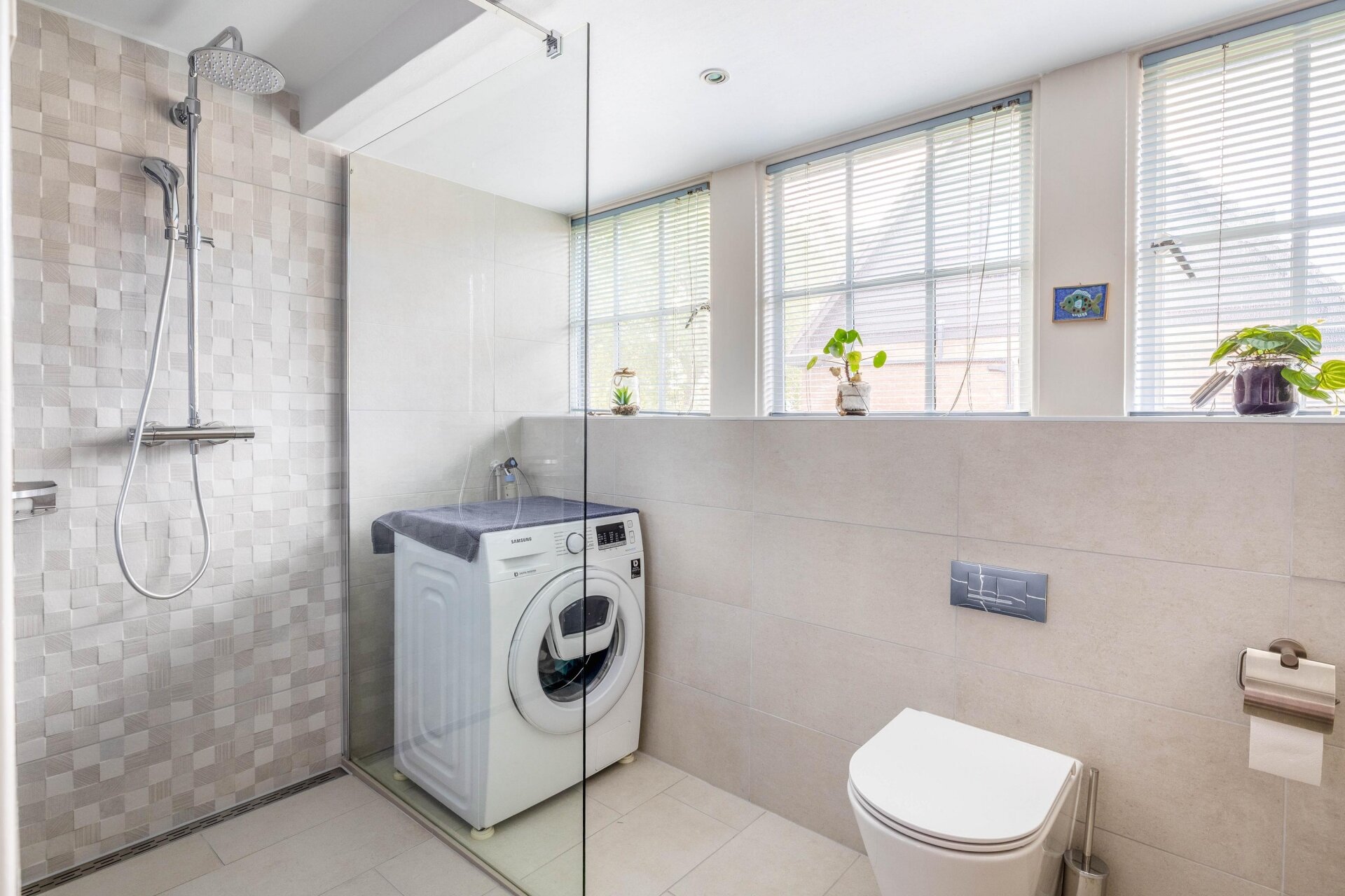 Hier bevinden zich drie ruime slaapkamers, een moderne badkamer met inloopdouche, wastafelmeubel en witgoedaansluiting, en een extra multifunctionele ruimte met vaste kastenwand – perfect als thuiskantoor, hobbykamer, speelkamer of een extra slaapkamer.