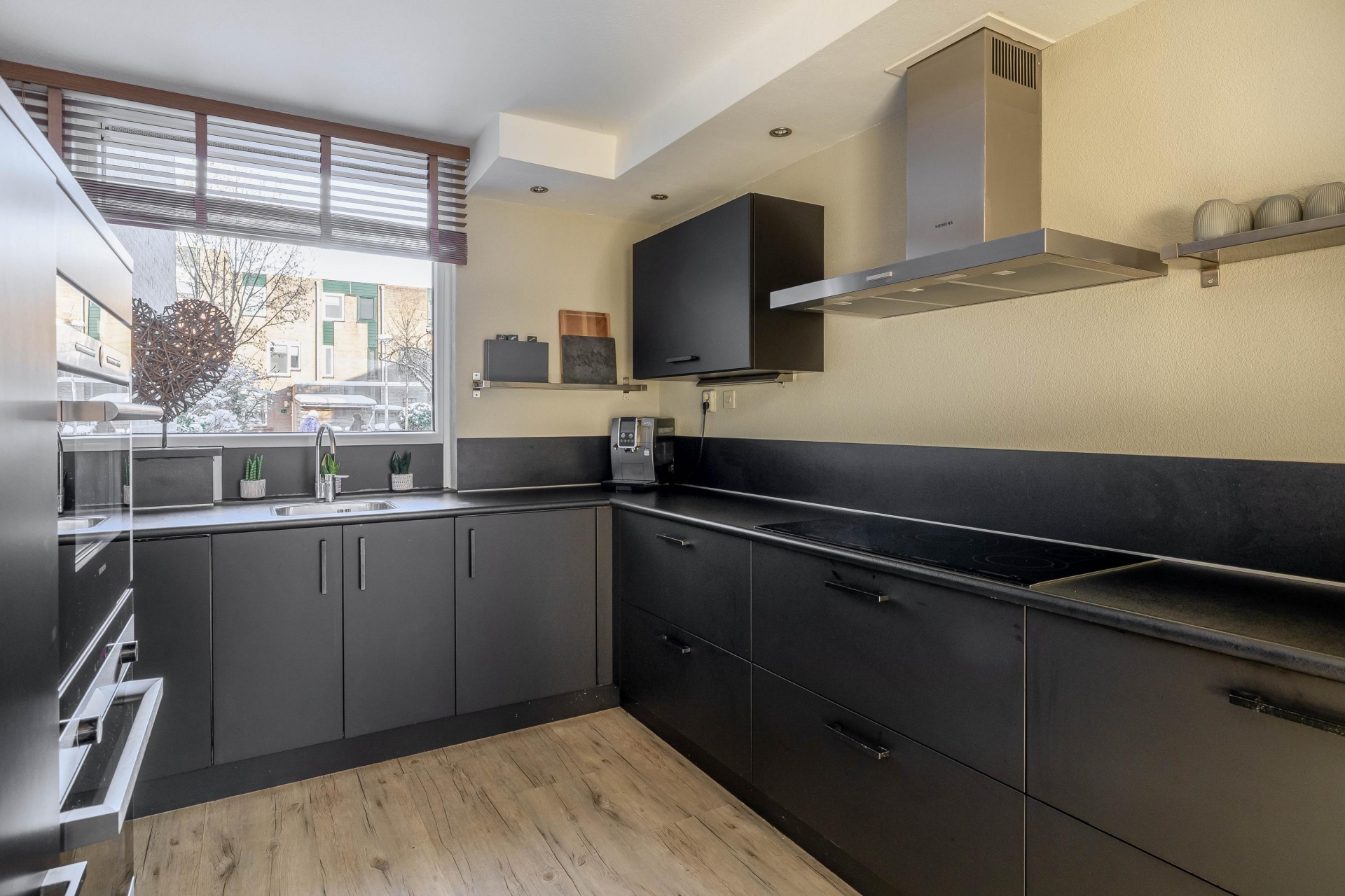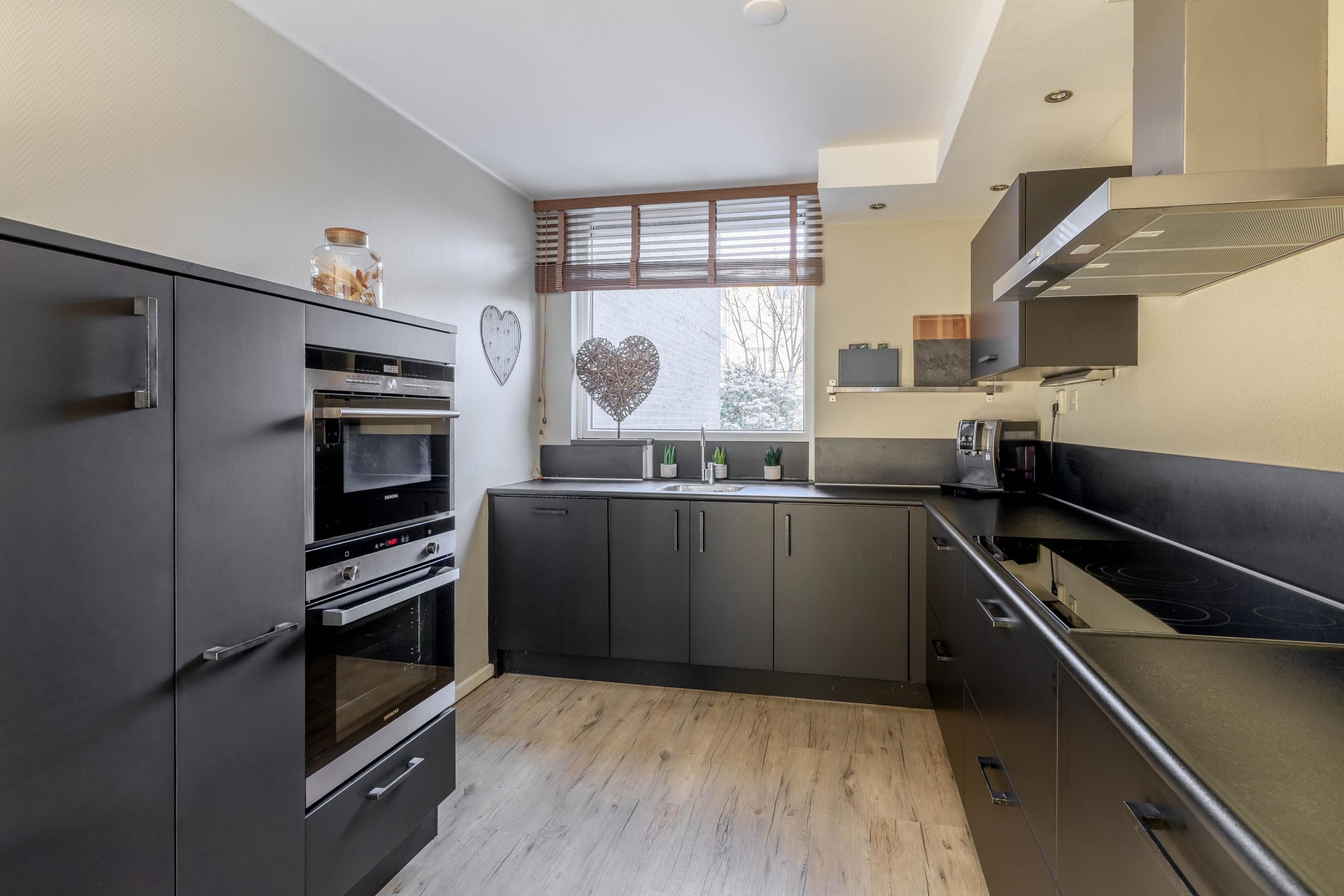 De zonovergoten woonkamer is ruim opgezet en gaat naadloos over in de keuken. De strak afgewerkte keuken is voorzien van diverse inbouwapparatuur (alles van siemens), waaronder een vaatwasser, keramischekookplaat met afzuigkap, inbouwkoelkast, oven en magnetron.