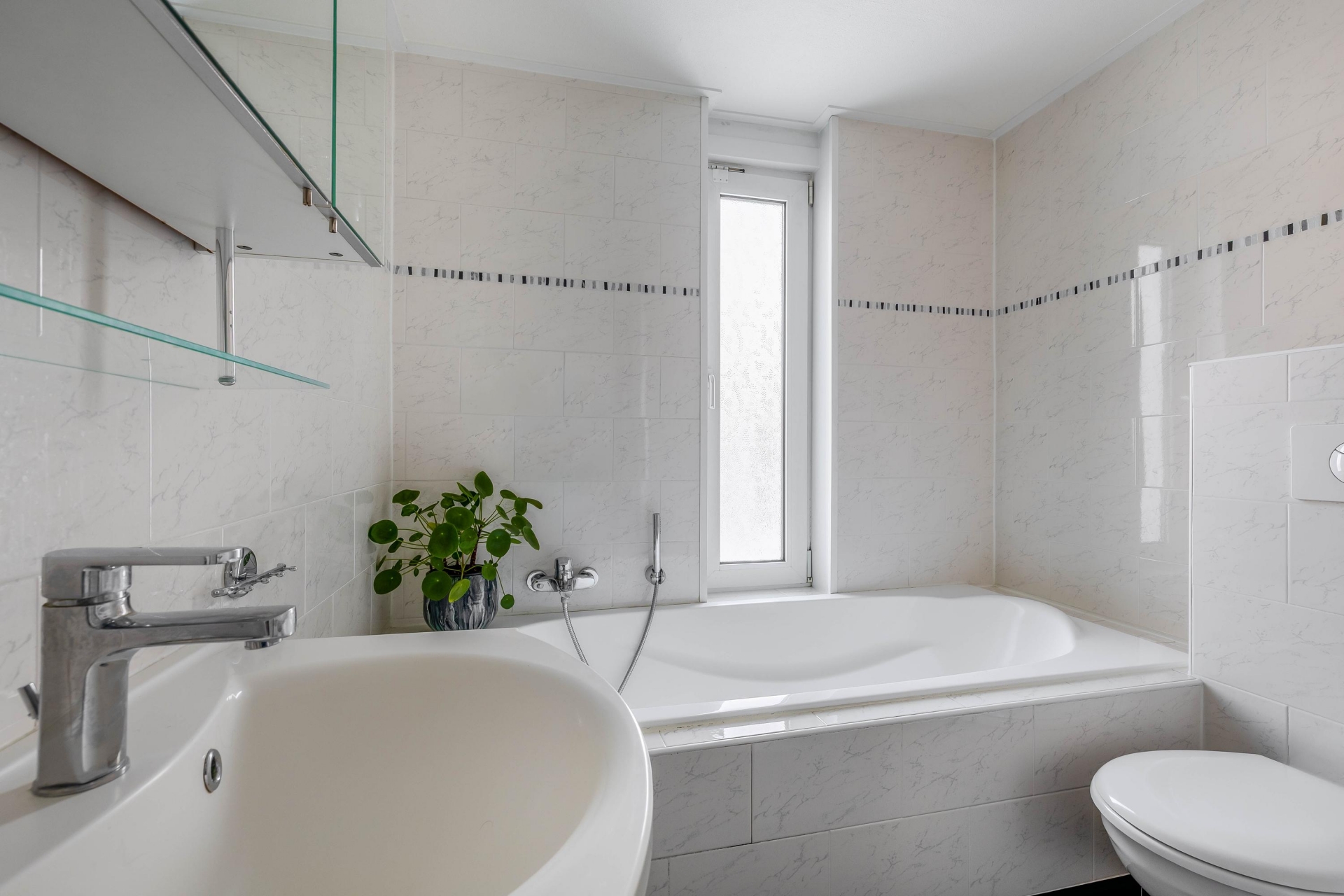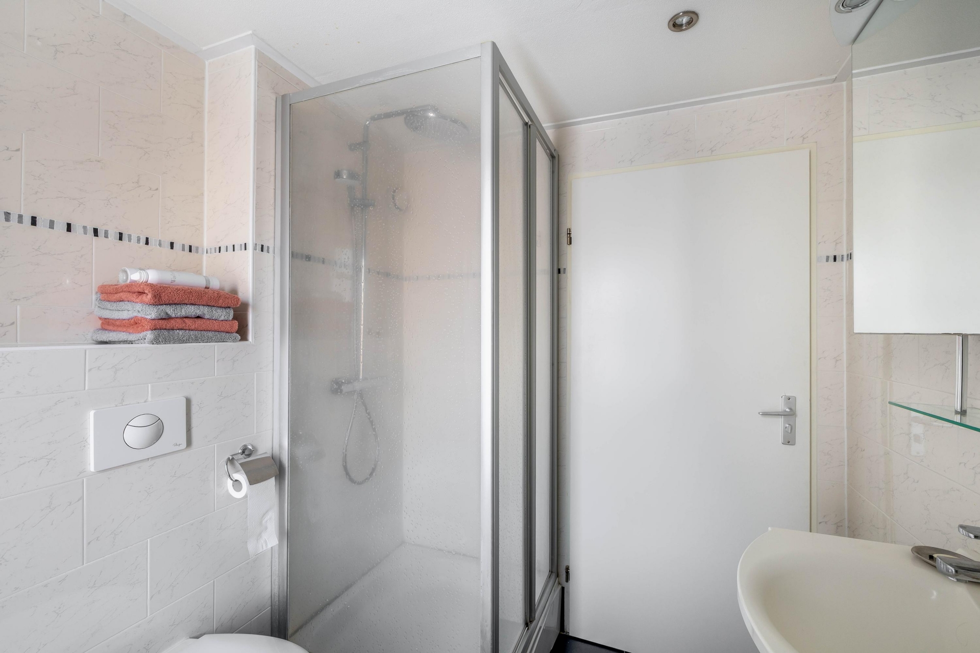 De badkamer is uitgerust met een inloopdouche, toilet, ligbad en wastafelmeubel.