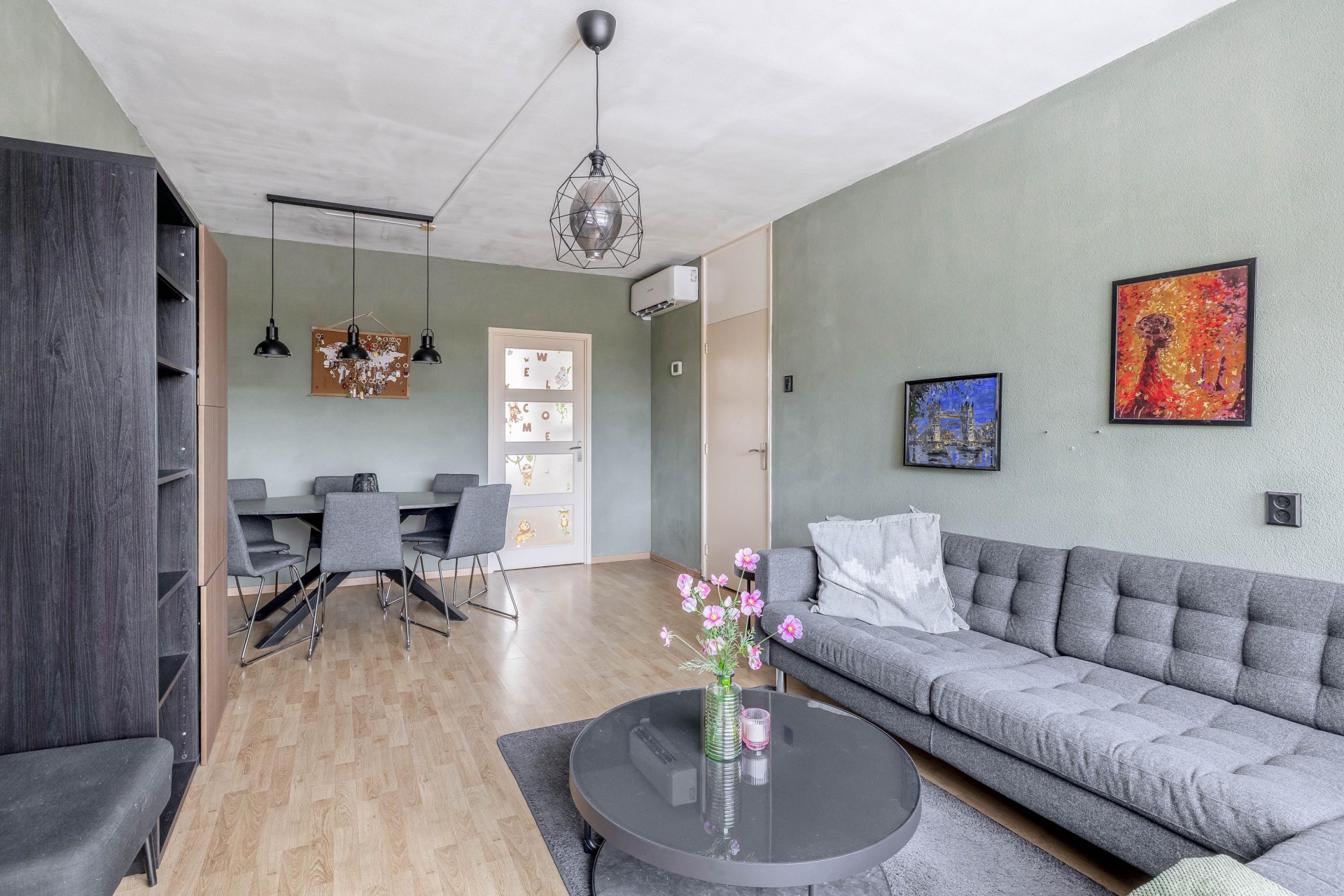 De ruime woonkamer is voorzien van een parketvloer, strak gestucte wanden en airconditioning (onderhouden in 2025), en biedt een prachtig uitzicht op het water.