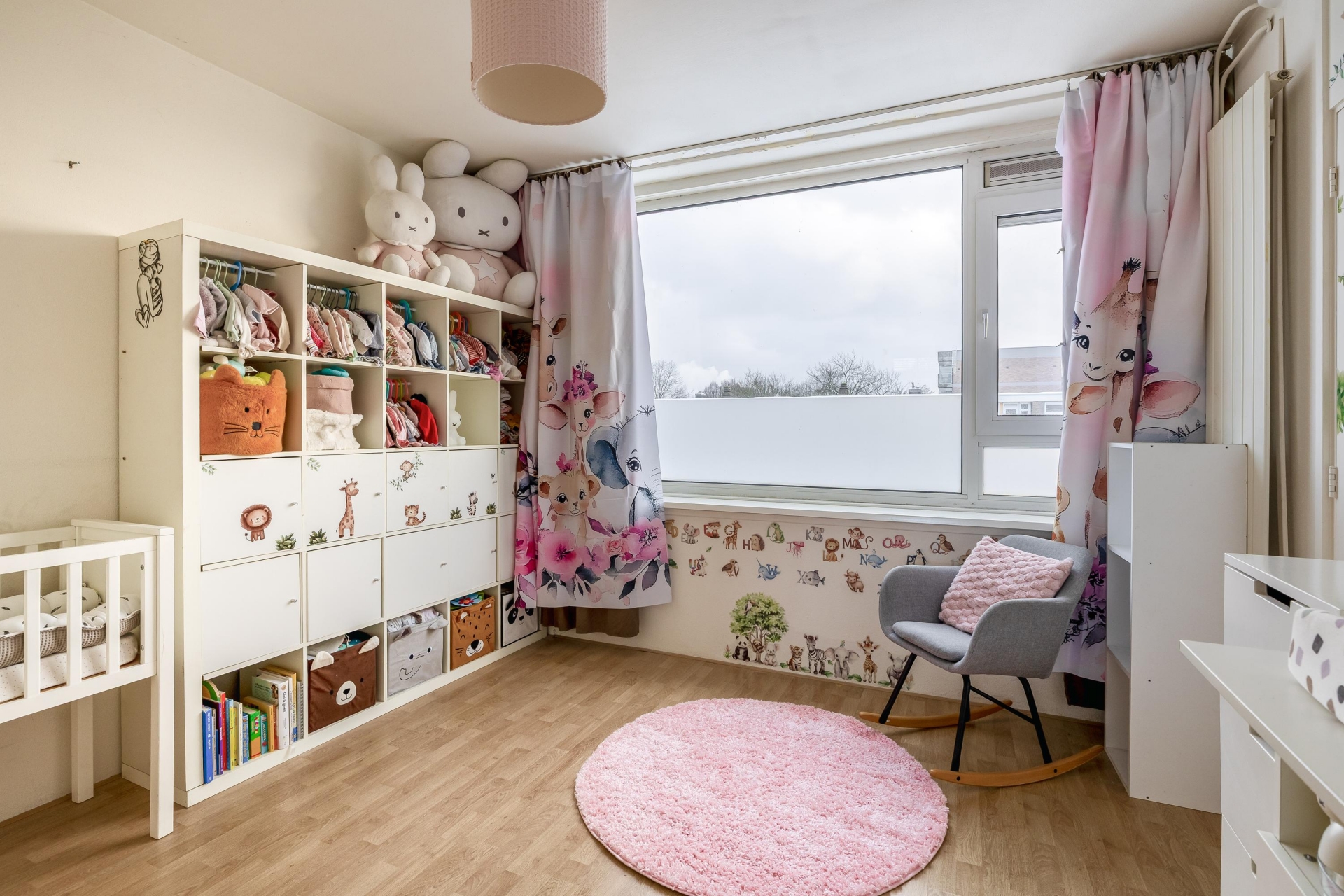 Slaapkamer 2: eveneens aan de voorzijde, met parketvloer, wasmachineaansluiting en een luxe kastenwand.