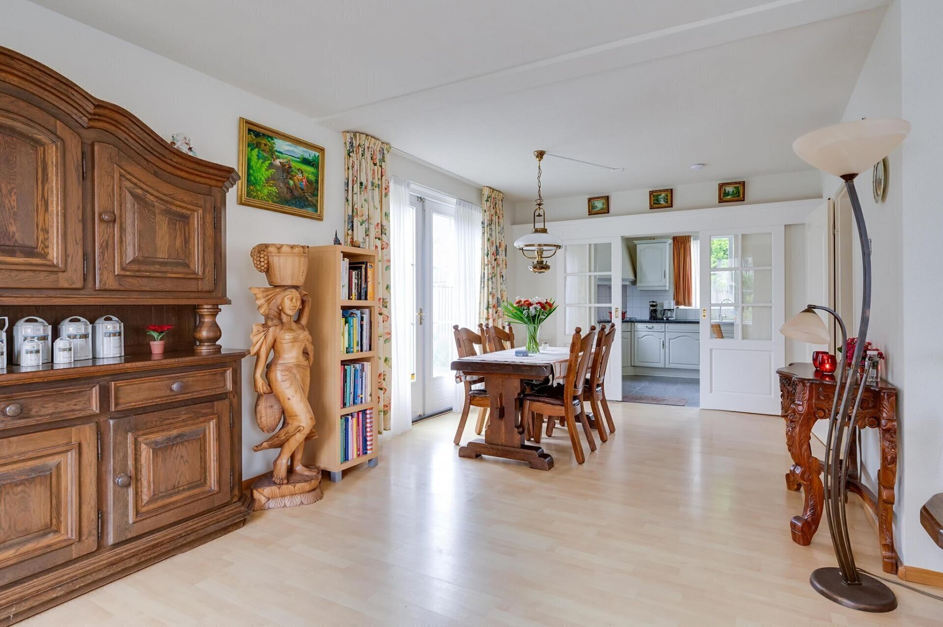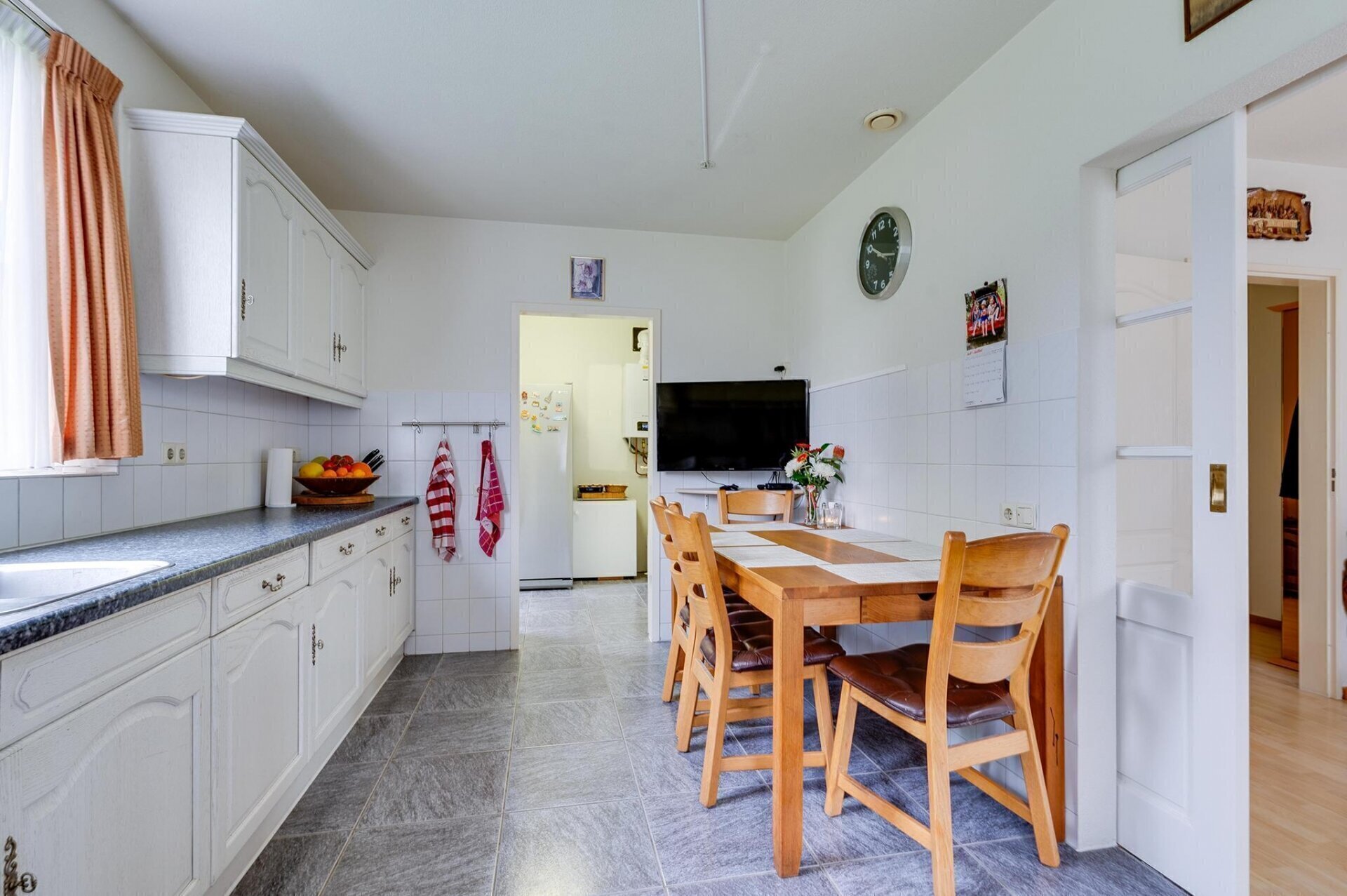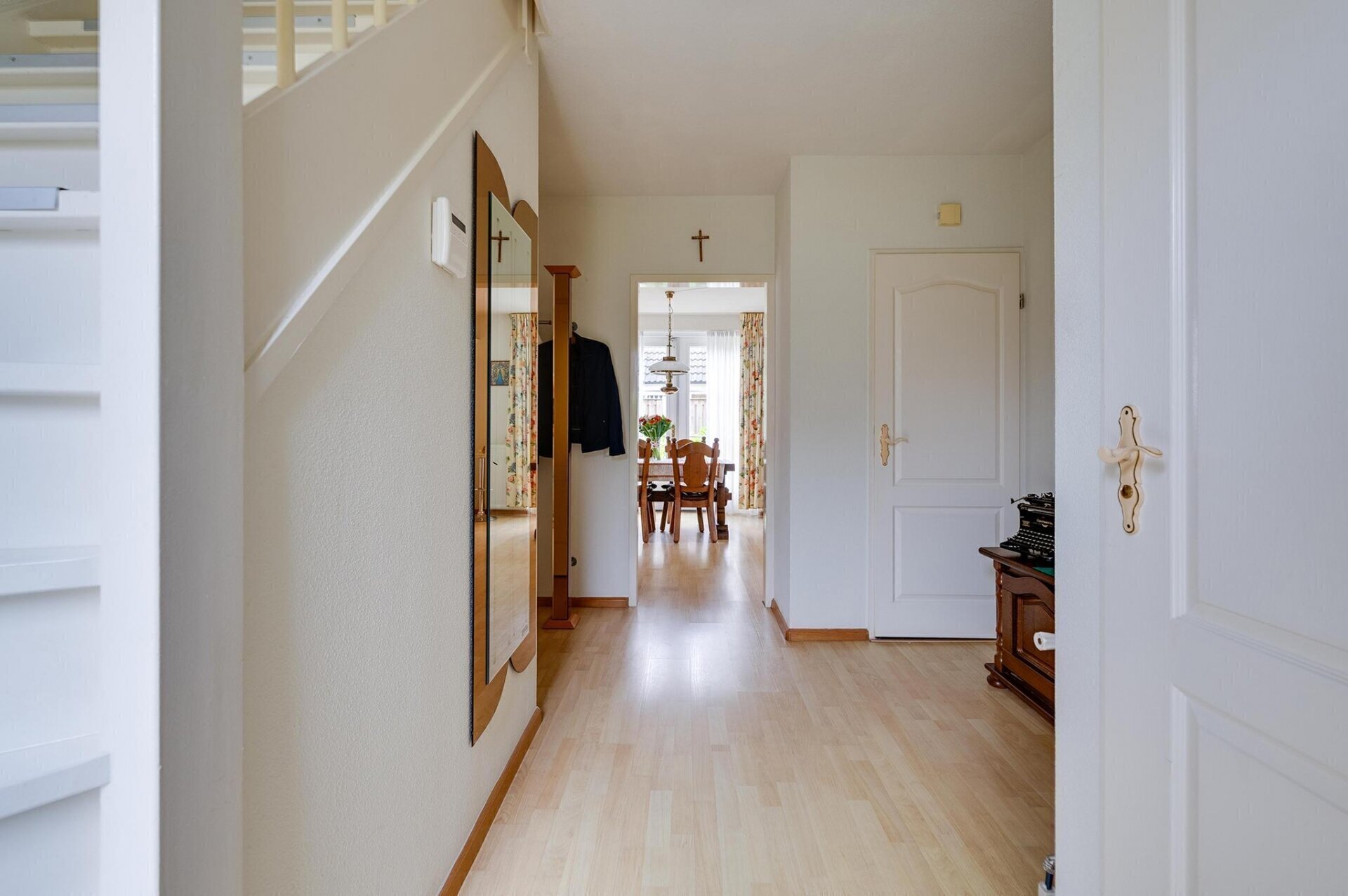 De woning is toegankelijk via de zij-entree, waar ook de doorgang naar de achtertuin en de vrijstaande garage zich bevinden. Bij binnenkomst kom je in een ruime hal met toegang tot verschillende vertrekken. Hier vind je de trap naar de eerste verdieping, het in 2023 vernieuwde toilet, en de deur naar de woonkamer. De royale woonkamer van meer dan 40 m² biedt een lichte en uitnodigende sfeer dankzij de grote ramen en openslaande tuindeuren. Met een ruim eetgedeelte is deze ruimte ideaal om te ontspannen en gasten te ontvangen. De keuken biedt volop werk- en opbergruimte en is van alle gemakken voorzien: een inbouwvaatwasser, koel-vriescombinatie, elektrische kookplaat, ingebouwd afzuigsysteem en een oven. De stijlvolle ensuite deuren maken het mogelijk de keuken af te sluiten wanneer gewenst. Direct aangrenzend bevindt zich een praktische bijkeuken, waar de cv-opstelling, wasmachine, droger en extra koel-vriescombinatie staan. Zowel vanuit de woonkamer als de bijkeuken heb je directe toegang tot de tuin. Bovendien zijn de keuken en bijkeuken voorzien van comfortabele vloerverwarming.