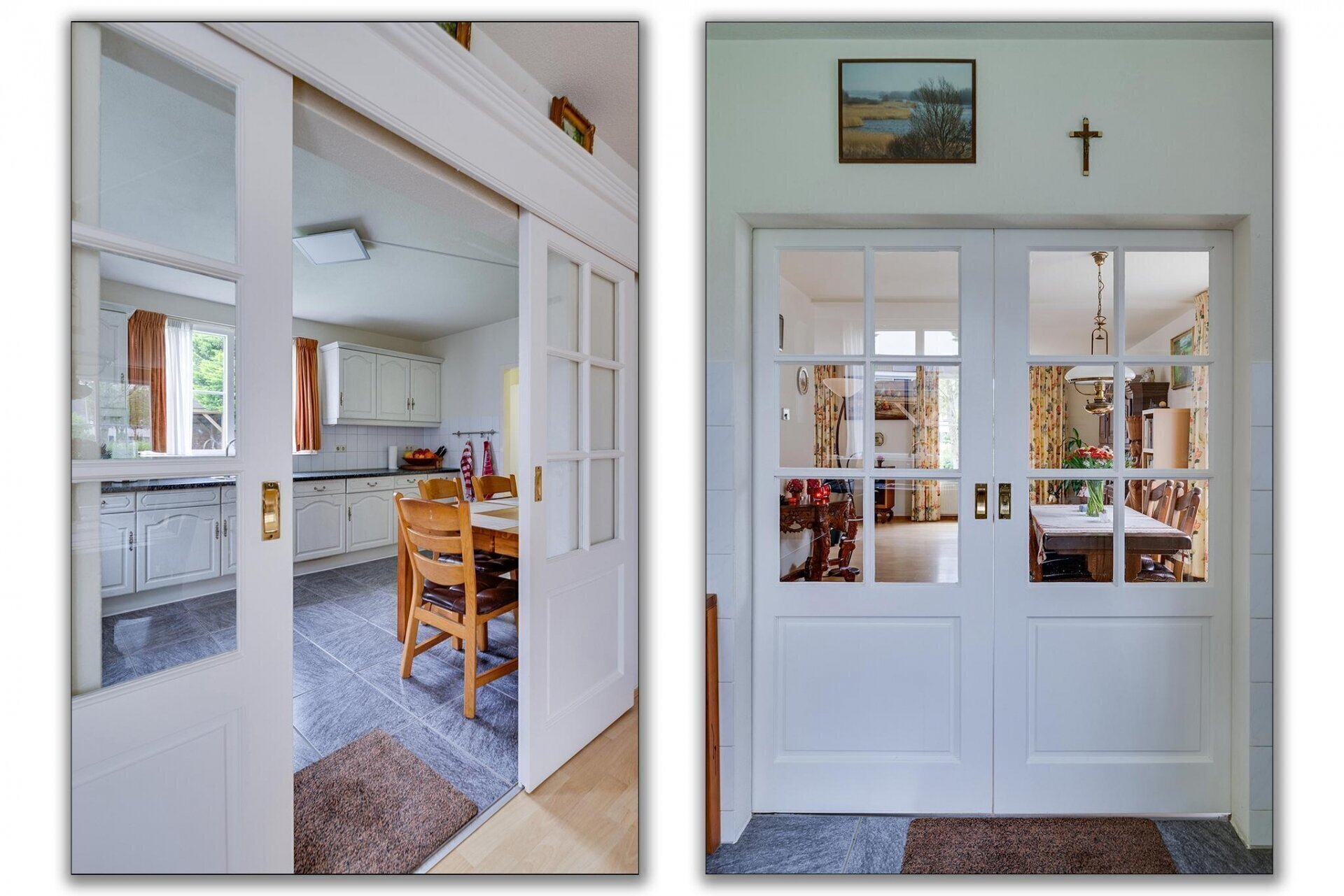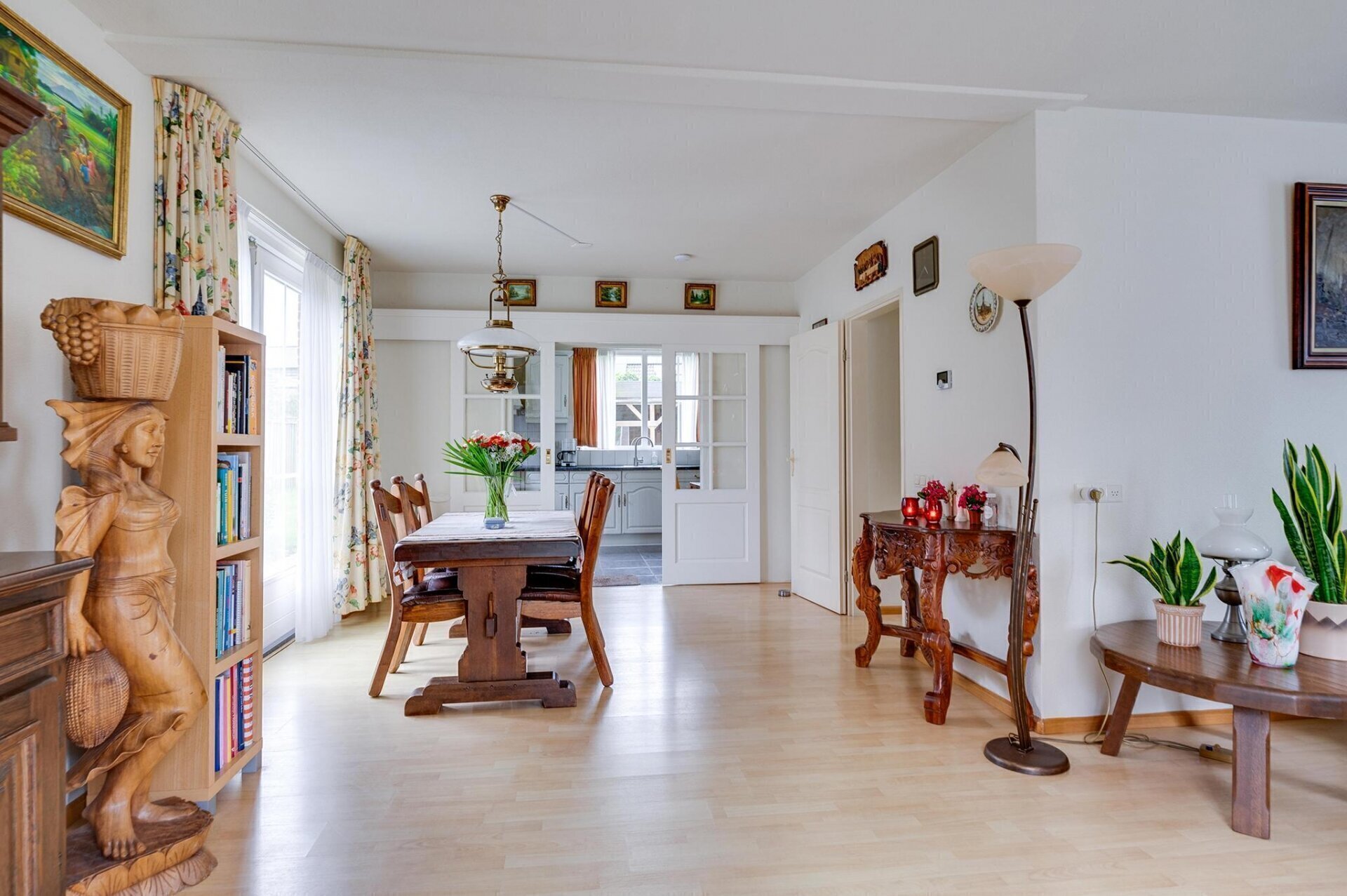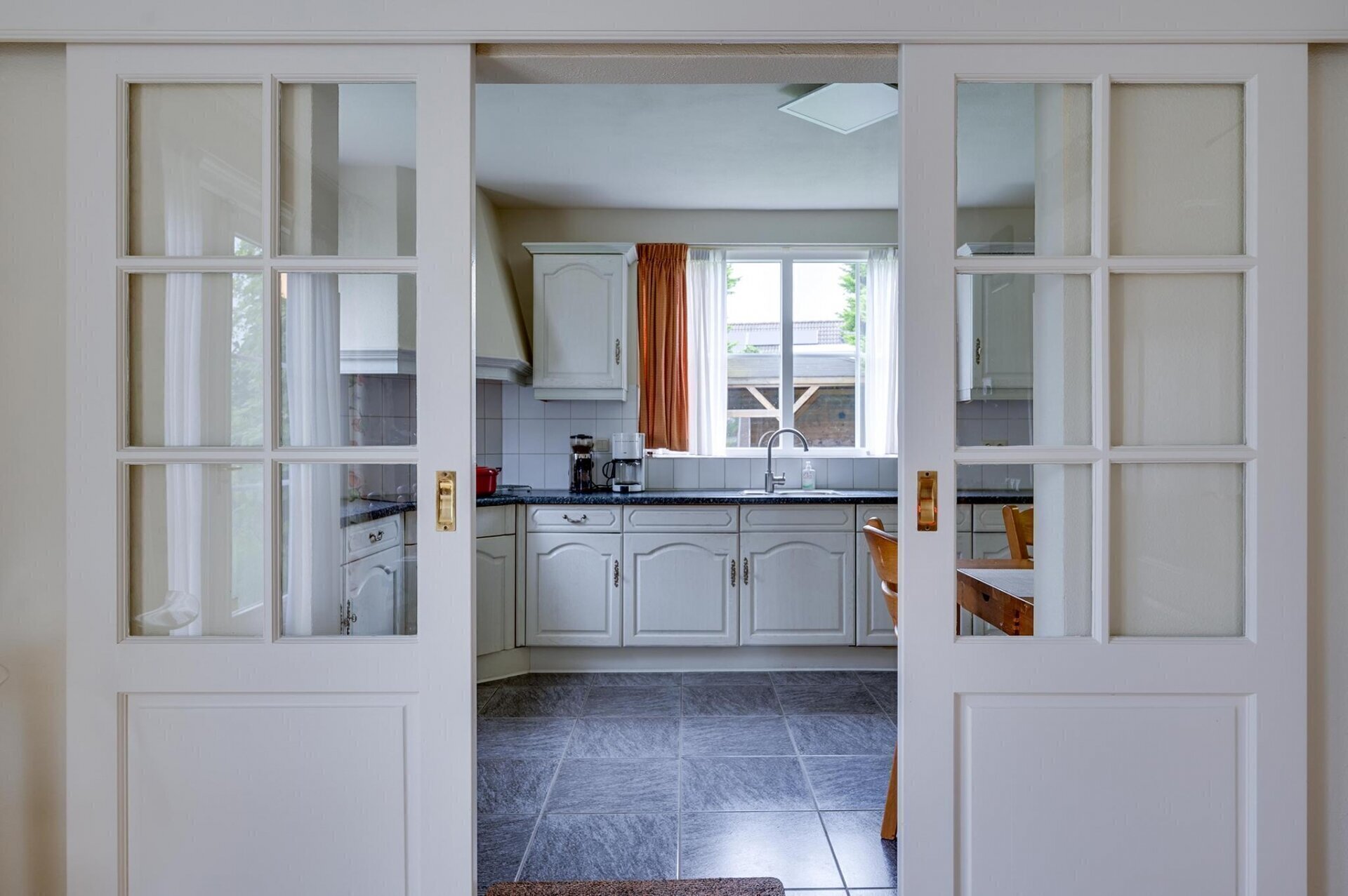 De woning is toegankelijk via de zij-entree, waar ook de doorgang naar de achtertuin en de vrijstaande garage zich bevinden. Bij binnenkomst kom je in een ruime hal met toegang tot verschillende vertrekken. Hier vind je de trap naar de eerste verdieping, het in 2023 vernieuwde toilet, en de deur naar de woonkamer. De royale woonkamer van meer dan 40 m² biedt een lichte en uitnodigende sfeer dankzij de grote ramen en openslaande tuindeuren. Met een ruim eetgedeelte is deze ruimte ideaal om te ontspannen en gasten te ontvangen. De keuken biedt volop werk- en opbergruimte en is van alle gemakken voorzien: een inbouwvaatwasser, koel-vriescombinatie, elektrische kookplaat, ingebouwd afzuigsysteem en een oven. De stijlvolle ensuite deuren maken het mogelijk de keuken af te sluiten wanneer gewenst. Direct aangrenzend bevindt zich een praktische bijkeuken, waar de cv-opstelling, wasmachine, droger en extra koel-vriescombinatie staan. Zowel vanuit de woonkamer als de bijkeuken heb je directe toegang tot de tuin. Bovendien zijn de keuken en bijkeuken voorzien van comfortabele vloerverwarming.