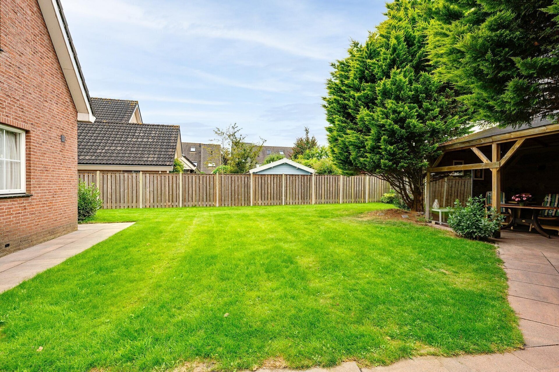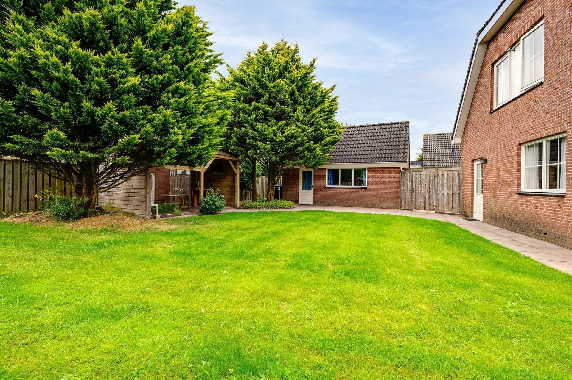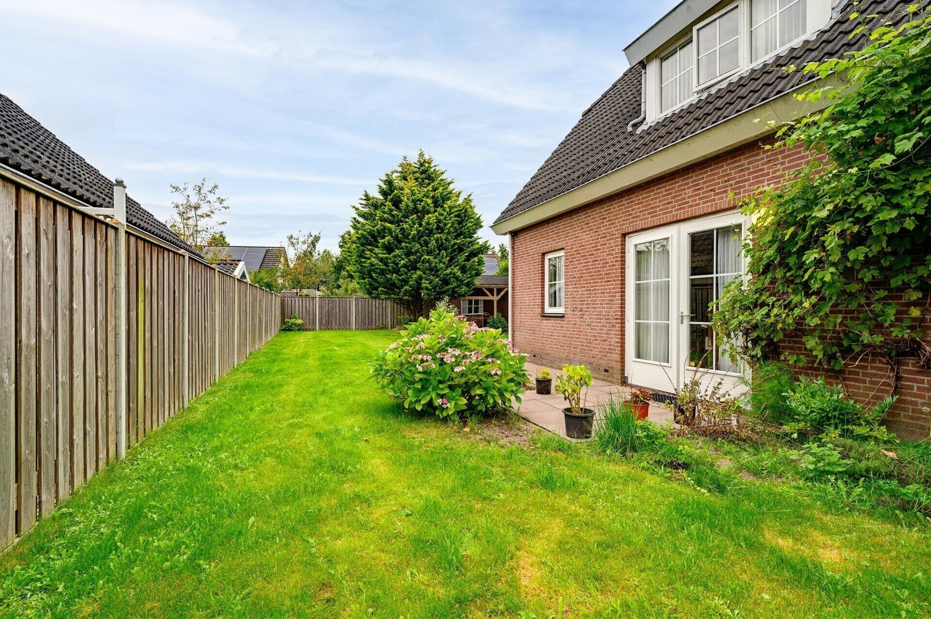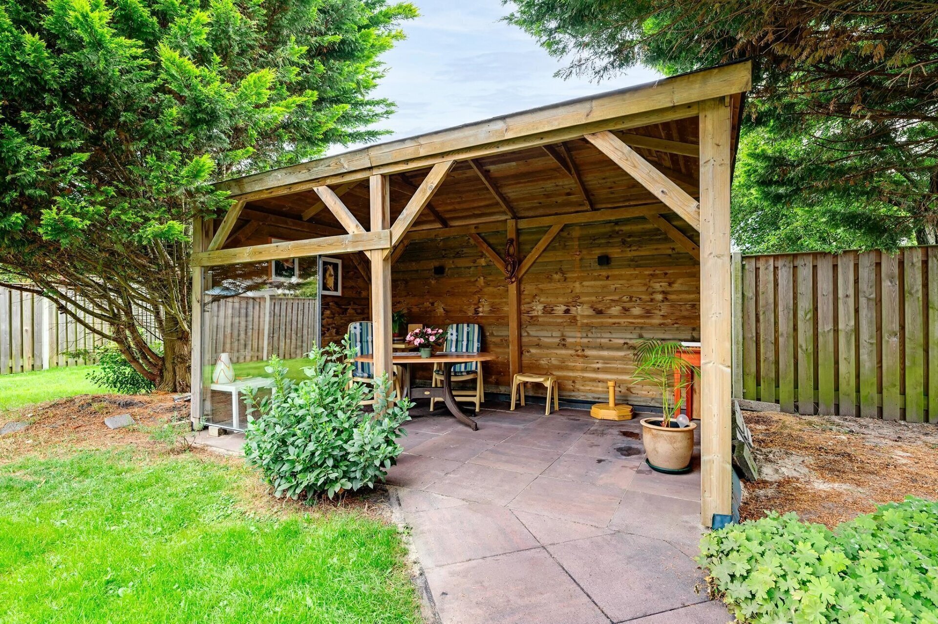 Een van de grote troeven van deze woning is de prachtige tuin, gelegen op het westen. Met ruimte rondom de woning is er altijd een plek in de zon of schaduw te vinden. De overkapping in de tuin maakt het mogelijk om ook bij minder goed weer van de buitenlucht te genieten. De tuin biedt daarnaast volop mogelijkheden voor liefhebbers van groen en tuinieren.