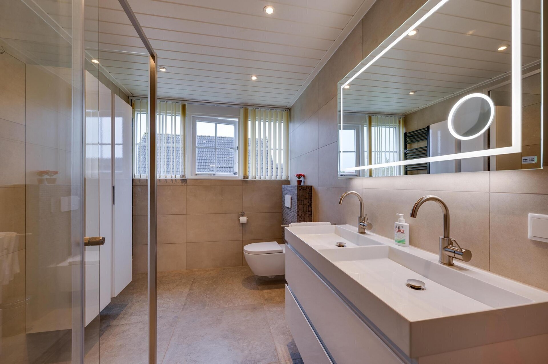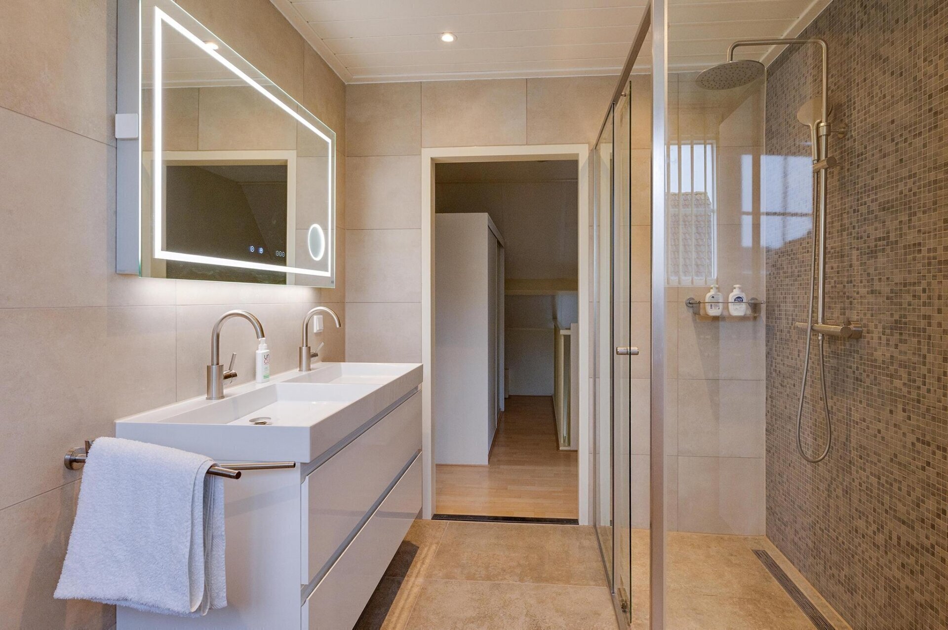 De badkamer is in 2023 volledig vernieuwd en straalt luxe uit. De ruimte is voorzien van een moderne inloopdouche met regendouche, een toilet, dubbele wastafels, een verwarmde spiegel met verlichting, en ingebouwde spots.
