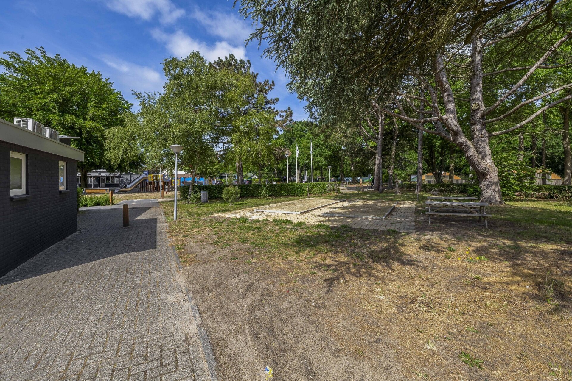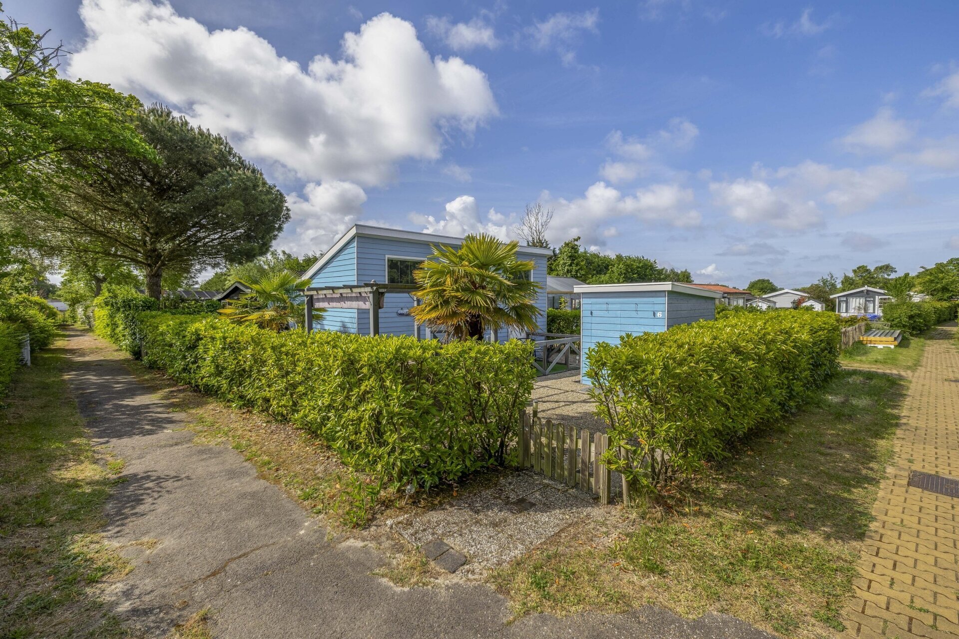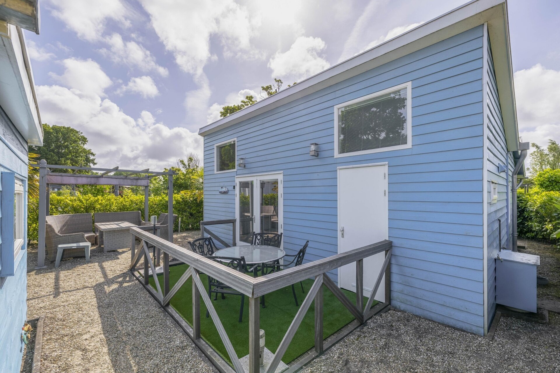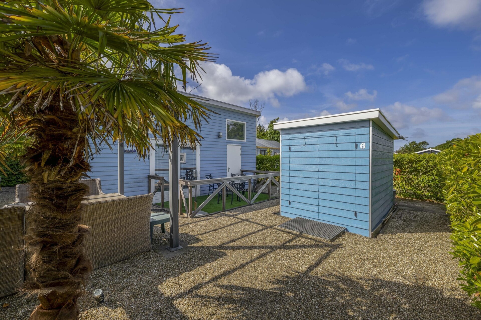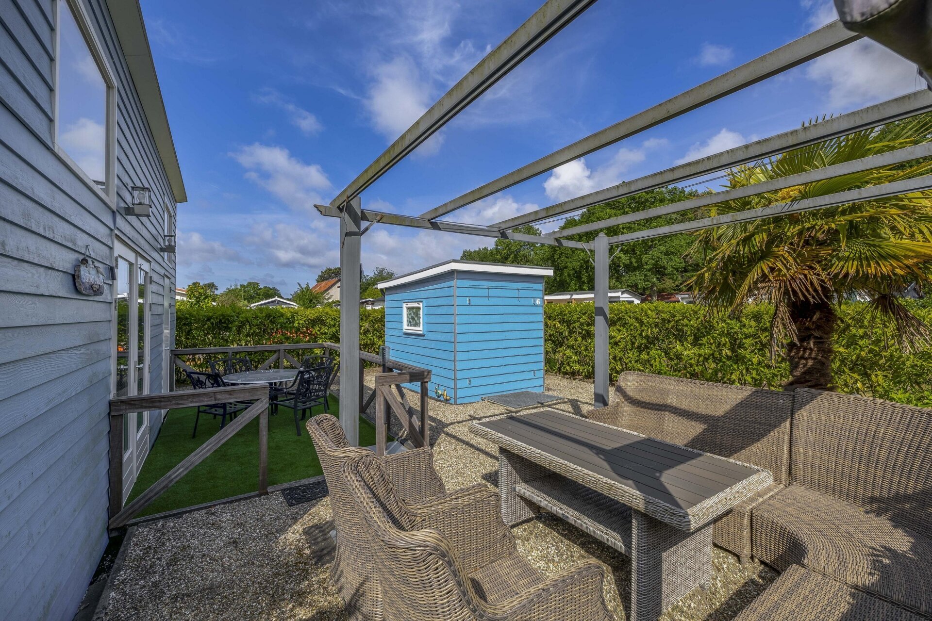 Buiten is het minstens zo fijn als binnen. De tuin is onderhoudsarm aangelegd met grind, beplanting (waaronder palmbomen) en een gezellige zithoek onder een pergola. Perfect om lekker buiten te ontbijten, borrelen of gewoon een boek te lezen. Bij deze fijne vakantiehuis staat een ruime houten berging met stroomvoorziening, extra koel/vriescombinatie en volop opbergruimte voor fietsen, tuinspullen of gereedschap.