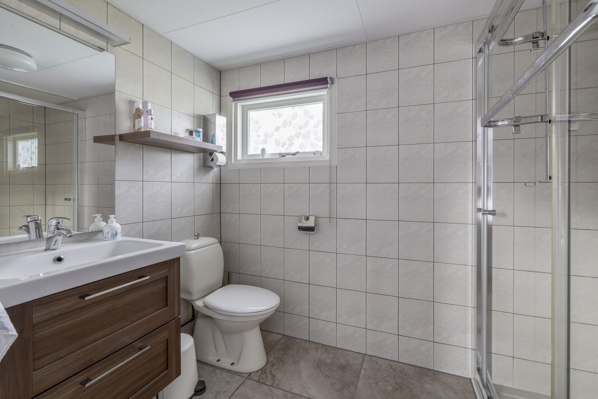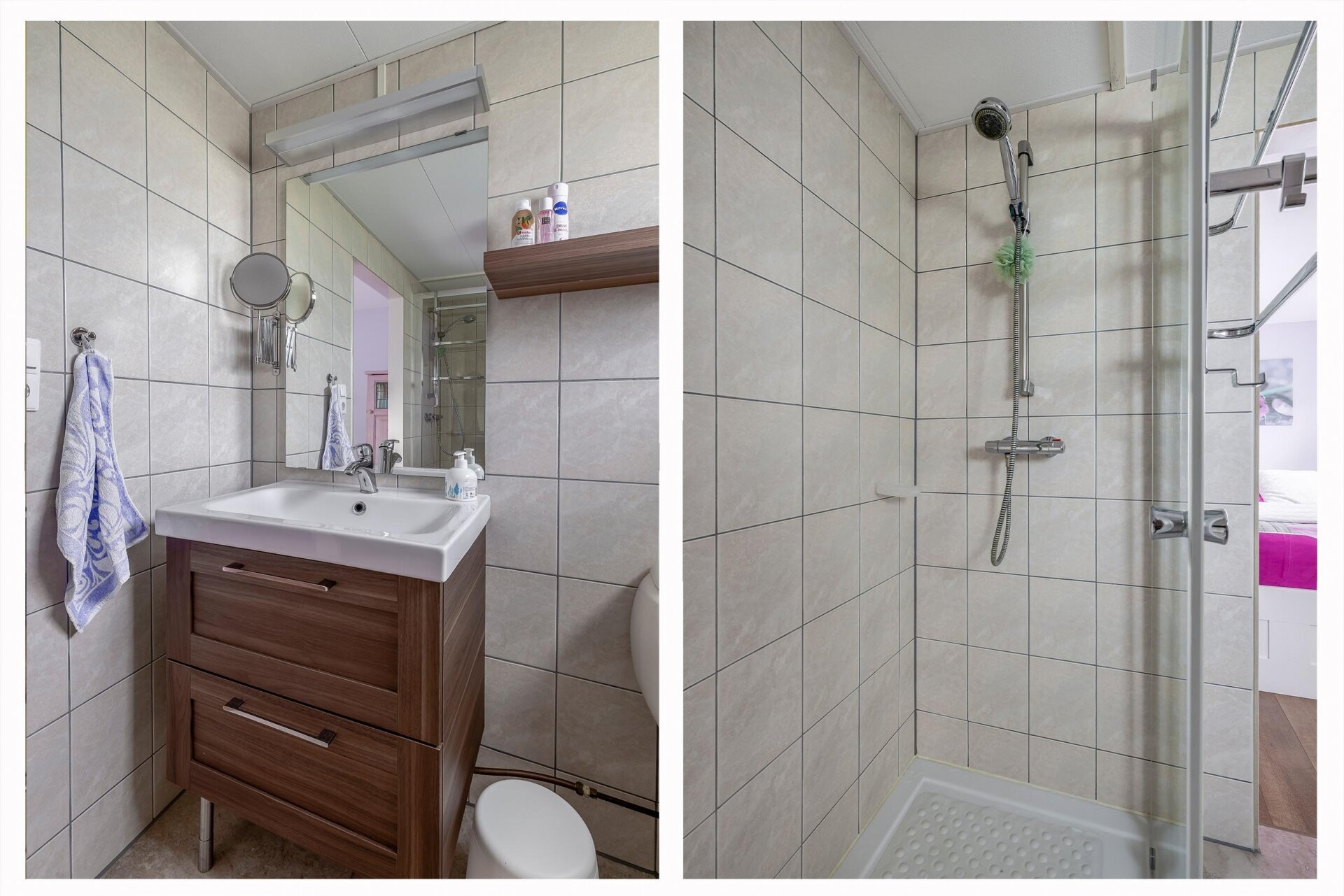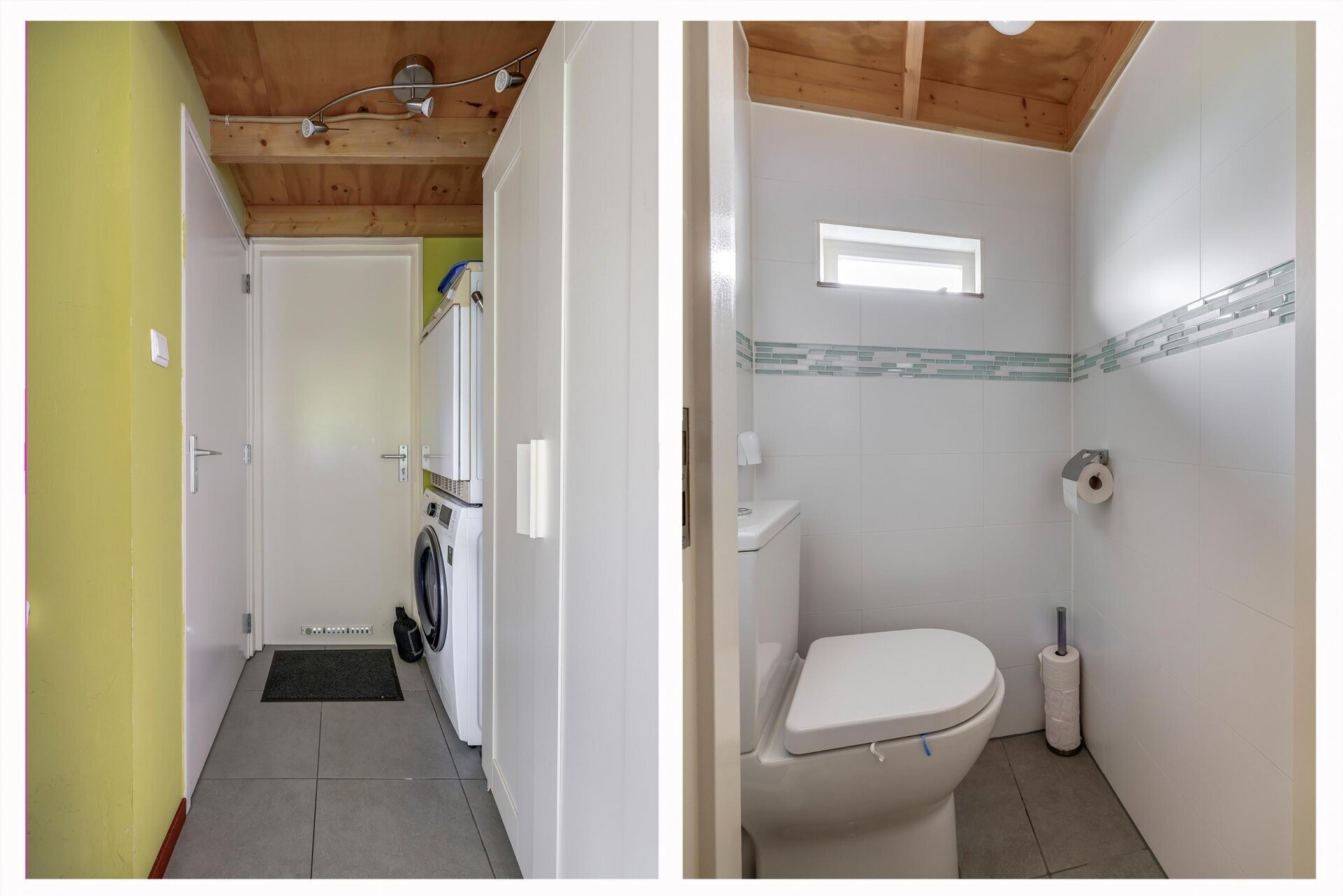 De woning beschikt over twee slaapkamers. De ouderslaapkamer is royaal en voorzien van een eigen badkamer met inloopdouche, wastafel en toilet – ideaal voor comfort en privacy. De tweede slaapkamer is ingericht als logeerkamer met twee bedden. Daarnaast is er een praktische bijkeuken met wasmachine, droger en een tweede toilet voor gasten. Boven de leefruimte vind je een vide – perfect als extra opbergruimte, extra slaapplek of speelhoek.