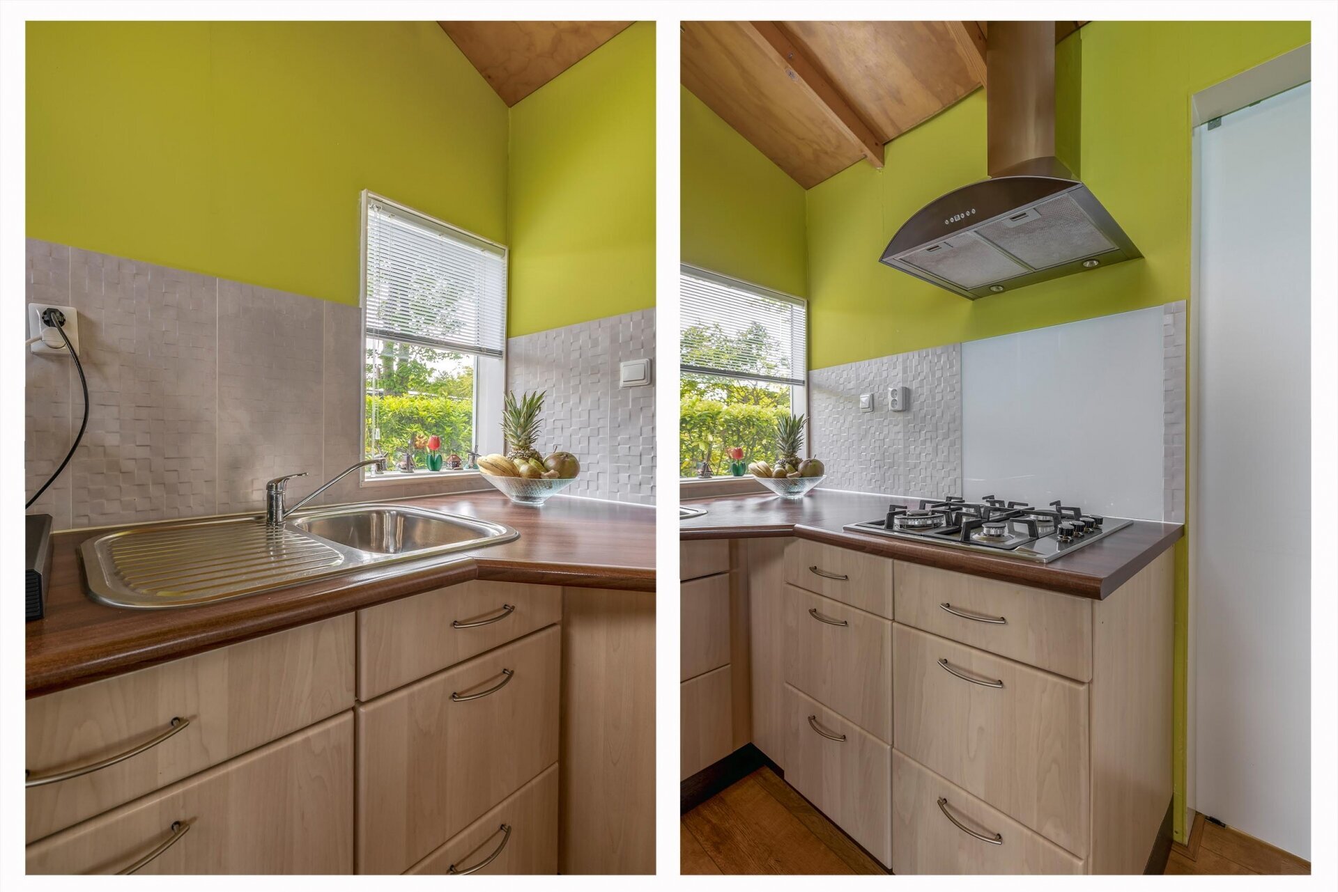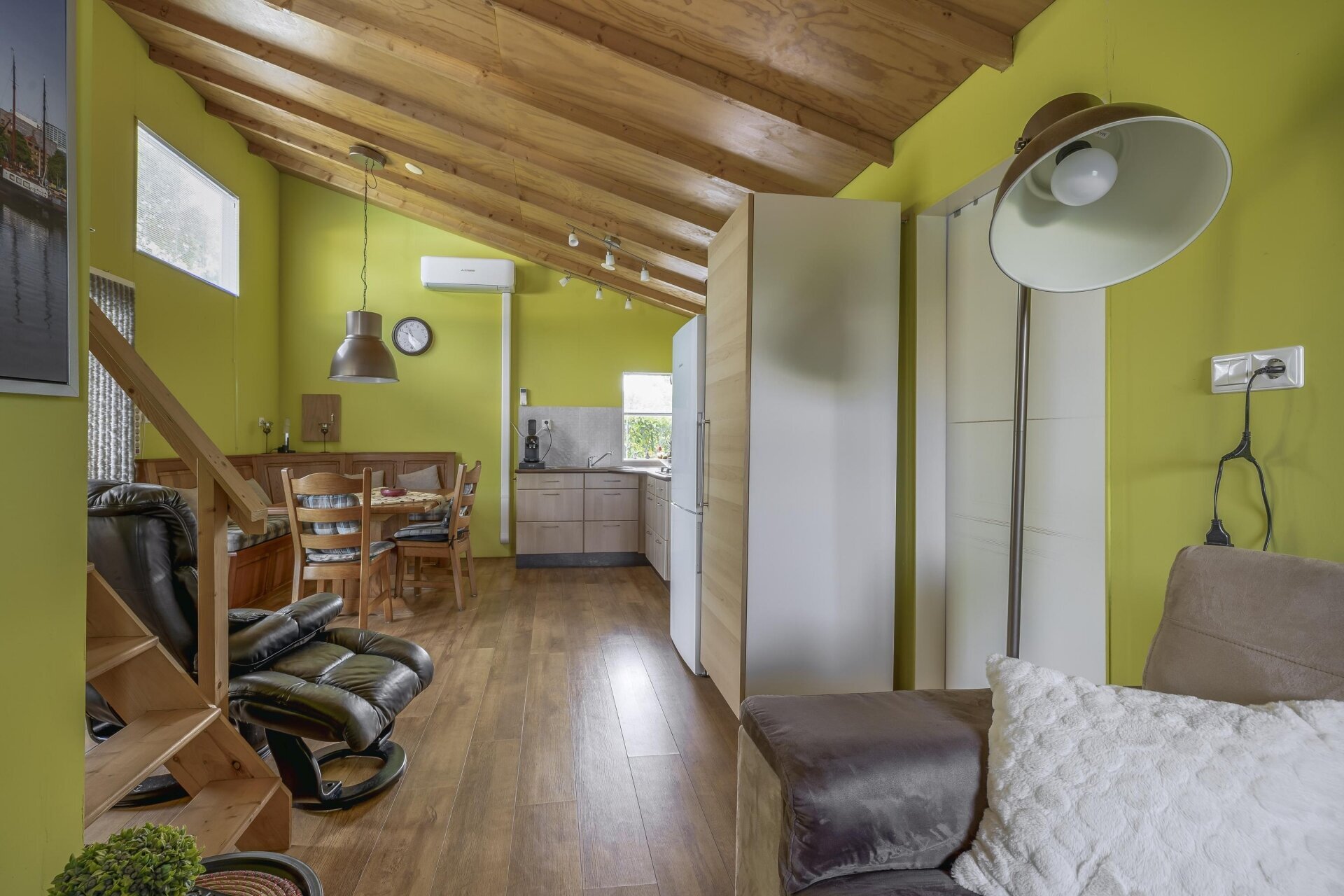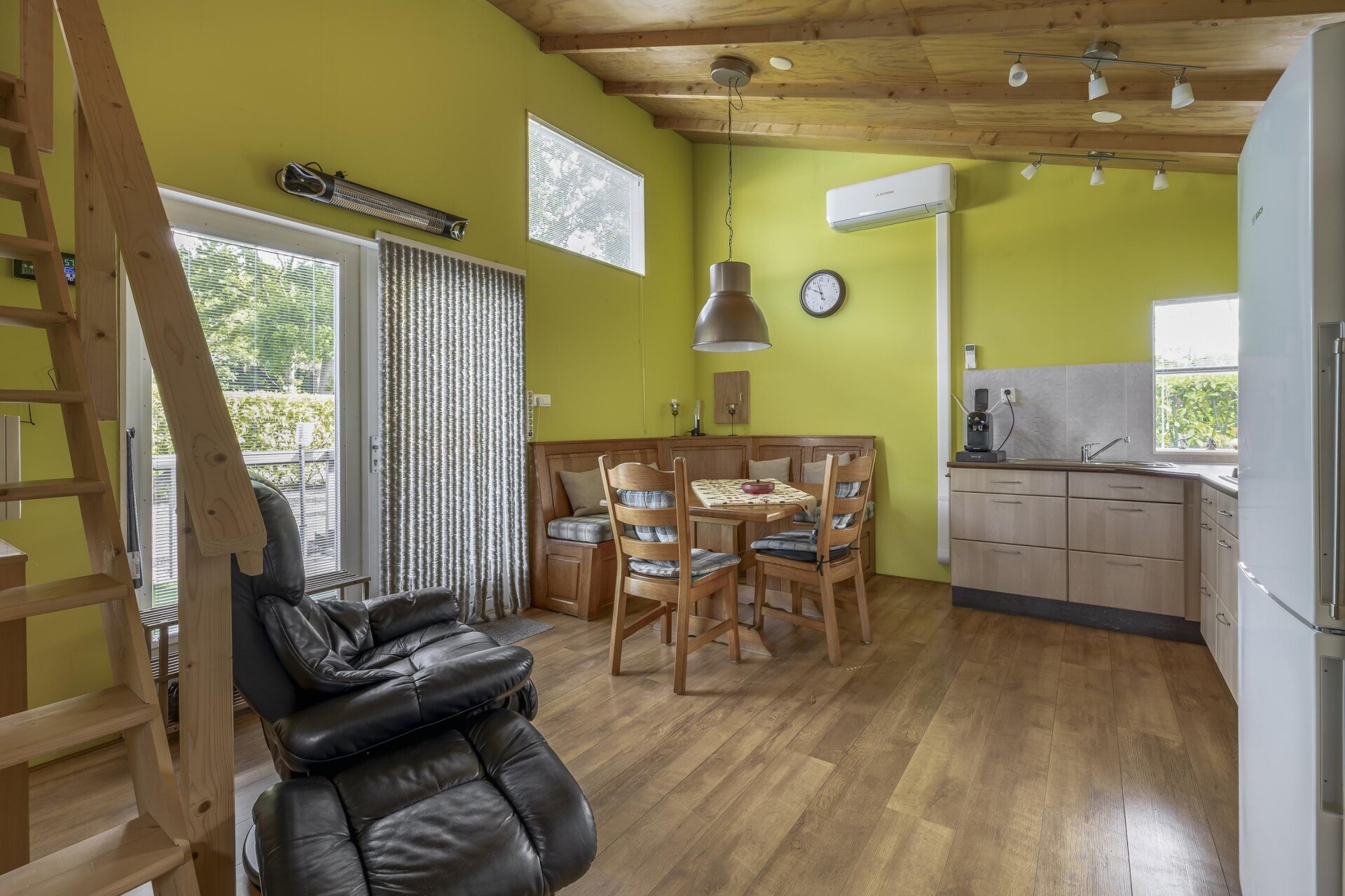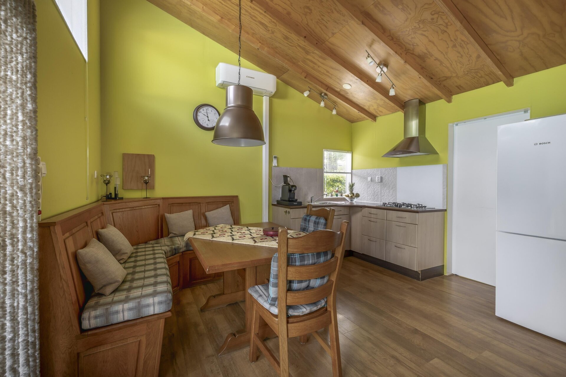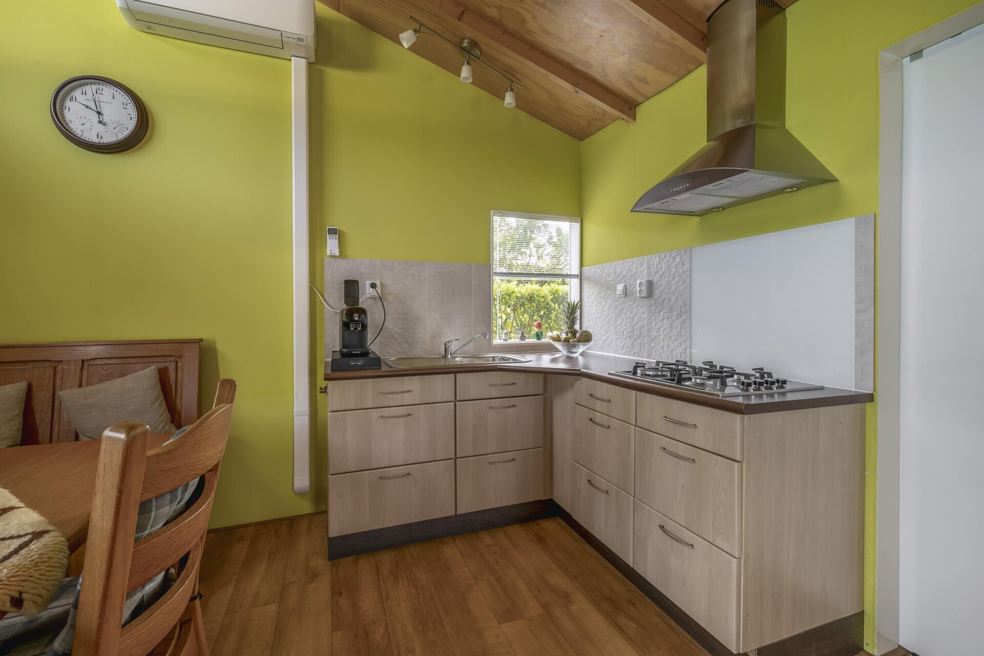 De keuken is netjes en compleet: gaskookplaat, afzuigkap, koel-/vriescombinatie en een 80-liter boiler zorgen dat je nergens aan hoeft te denken. Een krachtige airco met inverterfunctie (verwarmen én koelen) houdt het hele jaar door het binnenklimaat aangenaam.