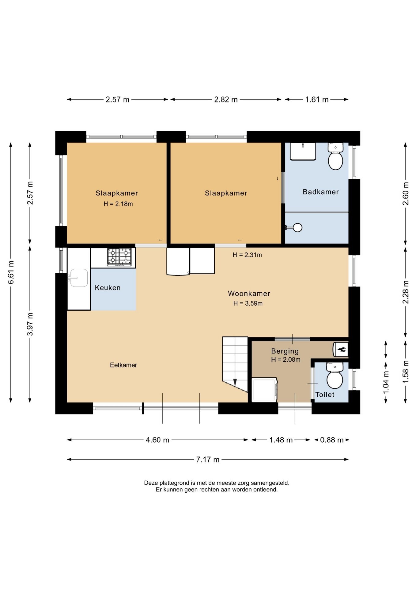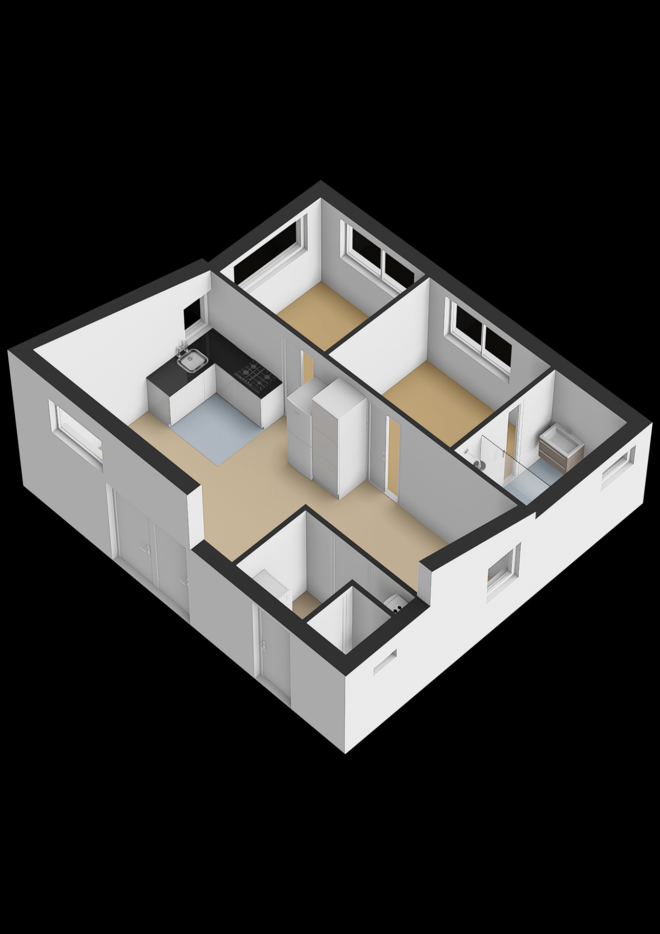 - 3 kamers (woonkamer + 2 slaapkamers)