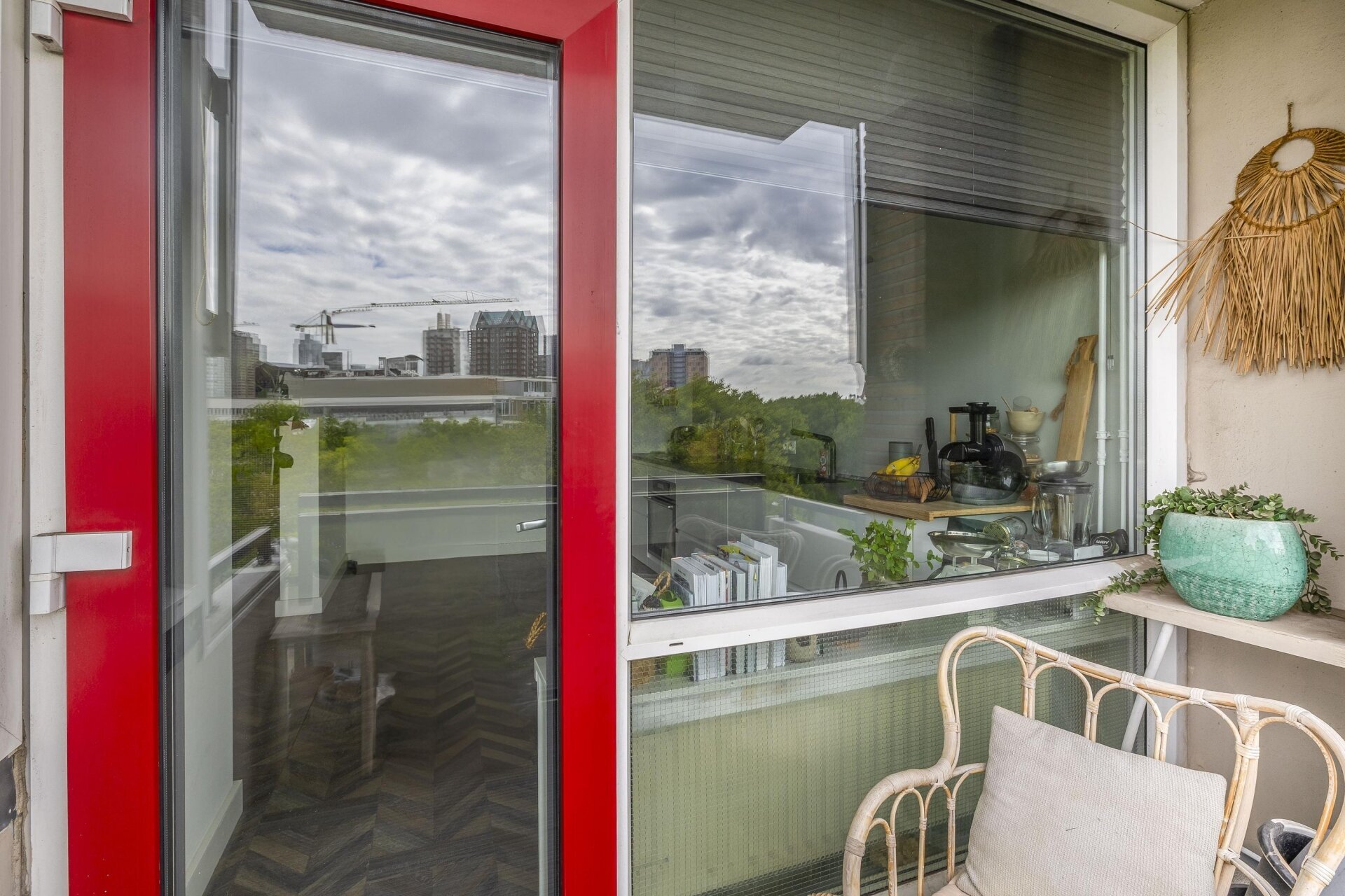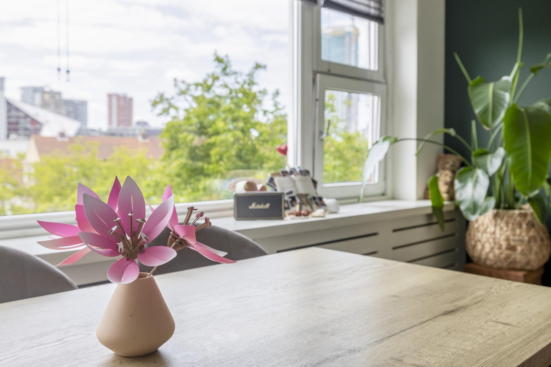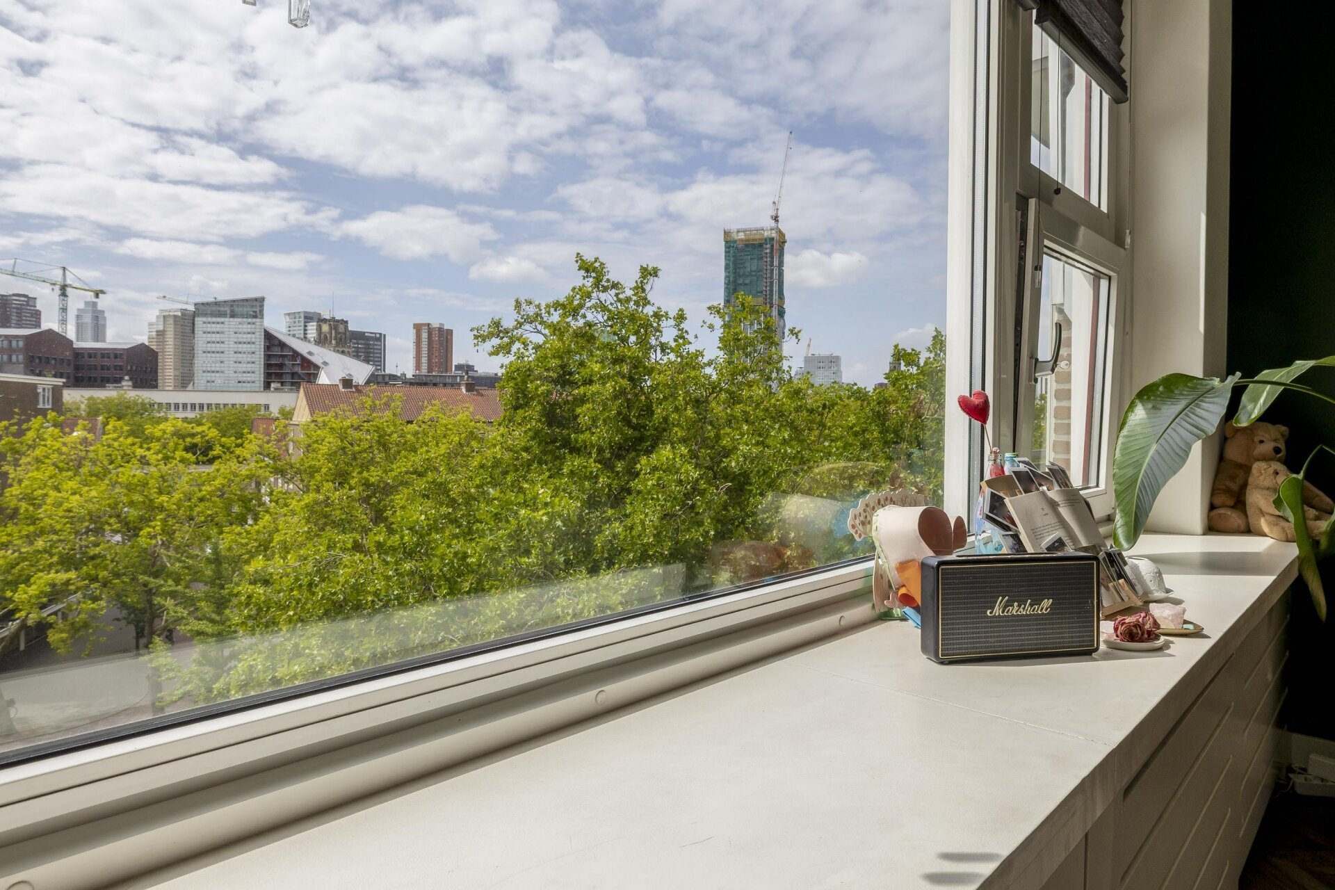 Dankzij de ligging op de vijfde verdieping is het niet alleen lekker licht in huis, je hebt ook een verrassend vrij uitzicht over de stad. Het balkon op het zuiden is een heerlijke plek voor een kop koffie in de ochtend of een drankje in de middagzon. Vanuit de woonkamer kijk je zo naar buiten en geniet je van het stadse leven, zonder dat het overweldigend aanvoelt. Het balkon is groot genoeg voor een kleine zithoek en wat groen, zodat je ook buiten je eigen fijne plek hebt.