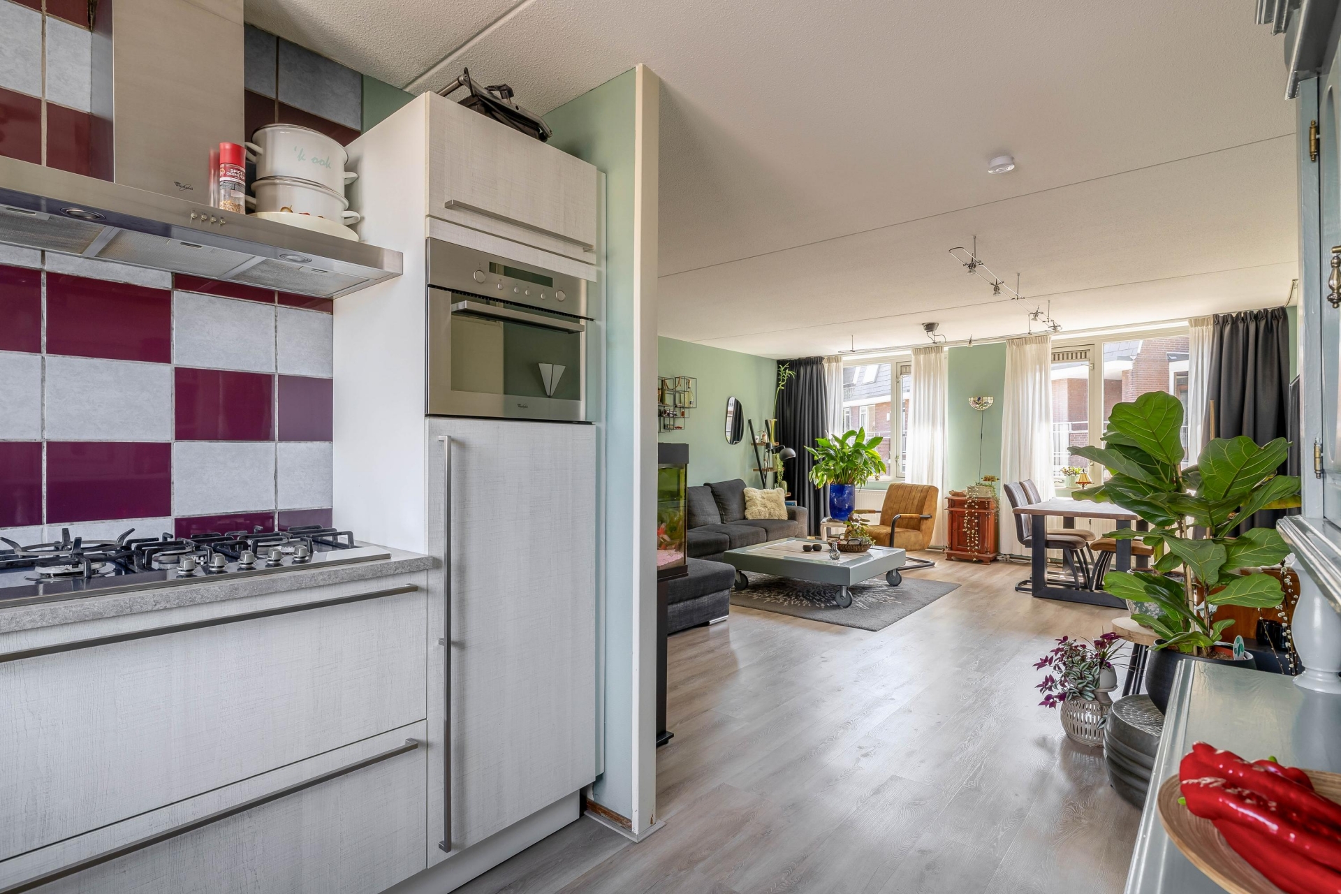 Op de derde verdieping van dit goed onderhouden complex vind je dit leuke 3-kamerappartement van 81 m². Zodra je binnenkomt valt direct de fijne lichtinval op. Dankzij de brede raampartijen over vrijwel de gehele breedte van de woonkamer stroomt het daglicht rijkelijk naar binnen. Dit is zo’n plek waar je overdag nauwelijks een lamp hoeft aan te zetten. De woonkamer is royaal opgezet en biedt meer dan voldoende ruimte voor een comfortabele zithoek én een volwaardige eettafel. Of je nu starter bent die zijn eerste eigen plek zoekt of een doorstromer die gelijkvloers wil wonen met gemak en comfort, hier kun je direct je meubels neerzetten en beginnen met genieten. De strakke wandafwerking en de nette vloer zorgen ervoor dat het huis zonder klussen te betrekken is. Vanuit de woonkamer stap je zo het balkon op. Door de ligging op het westen kun je hier vanaf de middag tot in de avond genieten van de zon. De groene aankleding en het volwassen bomenbestand in de straat zorgen voor een prettige, beschutte sfeer met veel privacy. Een fijne plek om na je werk nog even buiten te zitten.