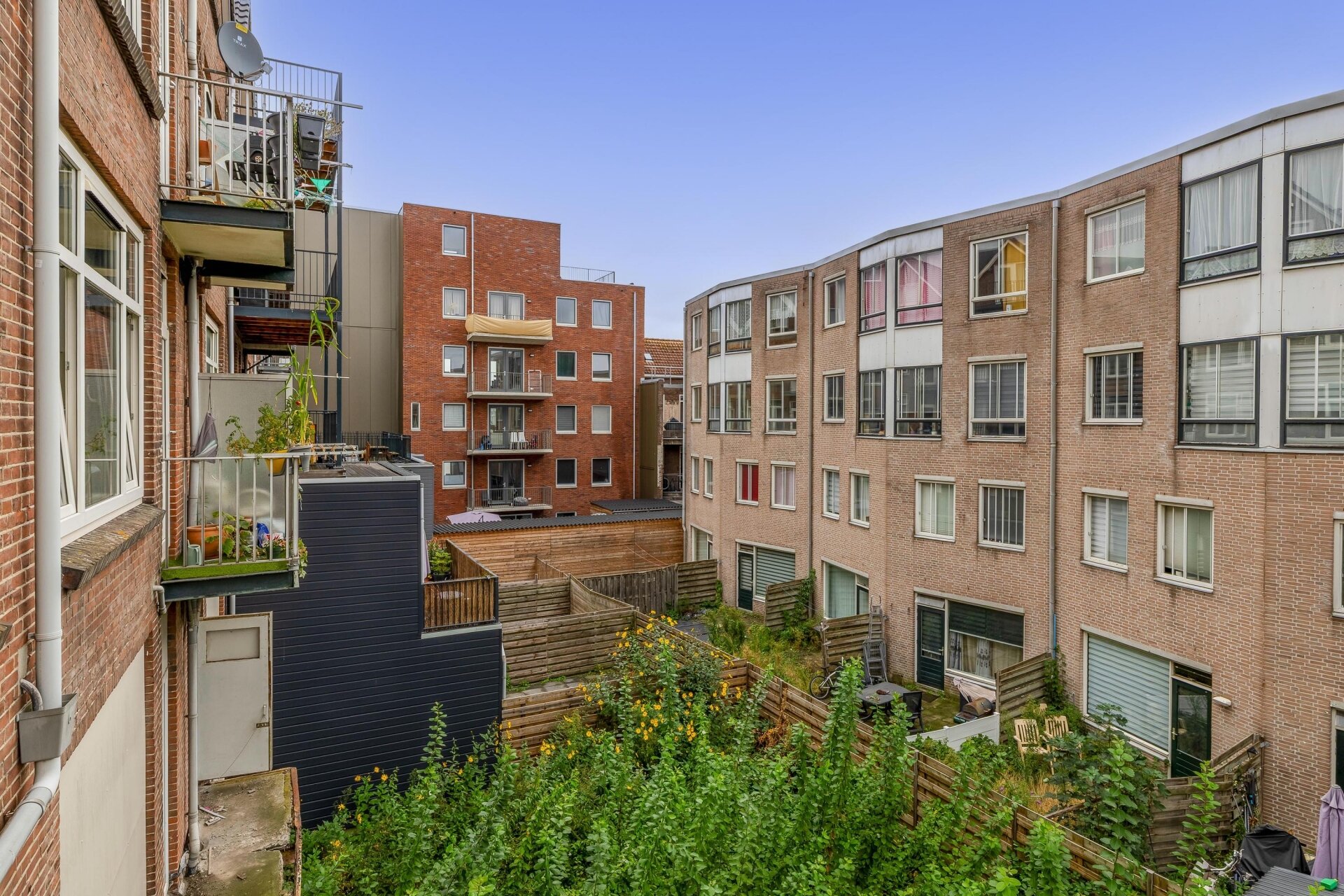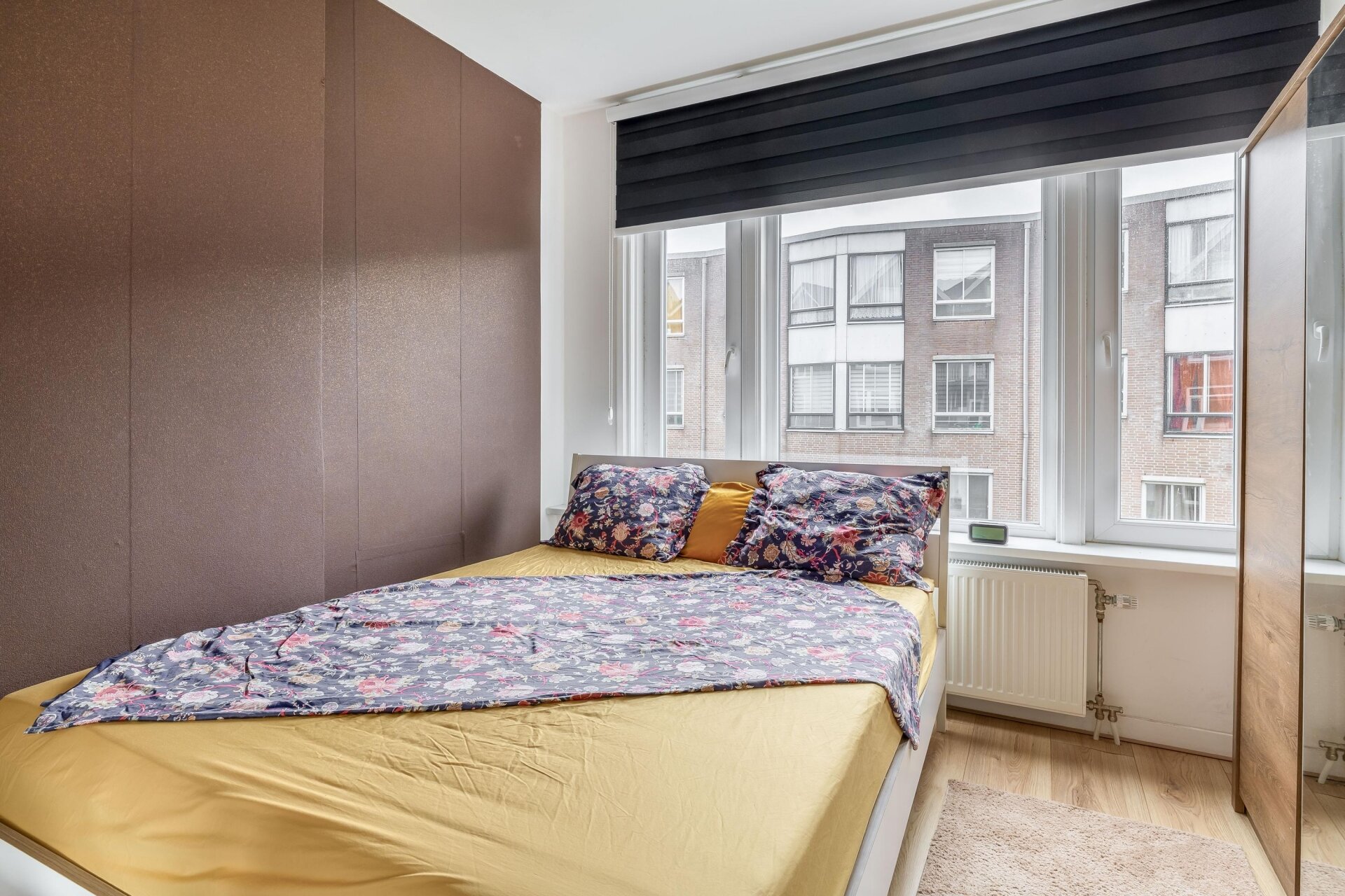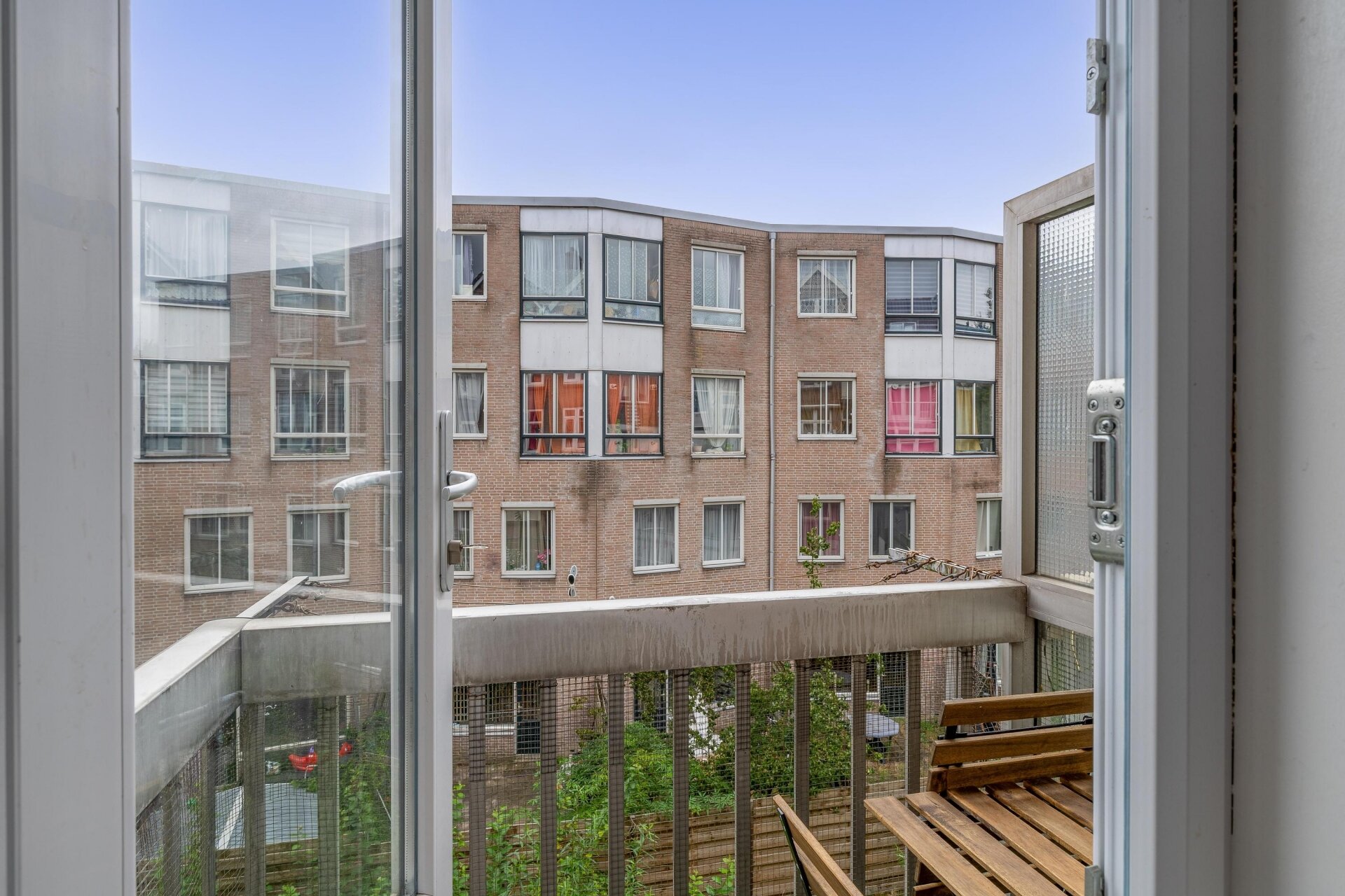 Aan de achterzijde ligt de ruime slaapkamer met plek voor een tweepersoonsbed en kastruimte. De moderne badkamer is betegeld en voorzien van een douche, wastafelmeubel en aansluiting voor de wasmachine. Vanuit de slaapkamer en keuken heb je toegang tot het balkon met uitzicht over de binnentuinen - een rustige plek om even buiten te zitten.