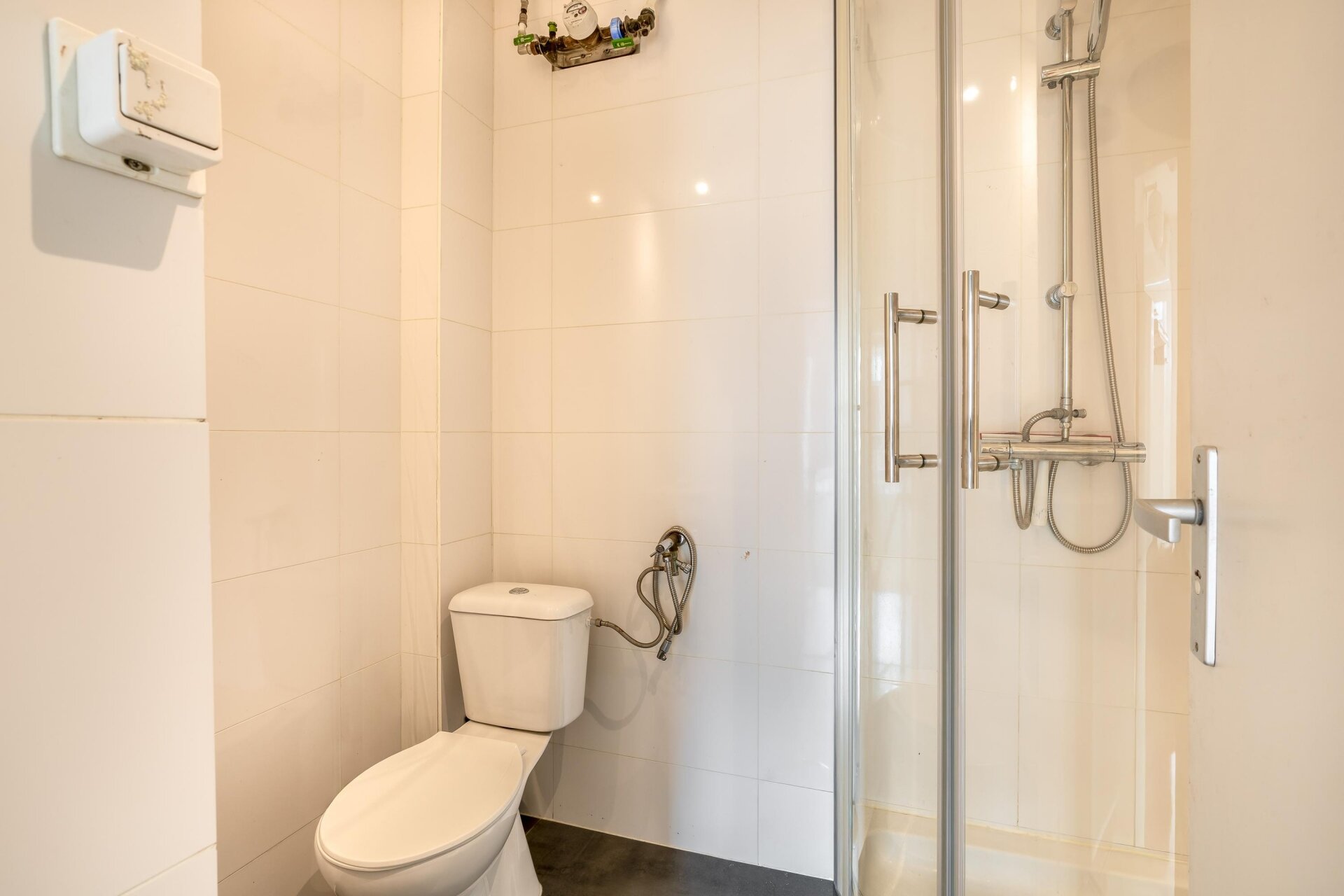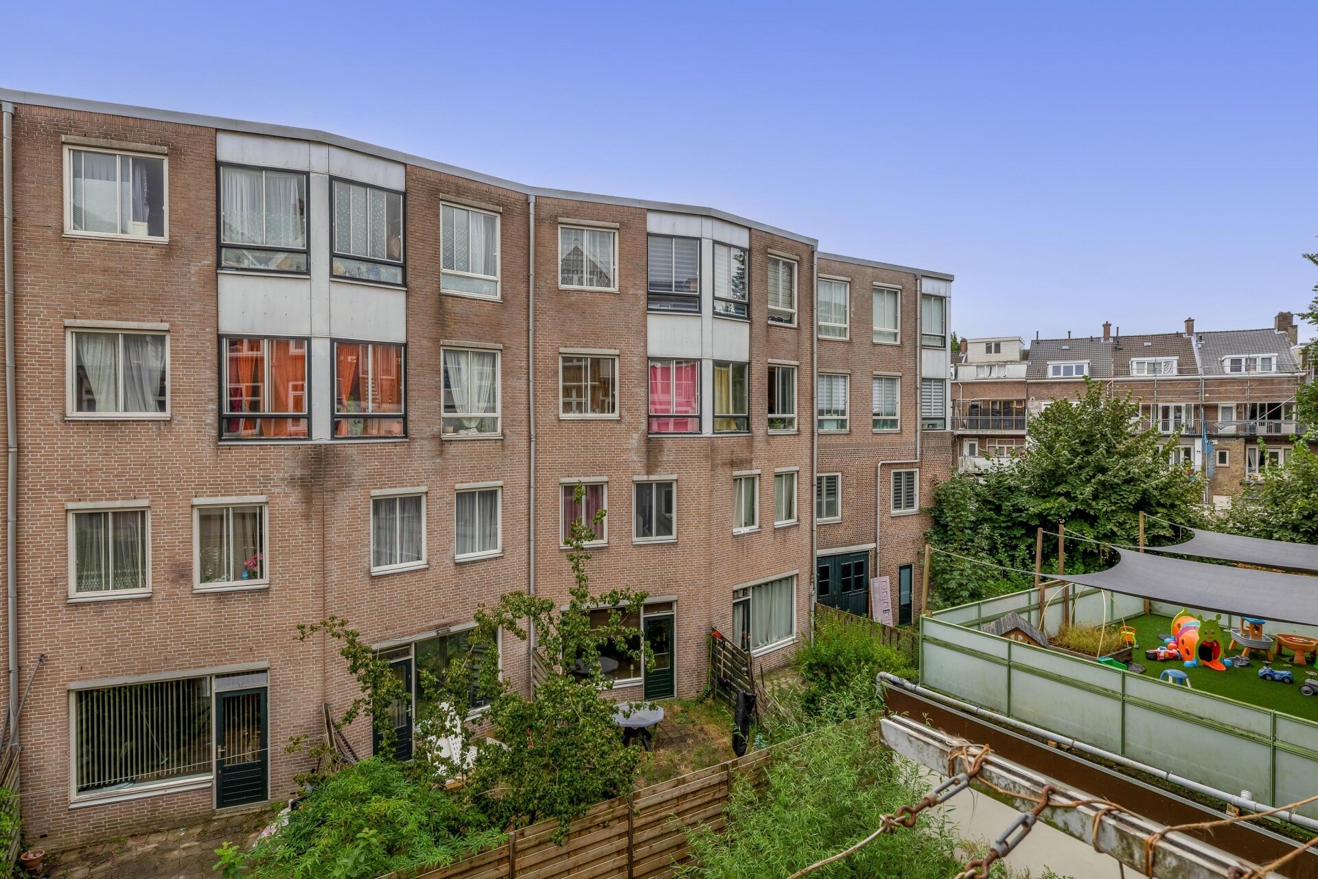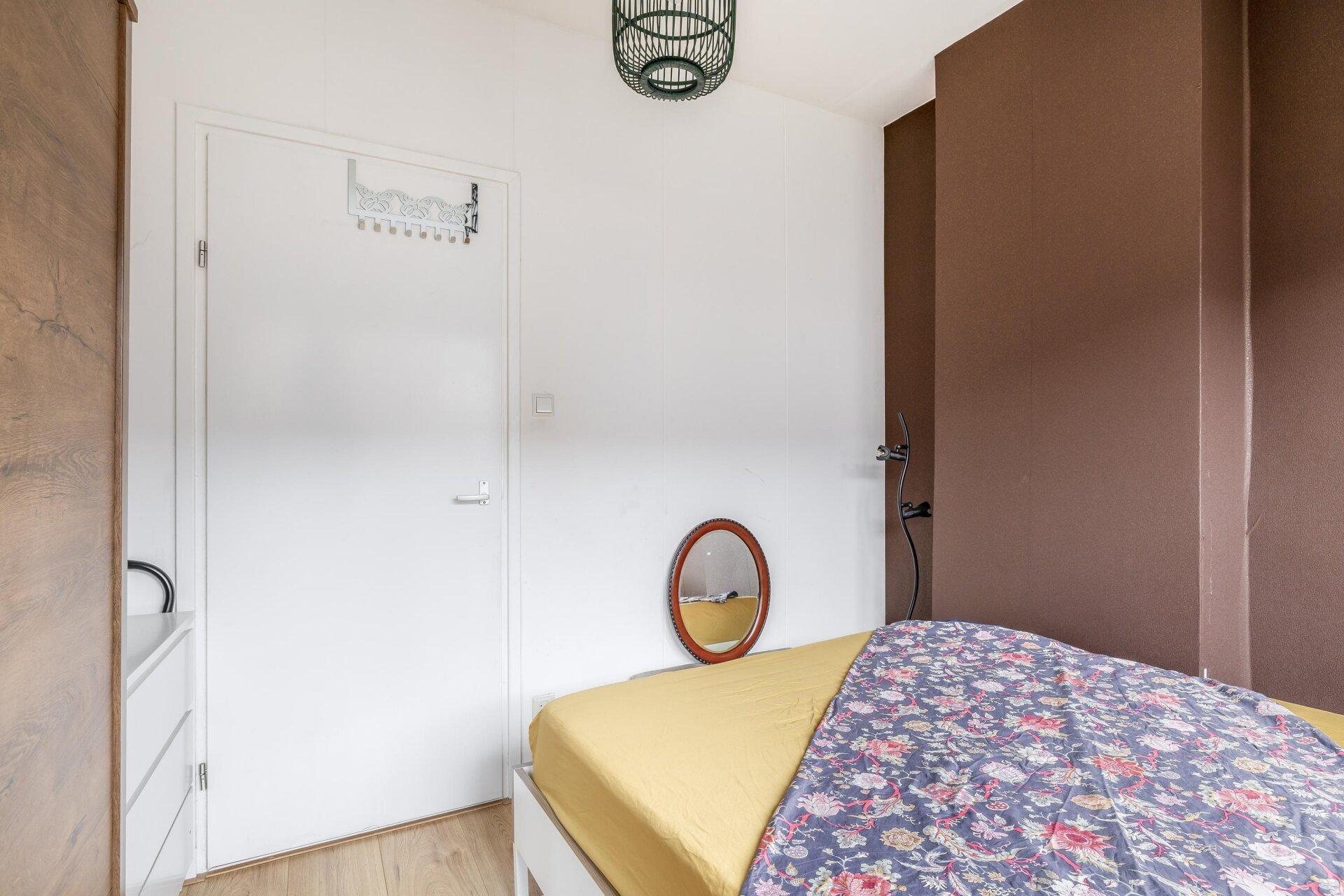 Aan de achterzijde ligt de ruime slaapkamer met plek voor een tweepersoonsbed en kastruimte. De moderne badkamer is betegeld en voorzien van een douche, wastafelmeubel en aansluiting voor de wasmachine. Vanuit de slaapkamer en keuken heb je toegang tot het balkon met uitzicht over de binnentuinen - een rustige plek om even buiten te zitten.