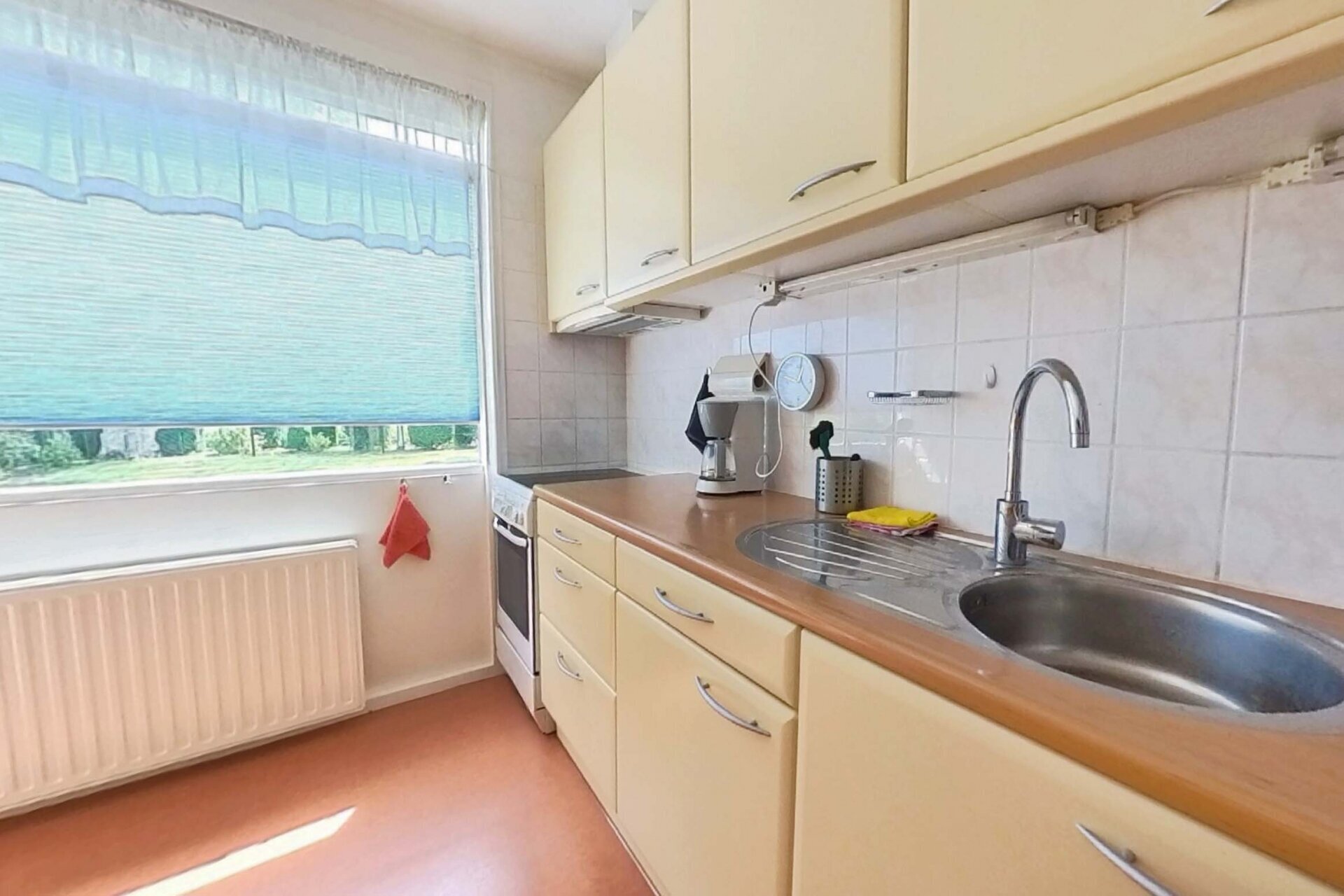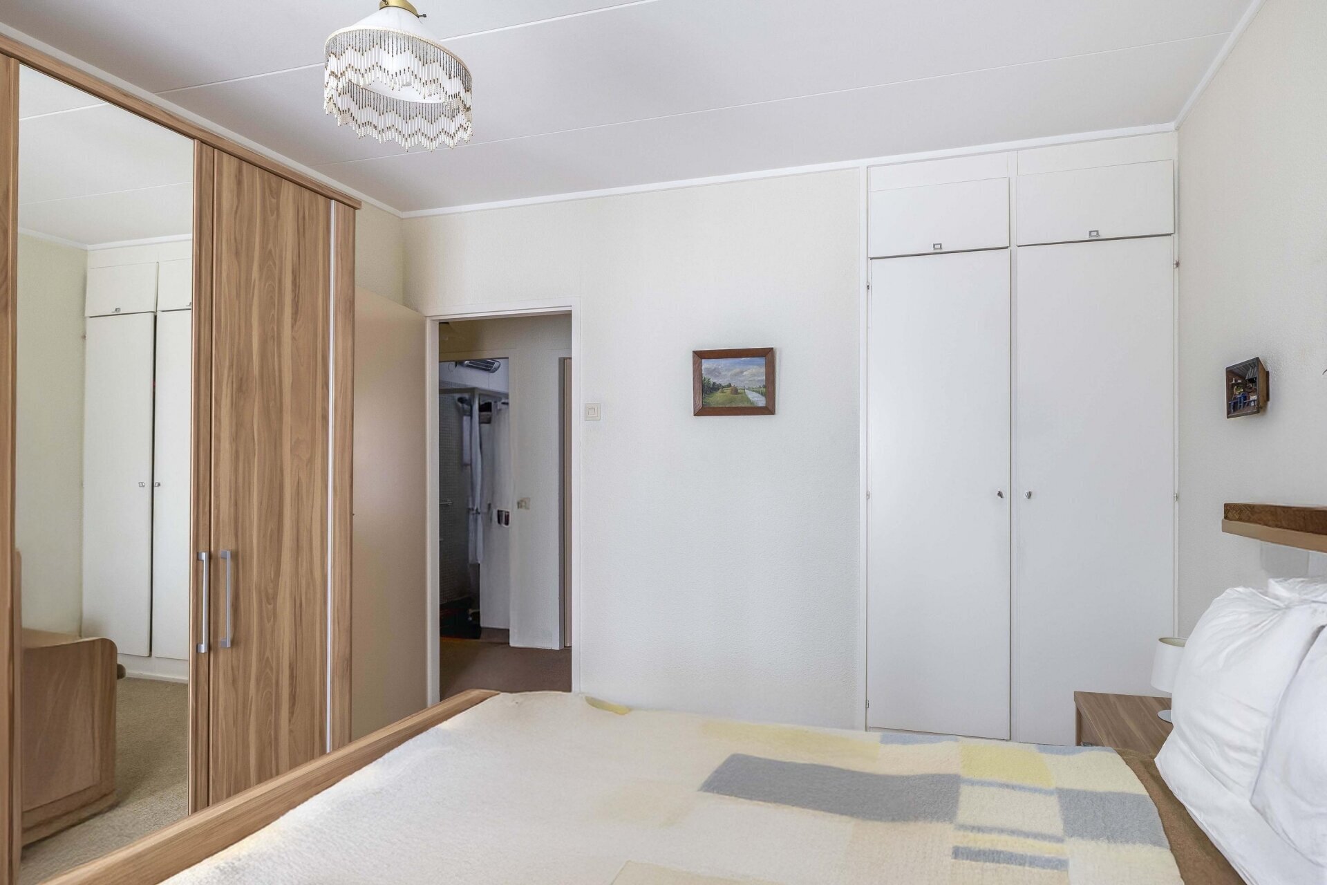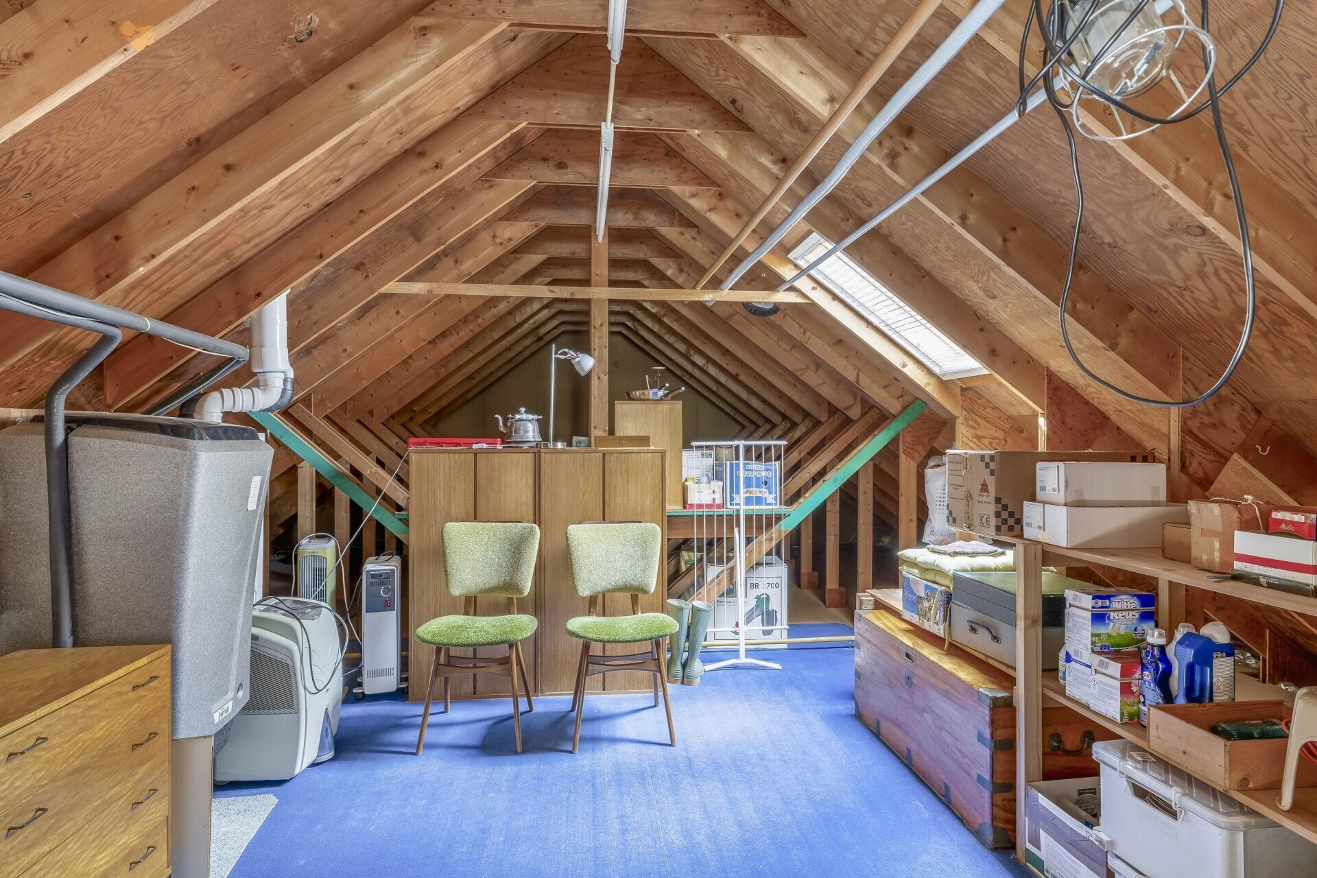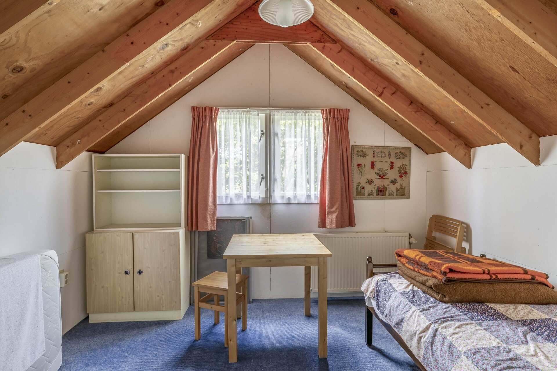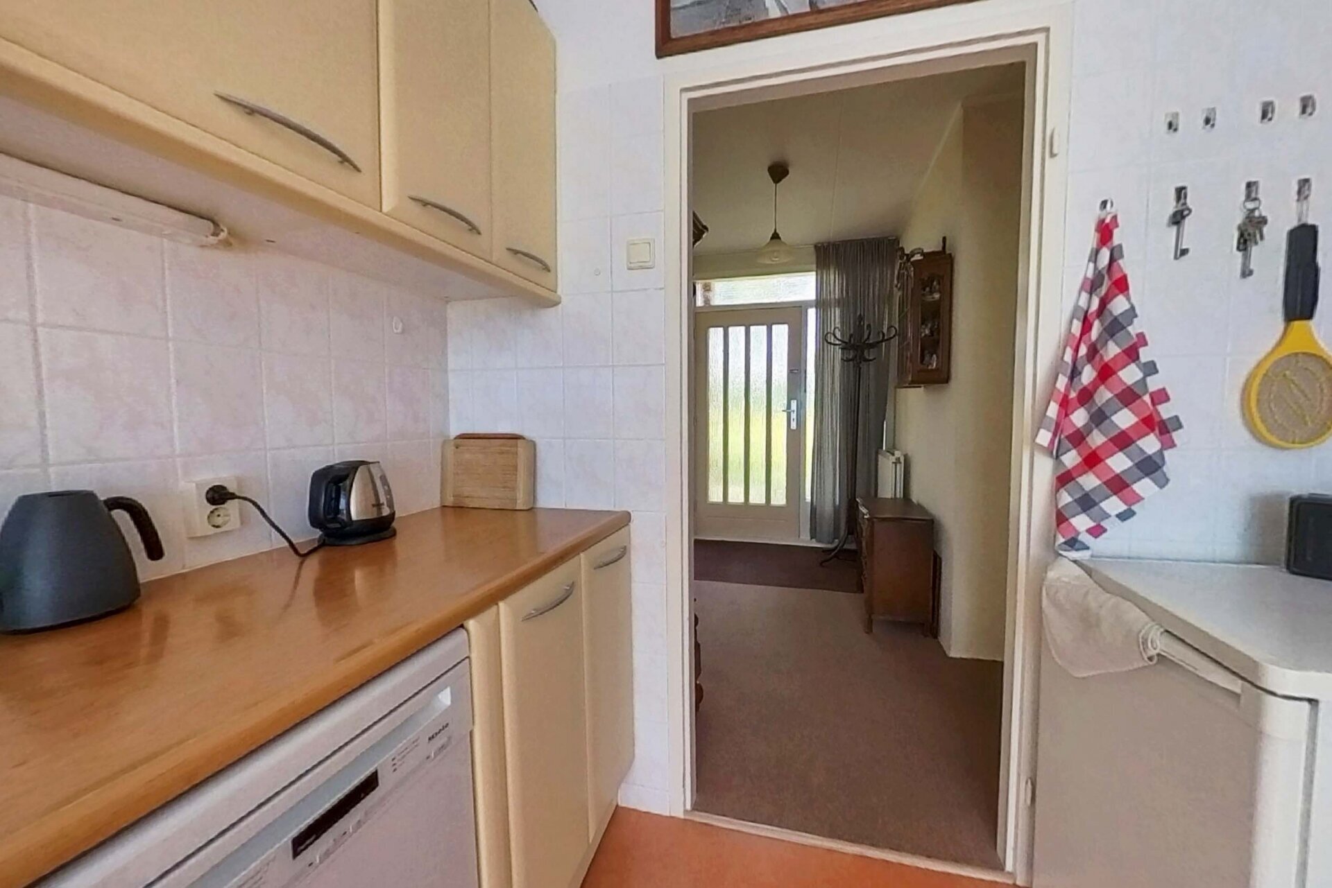 De keuken is functioneel ingericht, met voldoende kastruimte en een toegang via de bijkeuken tot de tuin. De slaapkamer op de begane grond is ruim en licht. Daarnaast is er op de 1e verdieping, te bereiken via een vaste trap in de bijkeuken, nog een extra slaapkamer, wat dit huis heel geschikt maakt voor logees of hobbyruimte. Daartoe kan tevens het ruime open deel op de 1e verdieping, voorzien van een kantelraam, benut worden.