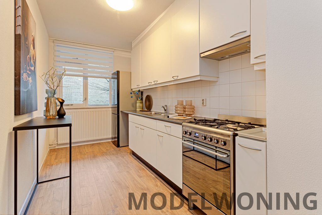 Op een tweetal foto's is de modelwoning zichtbaar, hier is mooi in beeld gebracht hoe een appartement aan de Groenhovenweg er uit kan komen te zien met een likje verf, tof meubilair en leuke accessoires!