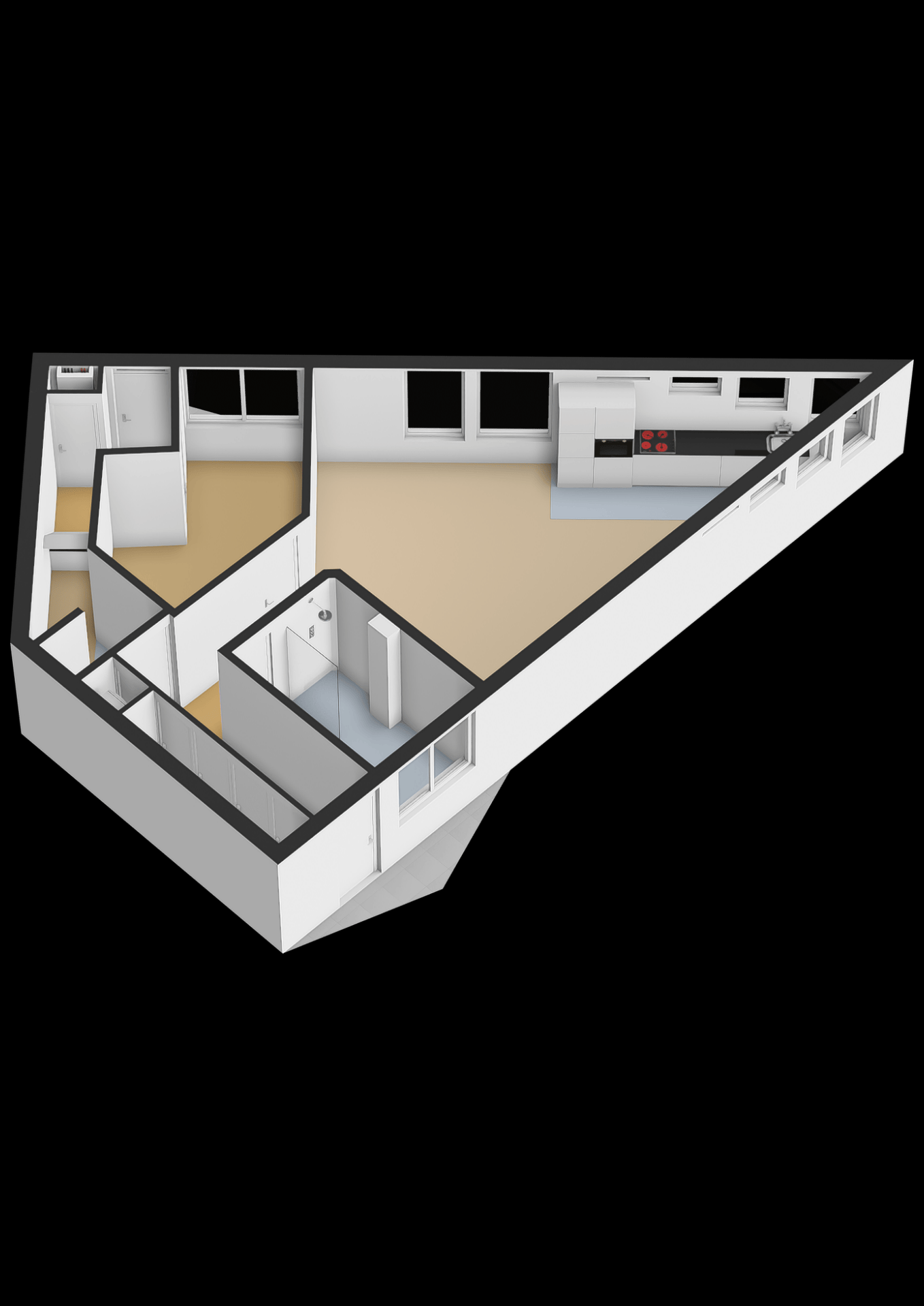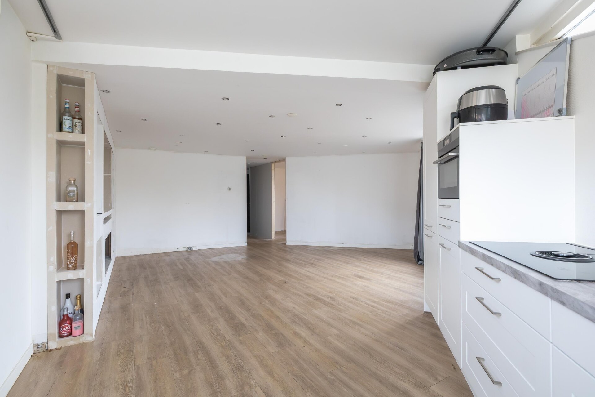 Grenzend hieraan bevindt zich de toiletruimte met hangend closet en wasmachineaansluiting. Tegenover de toiletruimte vindt u de badkamer. Deze volledig betegelde badkamer is uitgevoerd met een antraciet kleurige tegel en is voorzien van een bijzonder riante inloopdouche en een eigen wastafelmeubel. Verder de hal in gelopen vindt u de toegang tot de slaapkamer. Aan de achterzijde van de woning bevindt zich de bijzonder ruime, maar bovenal speelse woonkamer. Tevens bevindt zich hier de open keuken. Deze open keuken is uitgevoerd met een witte kleurstelling en beschikt over diverse Inbouwapparatuur uur te weten; koel/vries combinatie, combi magnetron, 4-pits inductie kookplaat, vaatwasser en rvs spoelbak.