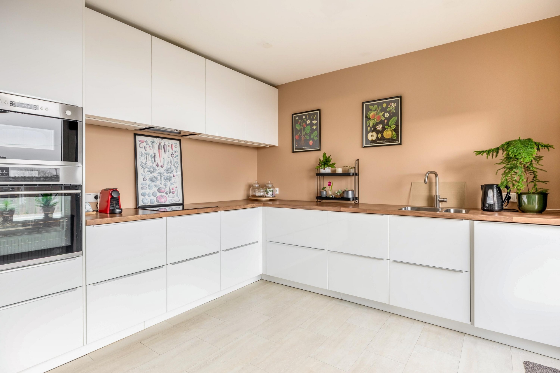 De keuken is strak uitgevoerd met lichte fronten en een warm houten werkblad. De opstelling is praktisch en biedt volop werk- en kastruimte. De inbouwapparatuur is netjes geïntegreerd en alles maakt een goed onderhouden indruk. Vanuit de keuken is er toegang tot het tweede balkon gelegen op het oosten, waardoor je hier ’s ochtends heerlijk in de zon zit. Een fijne manier om de dag te beginnen.