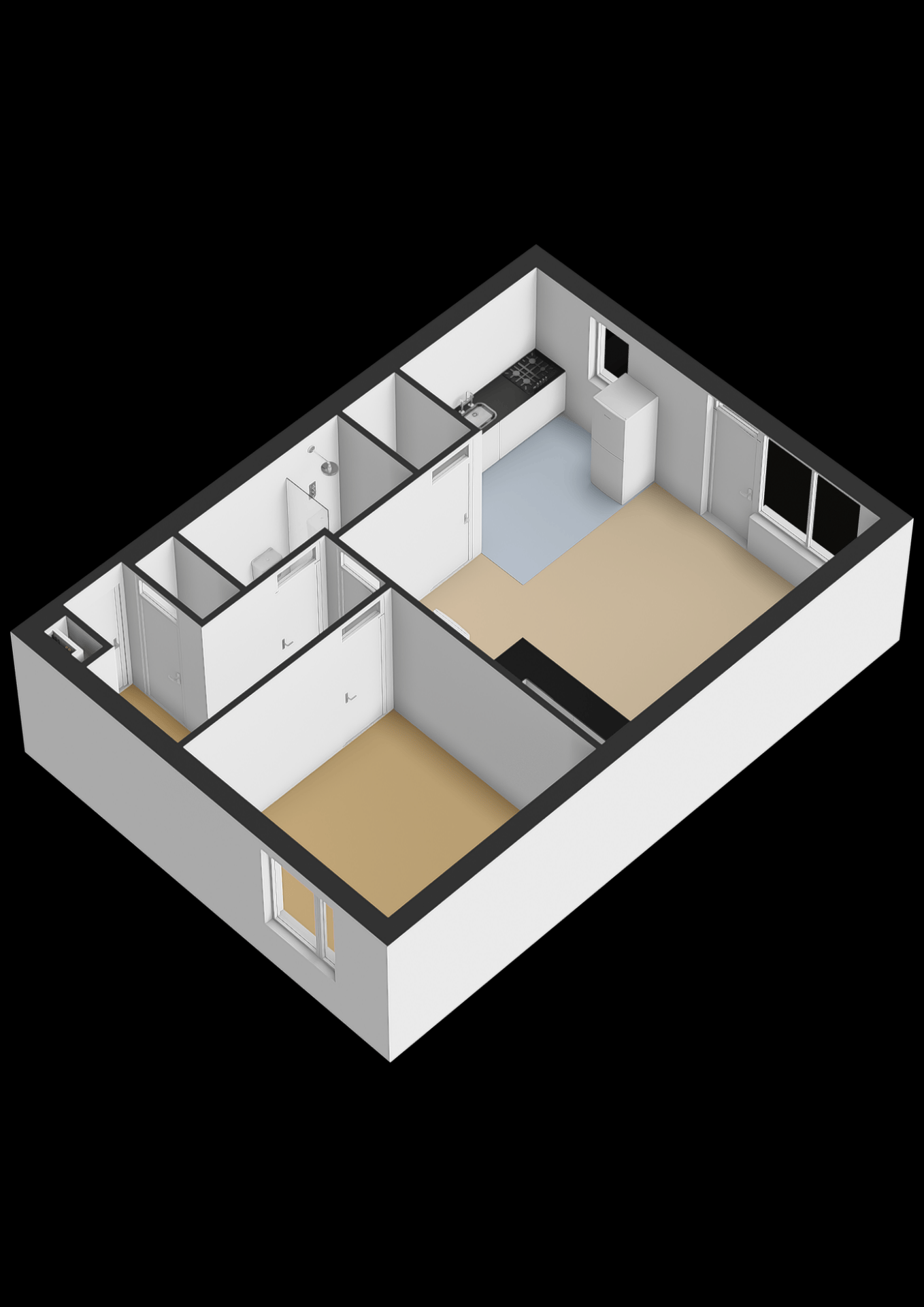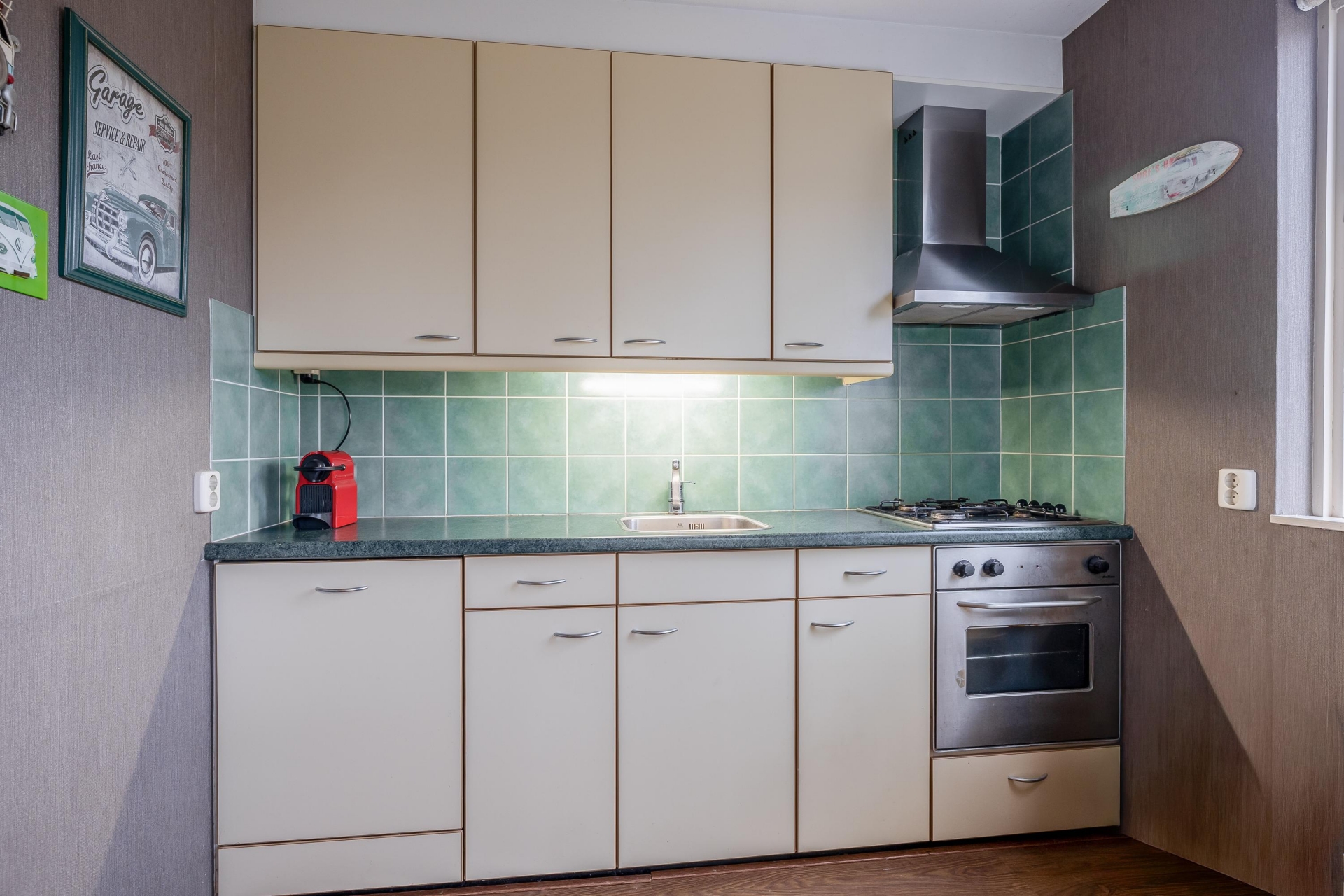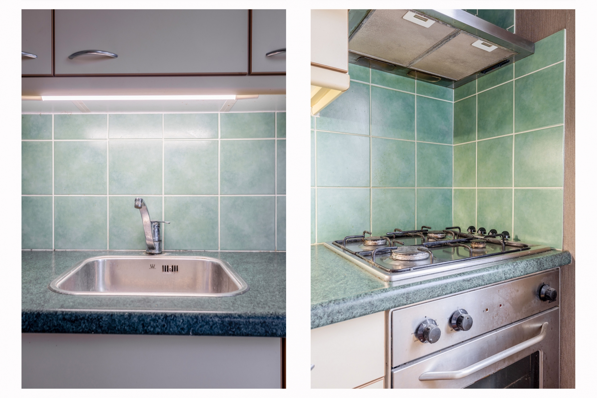 De keuken is compact maar functioneel ingericht. Hier vind je onder andere een vaatwasser, gaskookplaat, afzuigkap, oven en voldoende kastruimte voor keukengerei en boodschappen. Dankzij het raam in de keuken komt ook hier prettig daglicht naar binnen, wat het een fijne plek maakt om te koken.