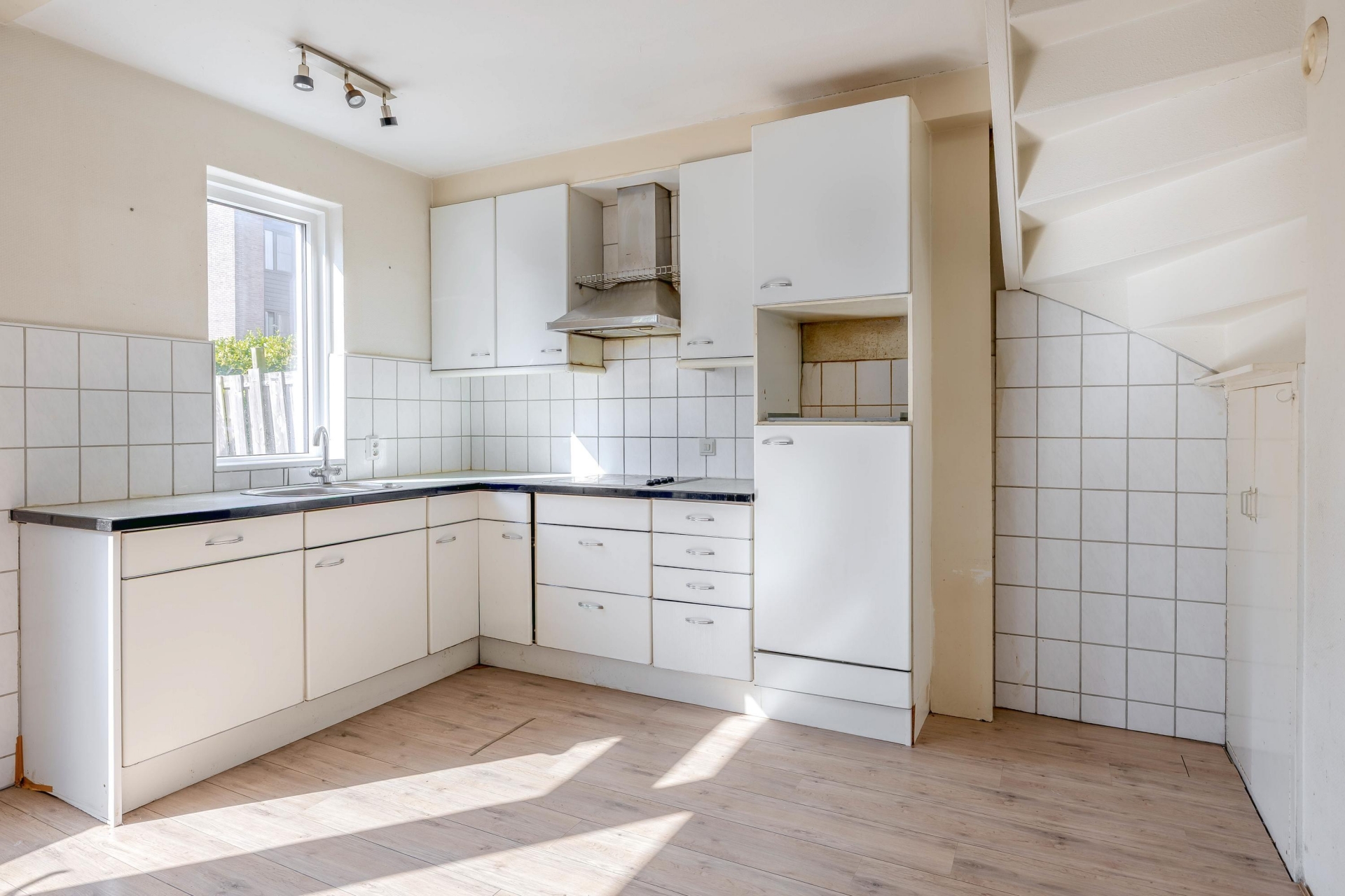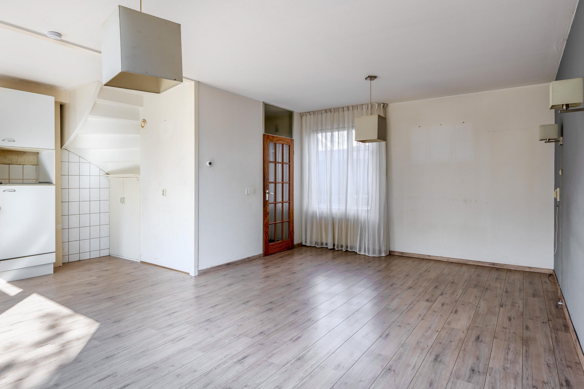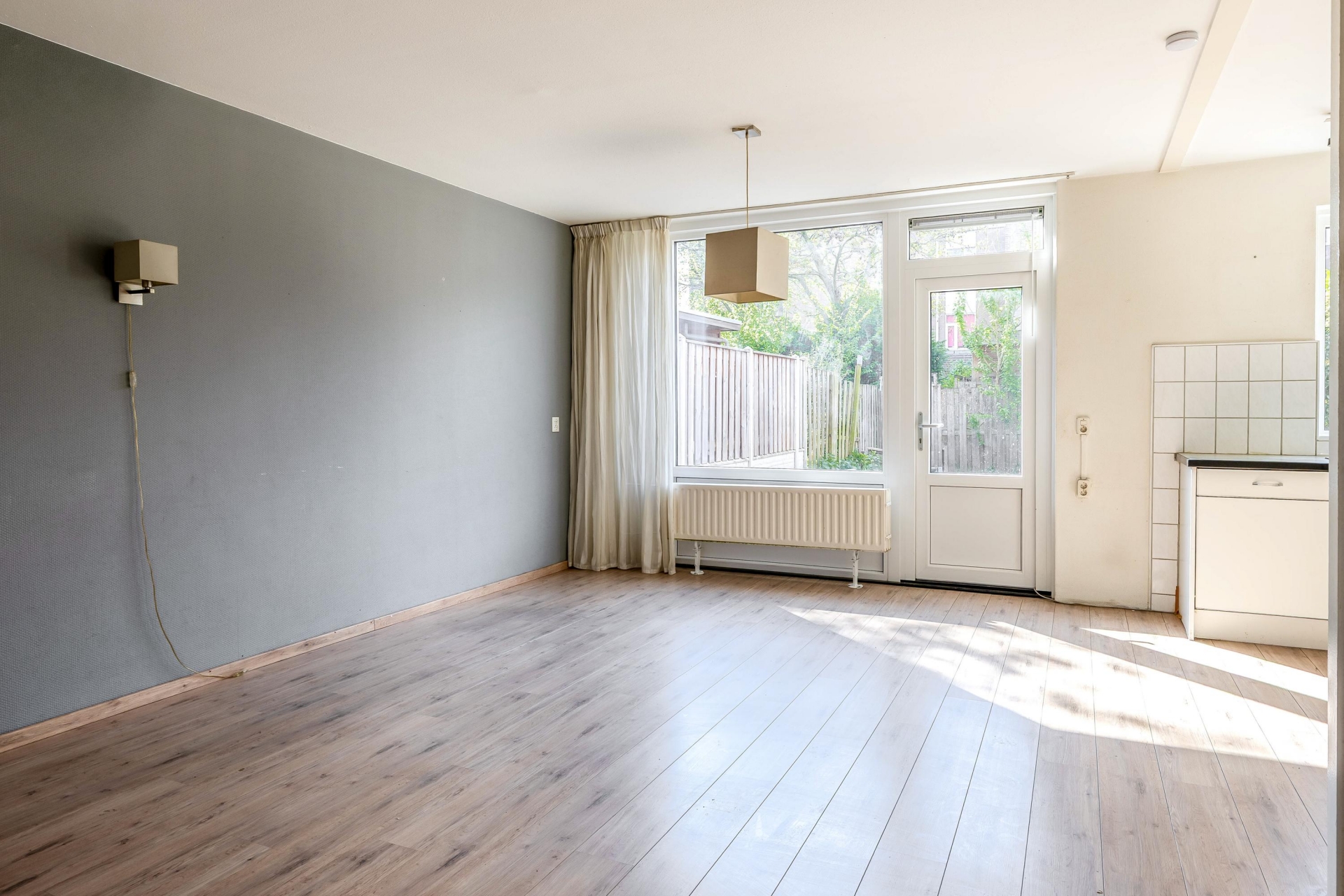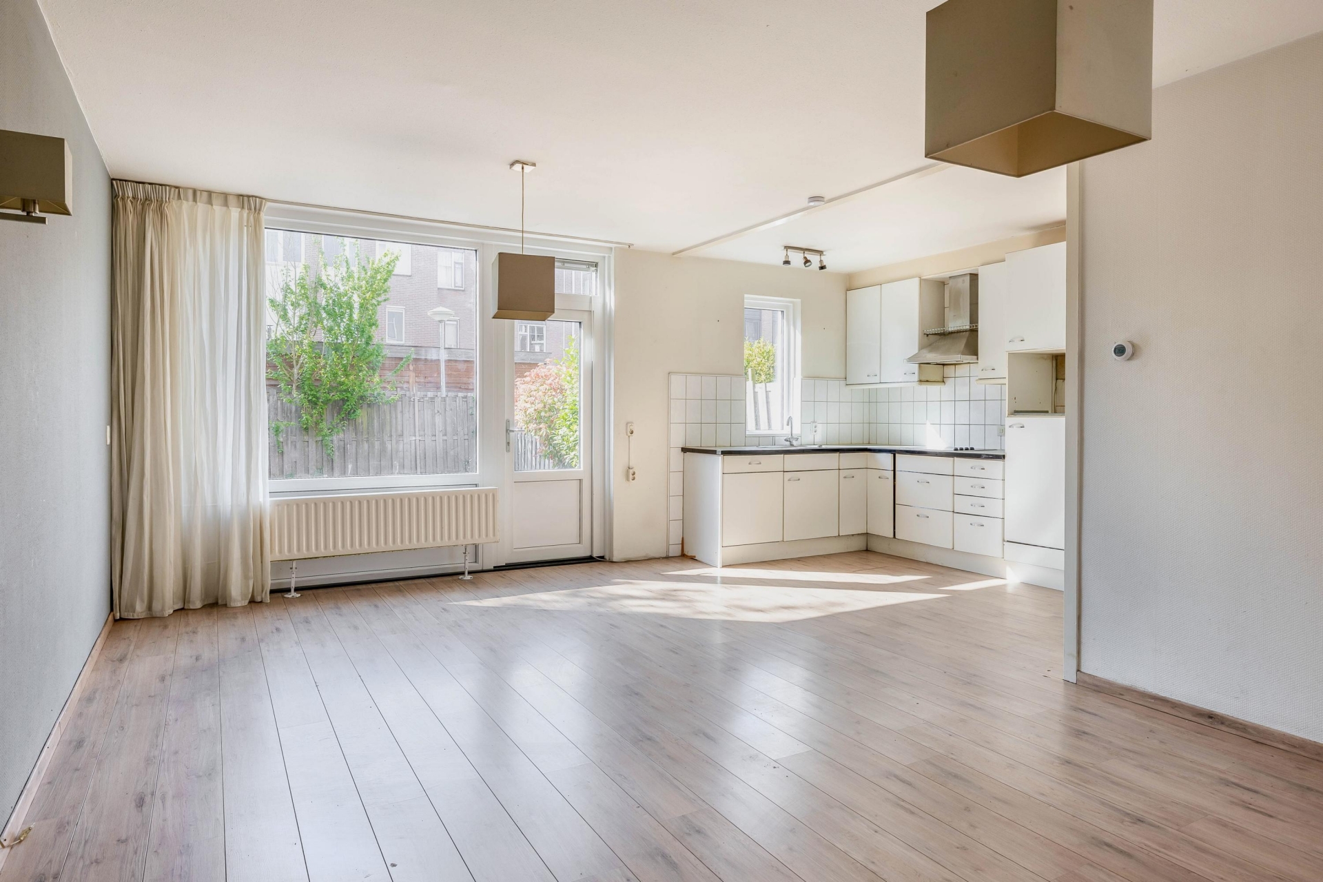 De lichte woonkamer met open keuken vormt het hart van het huis. Dankzij de grote raampartijen komt er veel daglicht naar binnen, wat direct zorgt voor een fijne sfeer. De keuken is eenvoudig uitgevoerd, maar functioneel en biedt volop mogelijkheden om hier jouw ideale woonkeuken van te maken. Vanuit de woonkamer loop je zo de achtertuin in, waar je tot in de avond van de zon kunt genieten.