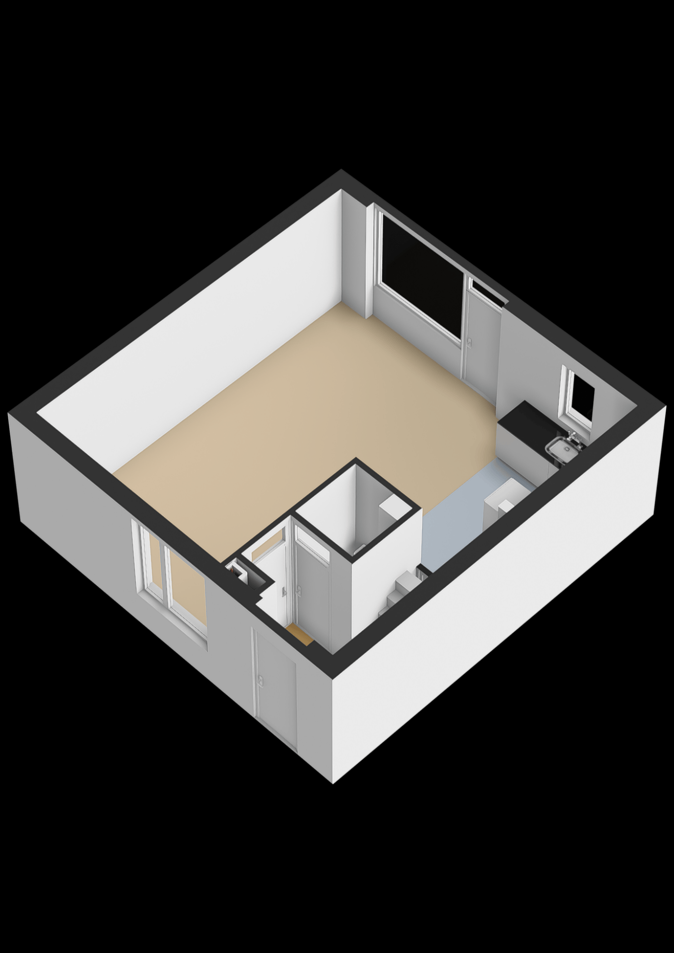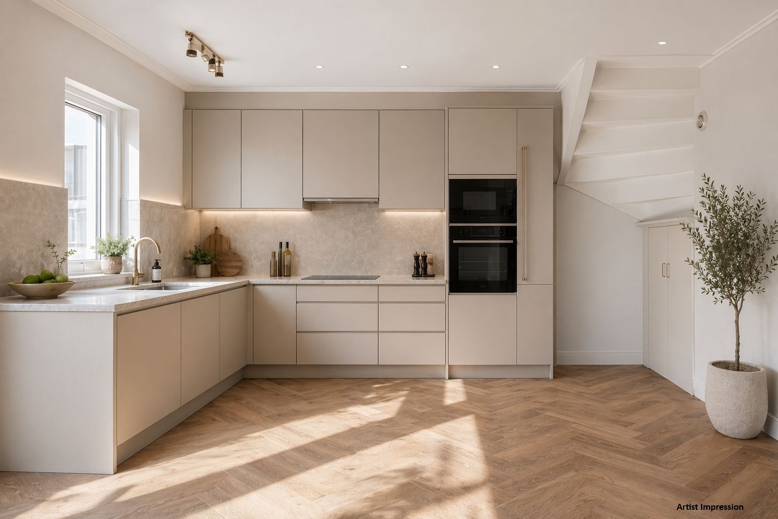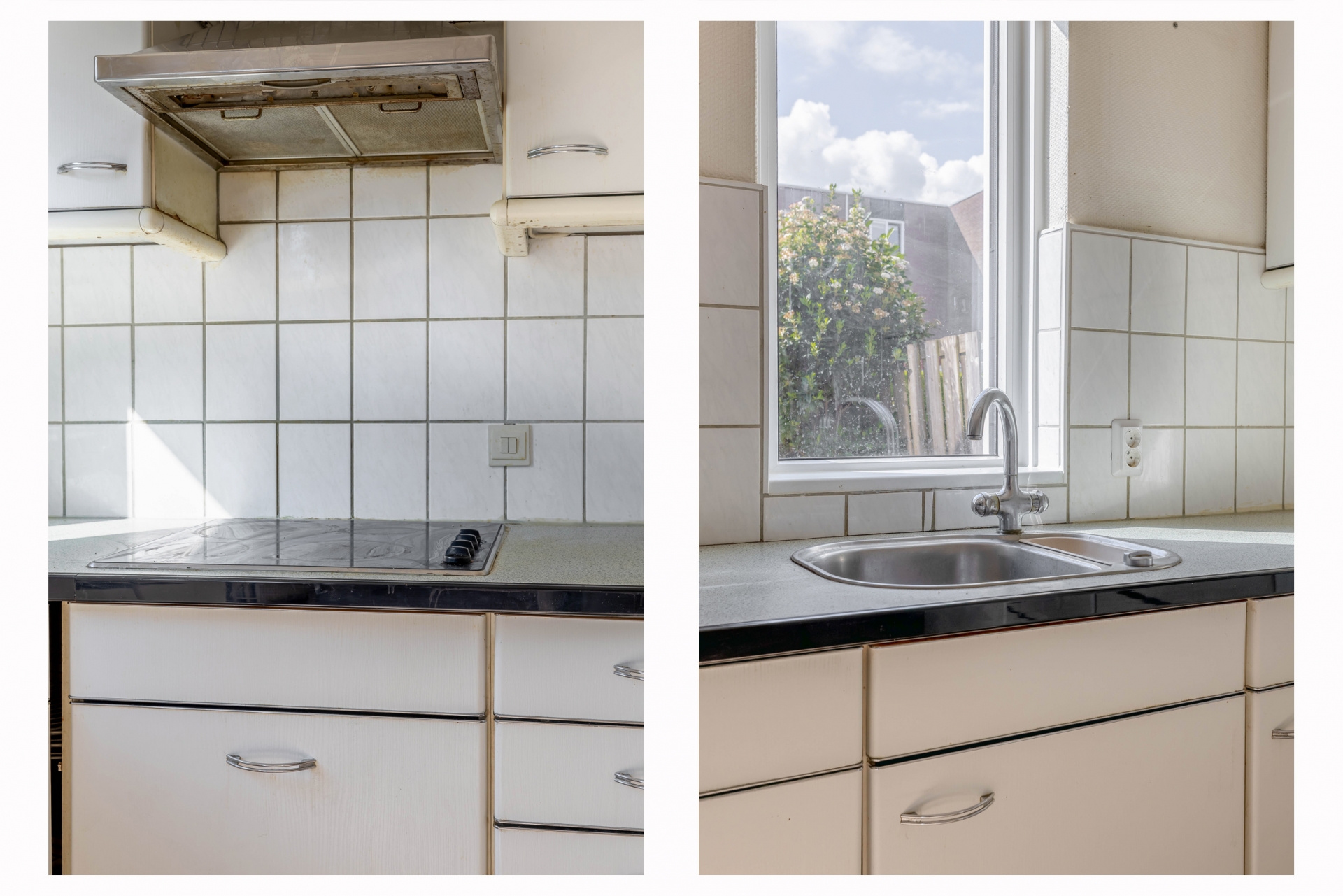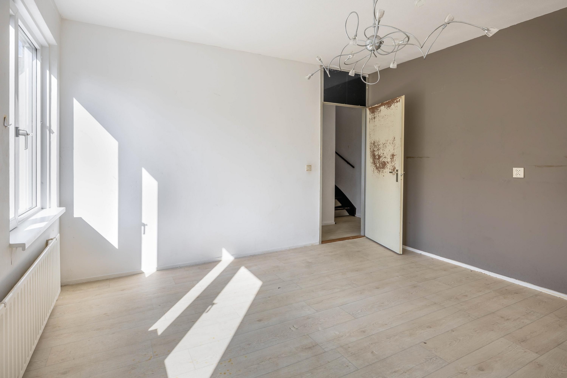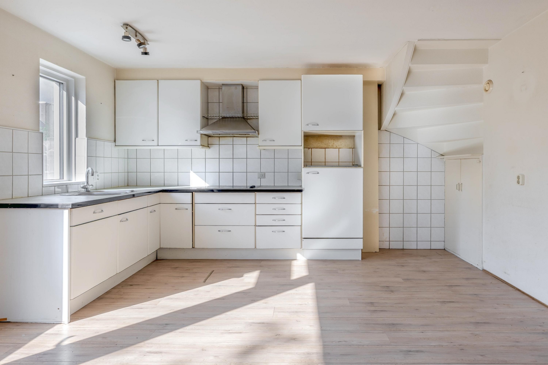 De lichte woonkamer met open keuken vormt het hart van het huis. Dankzij de grote raampartijen komt er veel daglicht naar binnen, wat direct zorgt voor een fijne sfeer. De keuken is eenvoudig uitgevoerd, maar functioneel en biedt volop mogelijkheden om hier jouw ideale woonkeuken van te maken. Vanuit de woonkamer loop je zo de achtertuin in, waar je tot in de avond van de zon kunt genieten.