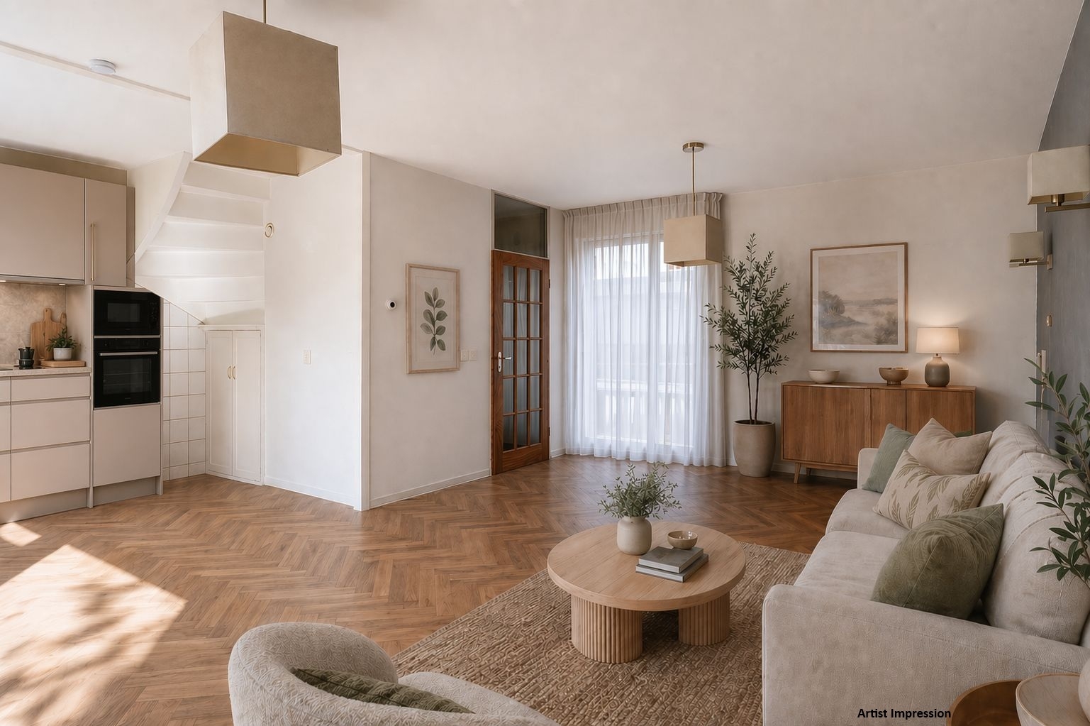 Bij binnenkomst kom je in de hal met meterkast, toiletruimte en trapopgang. De begane grond voelt direct ruim aan en biedt een prettige leefruimte waar je eenvoudig verschillende zithoeken kunt creëren.
