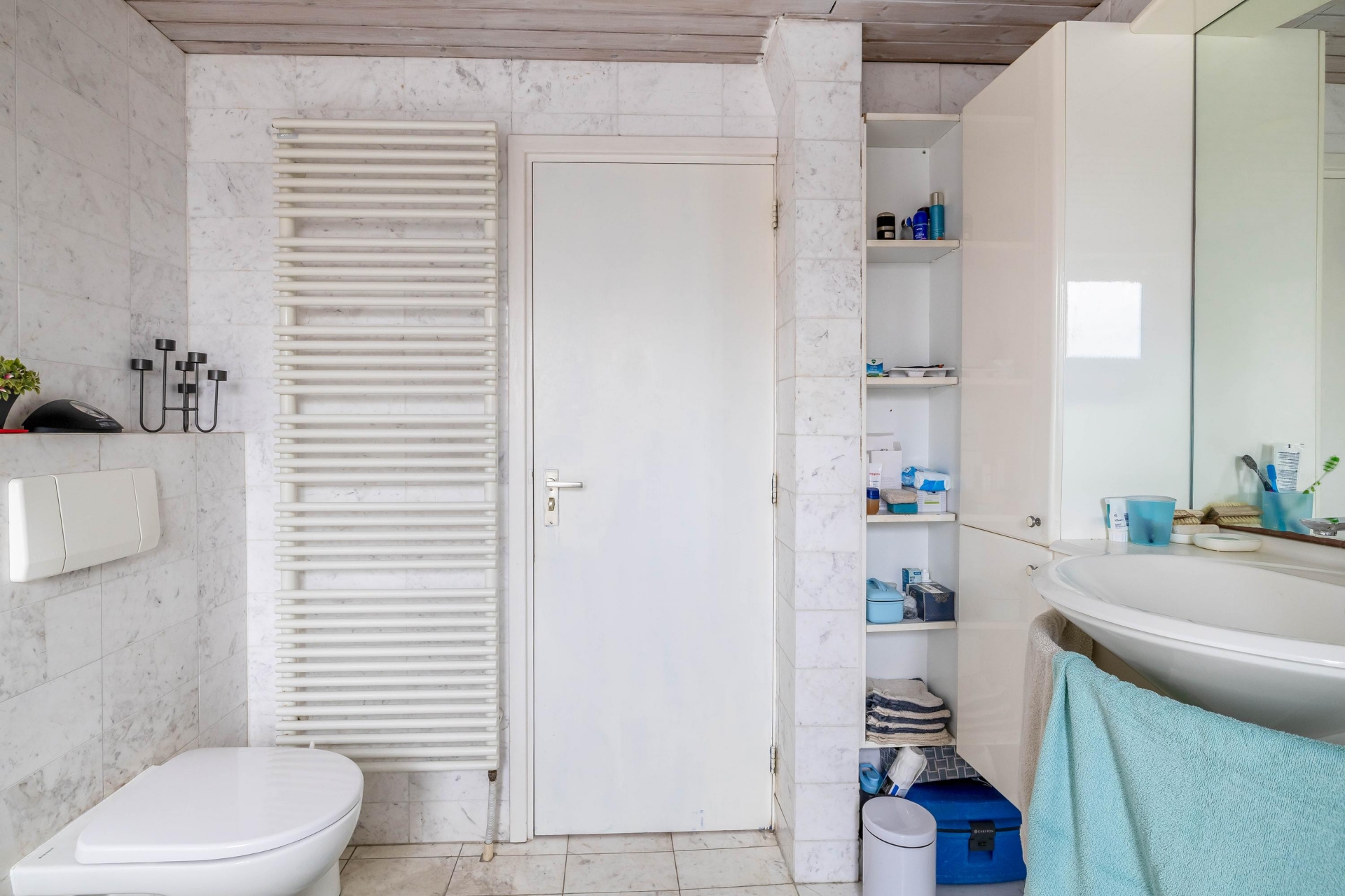 Op de eerste verdieping zijn twee slaapkamers en een ruime badkamer te vinden. De grootste slaapkamer ligt aan de achterzijde en geeft toegang tot een royaal balkon over de volle breedte van het huis. De tweede slaapkamer is aan de voorzijde gelegen en praktisch van formaat. Verder is er op deze verdieping nog een aparte wasruimte en een inbouwkast.
