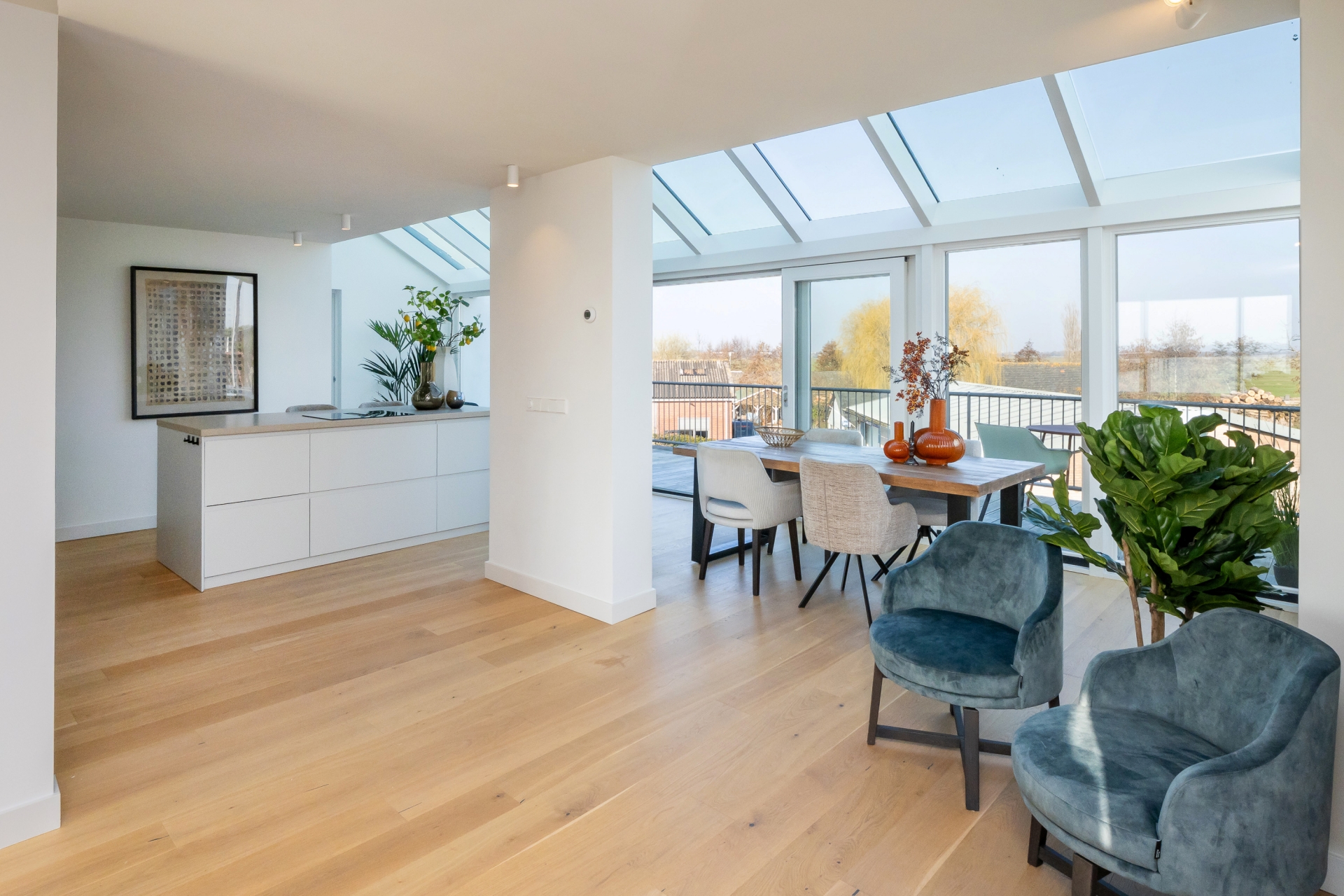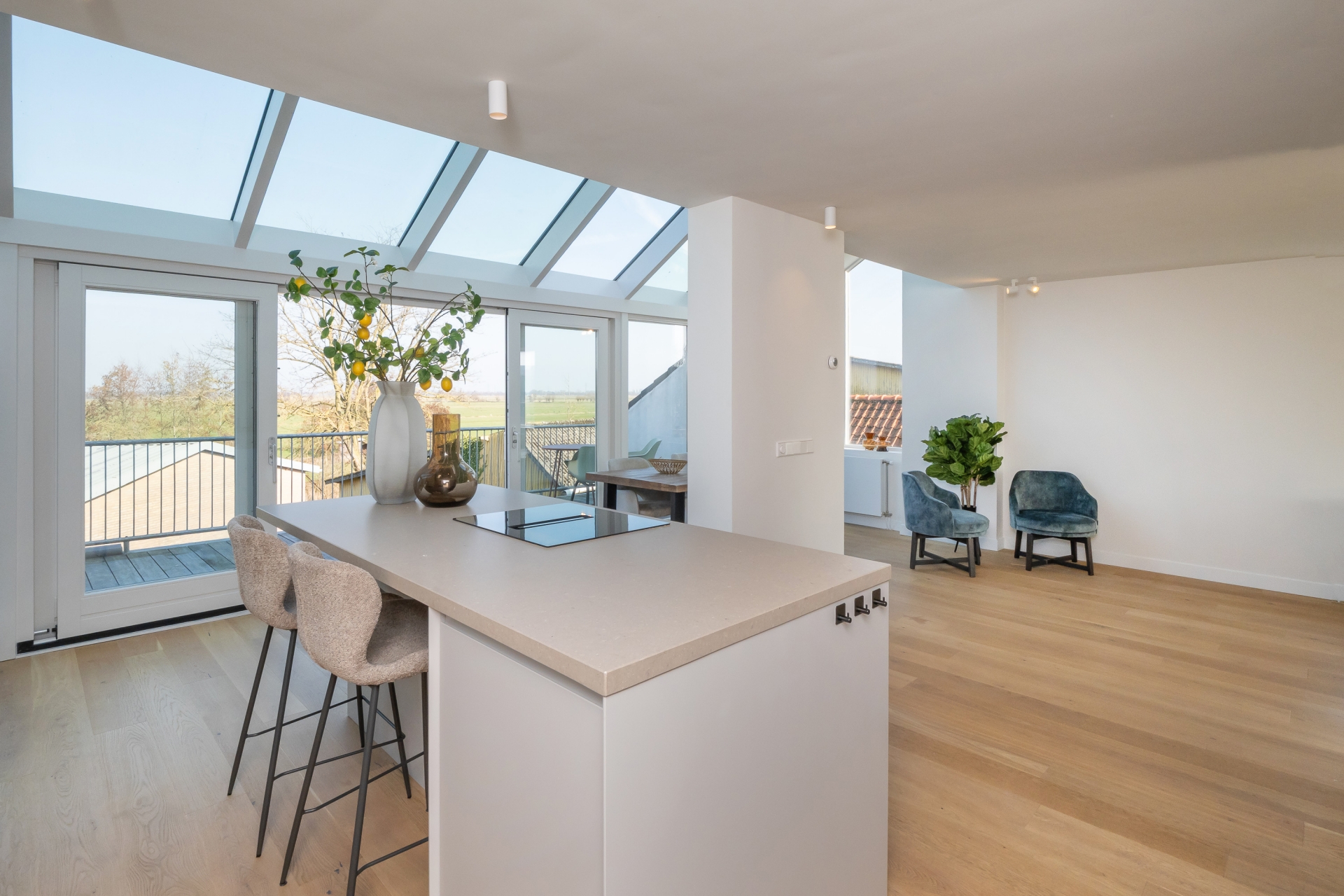 Via de ingang bovendijks kom je kom je in de gemeenschappelijke hal met meterkast. Van daaruit loop je door naar je eigen hal met glazen wand. De woonkamer is strak afgewerkt met gestucte wanden en is heerlijk licht door de vele raampartijen en lichtstraat. Een ruimte om verliefd op te worden. Vanuit de woonkamer kijk je uit over het polderlandschap. De keuken beschikt over een kookeiland en alle benodigde inbouwapparatuur, zoals een inductiekookplaat met geïntegreerde afzuigkap, vaatwasser, combi-oven, koelkast, vriezer en voldoende opbergruimte. Het terras van ruim 15 M² is gelegen op het noord-oosten bereik je middels de glazen schuifpui. Ondanks de ligging kun je hier vanwege de hoogte vrijwel de gehele dag van de zon genieten.