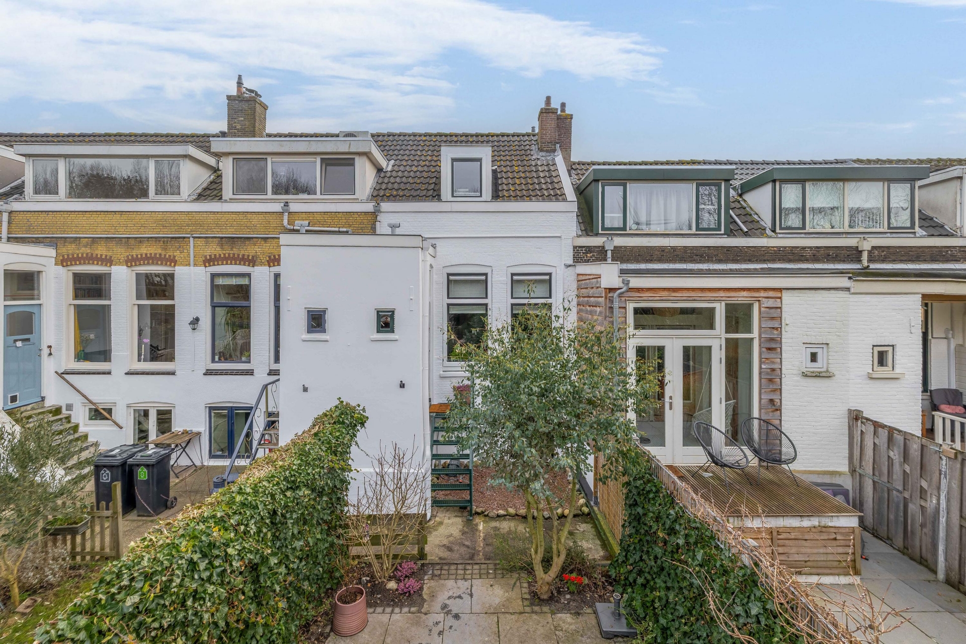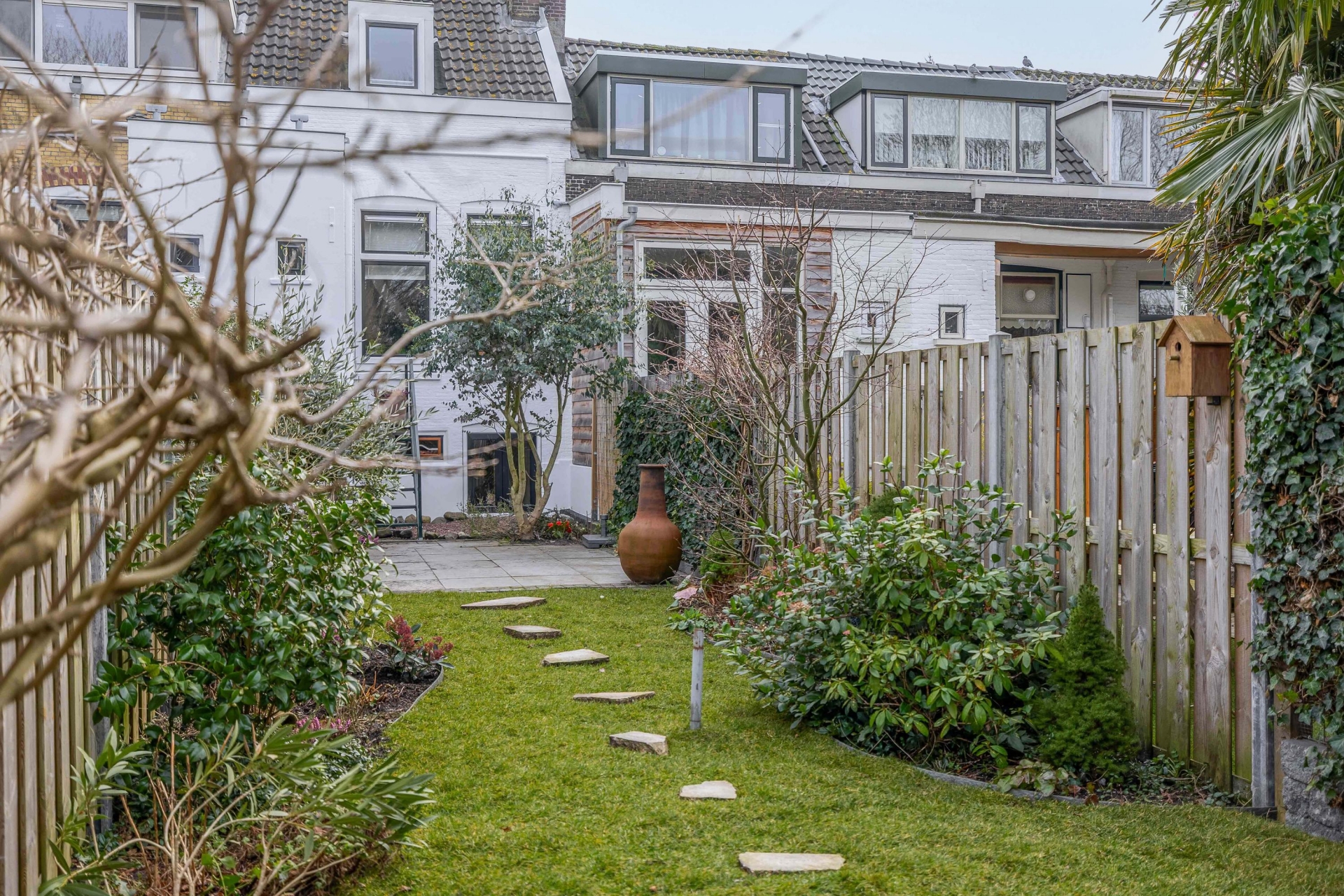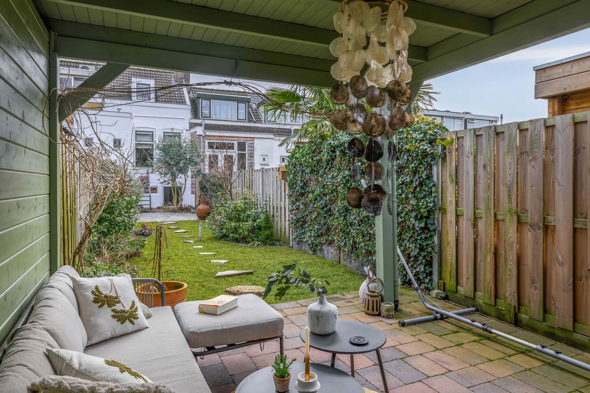 En dan de tuin. Want wat een verrassing is dit. Met maar liefst bijna 30 meter diepte voelt dit als een eigen groene oase midden in de stad. Door de ligging op het westen is er altijd wel een zonnige plek te vinden. ’s Ochtends rustig wakker worden met koffie in het eerste zonnetje, later op de dag loungen achterin onder de overkapping van het tuinhuis.