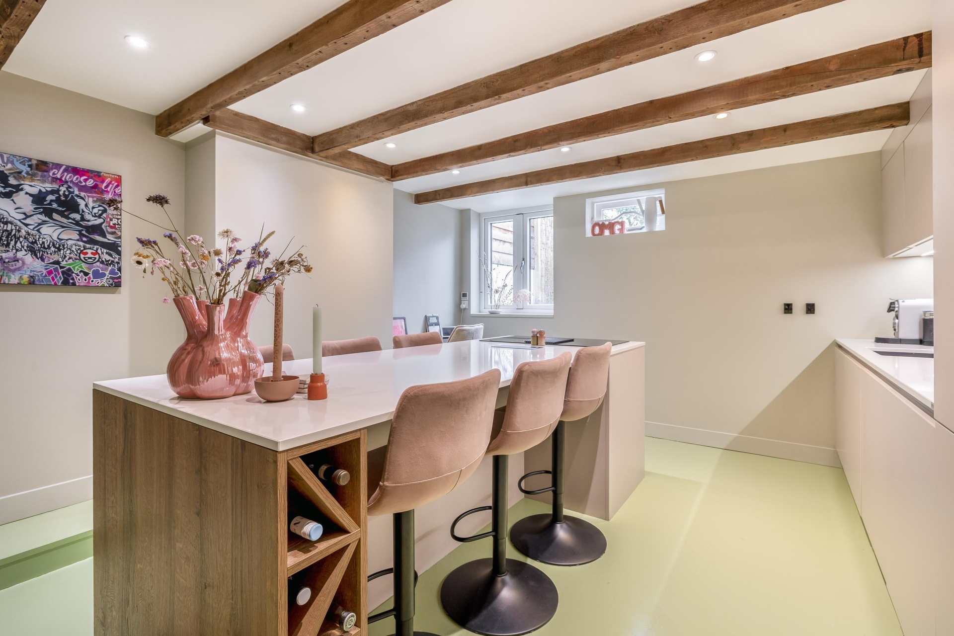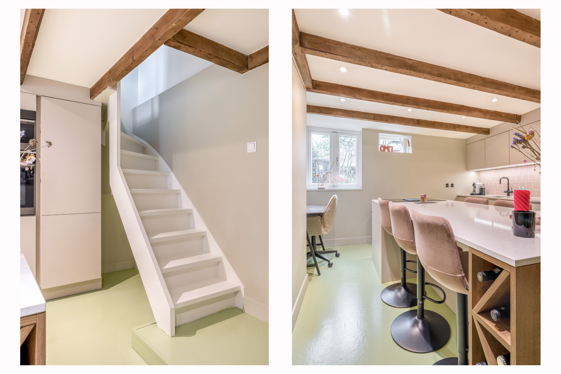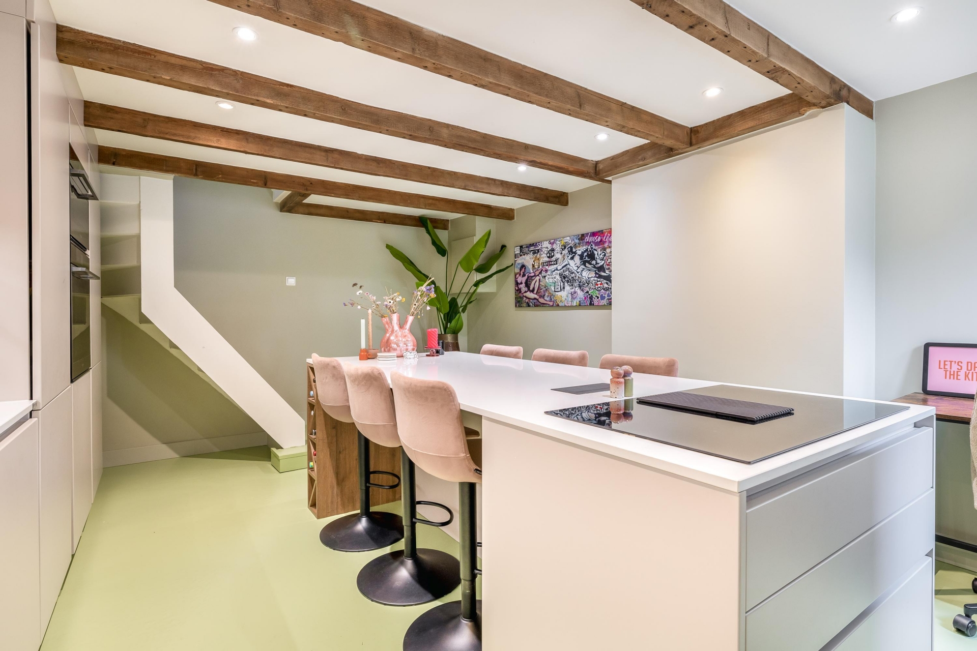 In het souterrain ligt de keuken en dat is niet zomaar een keuken. Dit is de plek waar het leven zich afspeelt. Het kookeiland nodigt uit om aan te schuiven, een glas wijn in te schenken en bij te praten terwijl er wordt gekookt. Lange avonden aan tafel, spontane etentjes en spelletjesavonden. De keuken (2022) is voorzien van alle gemakken: inductie kookplaat met geïntegreerde afzuiging, vaatwasser, koel-vriescombinatie, combi-oven, oven en Quooker. De keuken is voorzien van comfortabele vloerverwarming.