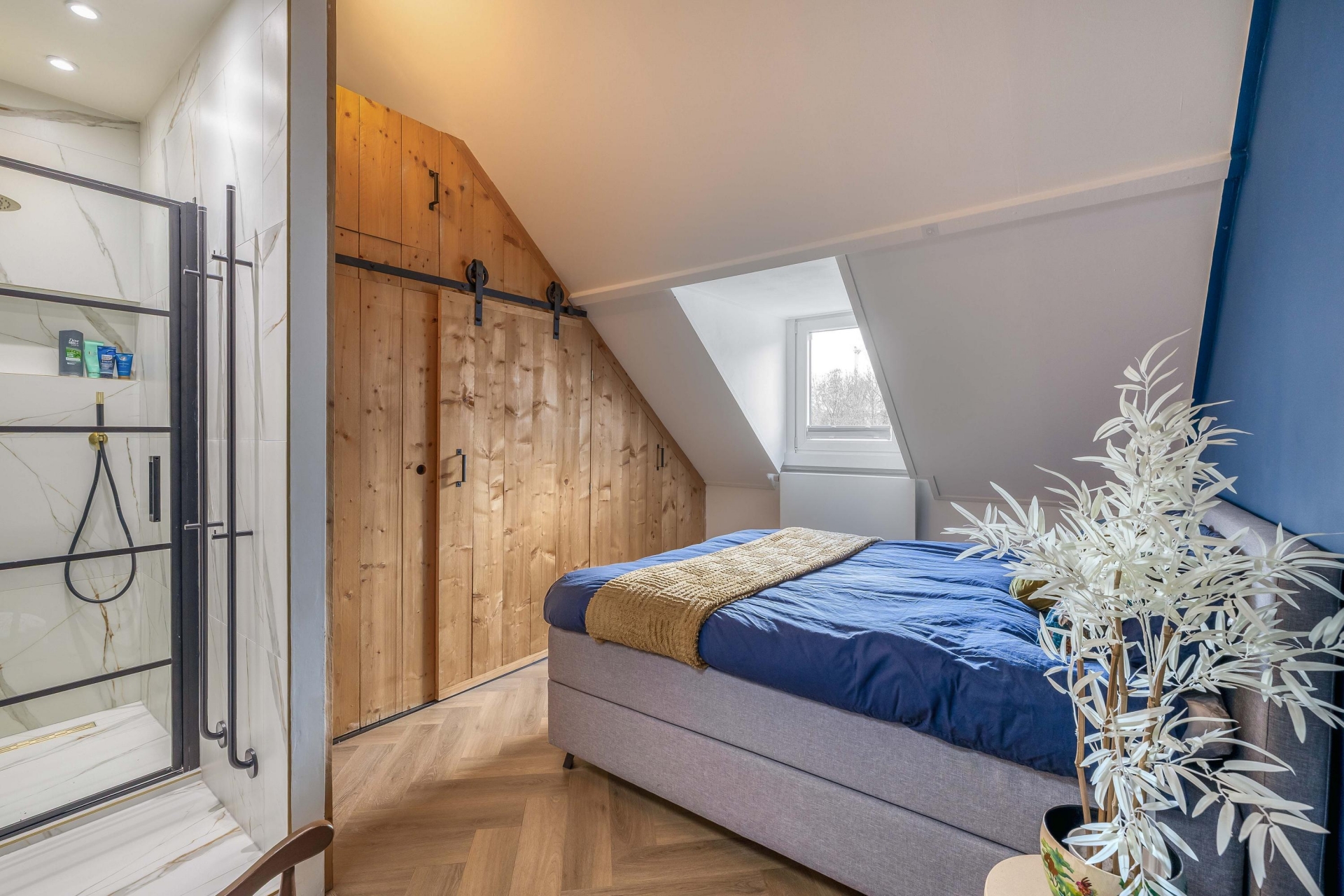 Op de 1e verdieping vind je de slaapkamer en badkamer. De slaapkamer voelt rustig en comfortabel. Dit is een heerlijke plek om je terug te trekken en op te laden. In de slaapkamer bevinden zich vaste kasten, met ruimte voor de wasmachine en CV-ketel. Alles is hier gericht op comfort, precies wat je zoekt in je eerste eigen huis.