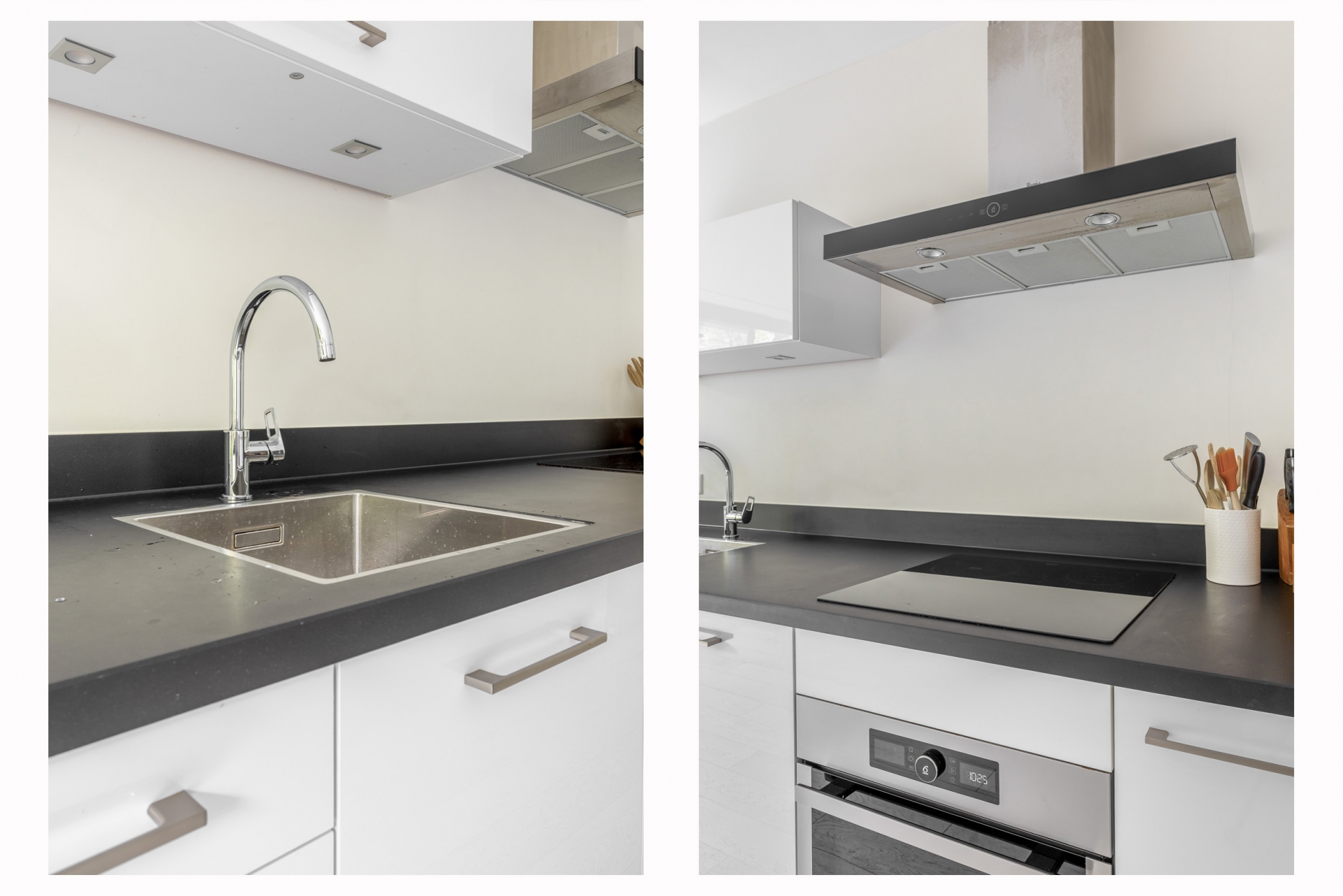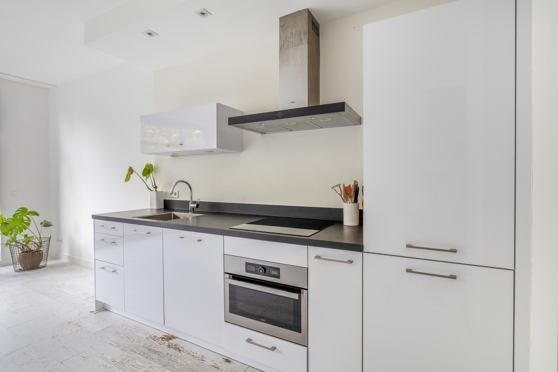 De open keuken is strak afgewerkt en uitgerust met diverse inbouwapparatuur, waaronder een 4-pits gasfornuis, vaatwasser, magnetron en afzuigkap. Vanuit de woonkamer geven de openslaande deuren toegang tot de diepe, rustig gelegen tuin op het westen – een heerlijke plek om van de middag- en avondzon te genieten.